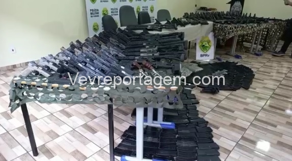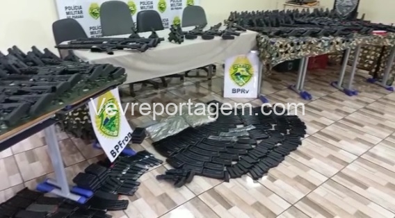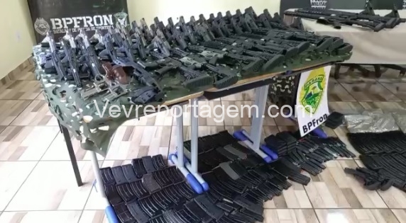Em um dos caminhões foram localizadas 93 armas de fogo, sendo 69 pistolas, 3 fuzis e 21 espingardas calibre GA12, sendo que uma destas pistolas estava municiada e carregada para uso pessoal.