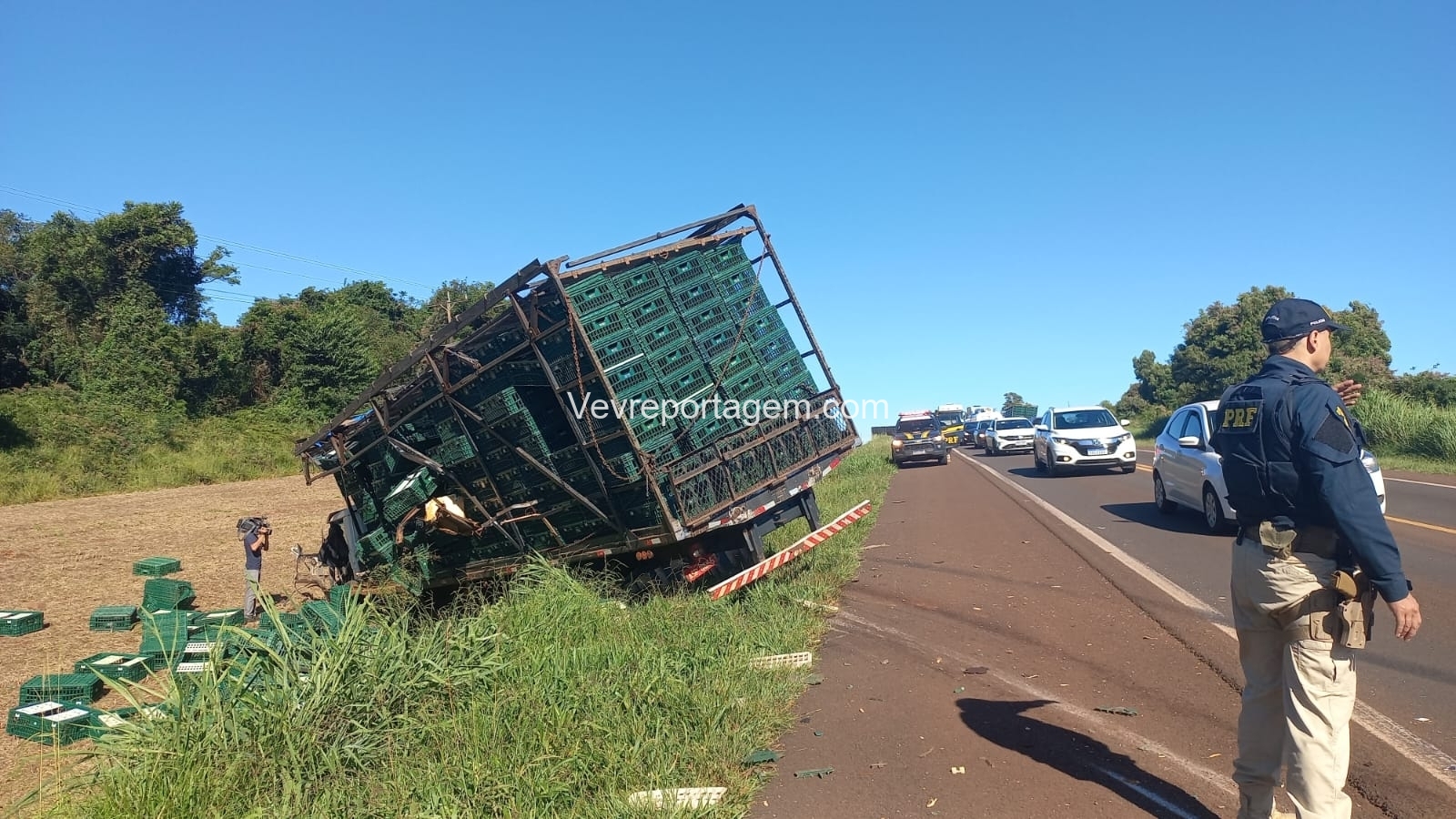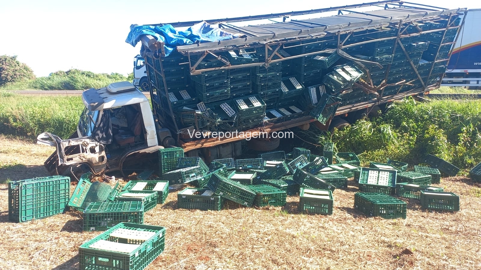 Segundo informações, dois caminhões seguiam pela rodovia em sentidos contrários, quando em determinado momento, por motivos desconhecidos, um dos veículos acabou invadindo a pista contrária, ocasionando na colisão. Após a batida, cada caminhão jogou o veículo para um lado da pista, sendo que um deles, que transportava caixas de transporte de frango, acabou caindo de bico em uma pequena elevação.