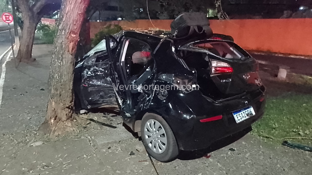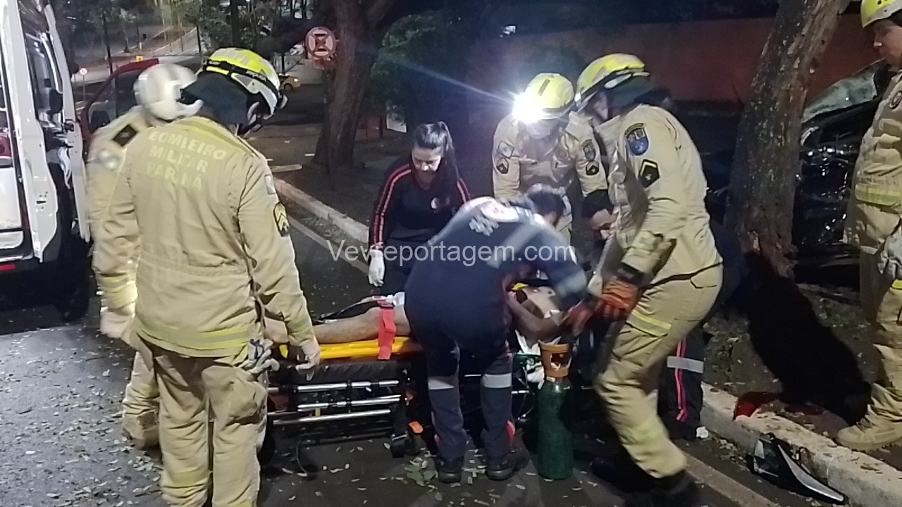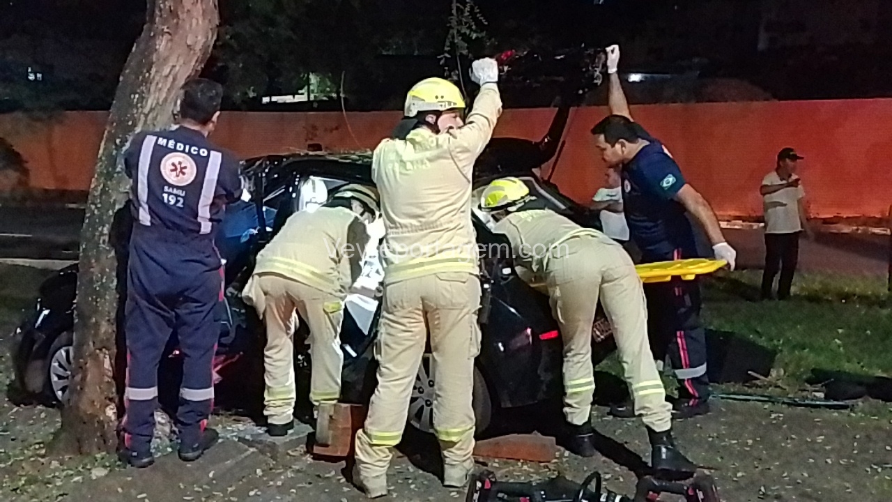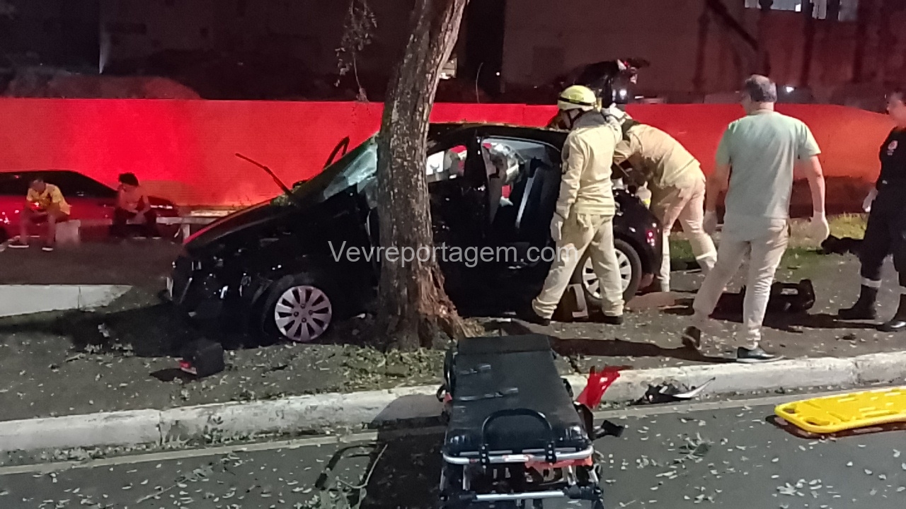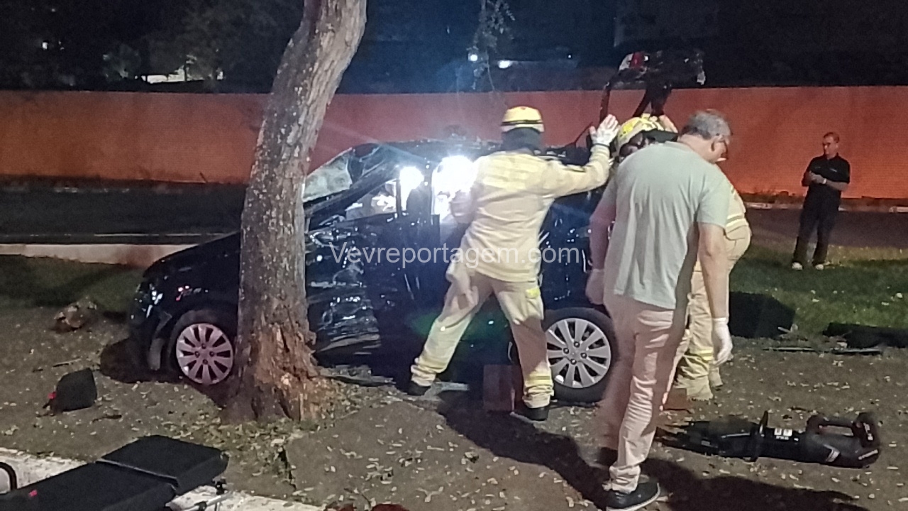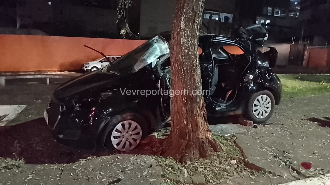 Na madrugada desta sexta-feira (19), um grave acidente de trânsito foi registrado na Avenida JK, nas proximidades da antiga Caixa Econômica. Um automóvel HB20 com três ocupantes perdeu o controle e colidiu violentamente contra uma árvore.