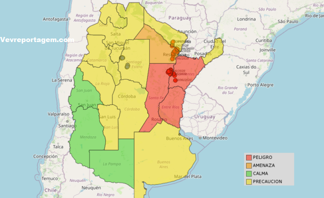 No início da semana, o Senasa publicou um alerta para uma nuvem de gafanhotos que se deslocava em direção ao Brasil. No mapa de acompanhamento, era possível ver uma faixa vermelha que representava ‘perigo’. Regiões da fronteira oeste do Rio Grande do Sul estavam no alerta dos argentinos.