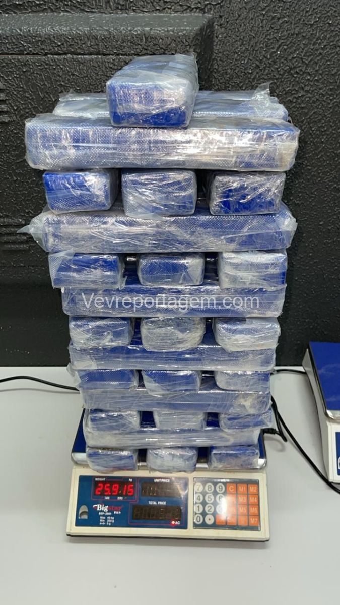 Durante a abordagem, com o apoio da cadela farejadora Daia, os policiais localizaram 25,915 kg de substância análoga à maconha escondidos em bagagens. Através do ticket de identificação, foi possível identificar o proprietário da droga: um homem de 27 anos.