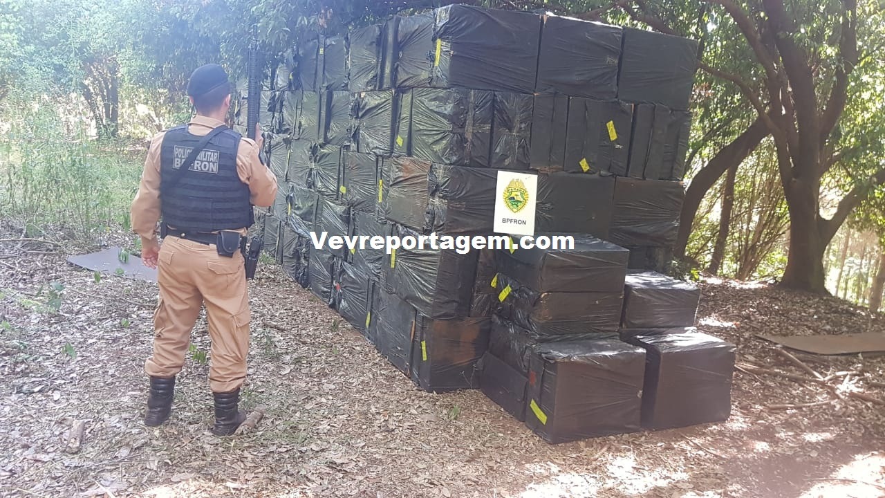 Ao verificar o veículo foi constatado que estava carregado de cigarros de origem estrangeira, nas proximidades foi localizado um depósito com aproximadamente 410 caixas de cigarros, após verificação do número do chassi foi constatado que tratava-se de um veículo roubado na cidade de Sapiranga-RS, durante entrevista, o preso relatou que teria retirado o cigarro em um porto clandestino; que receberia a quantia de 5 mil para levar a carga .