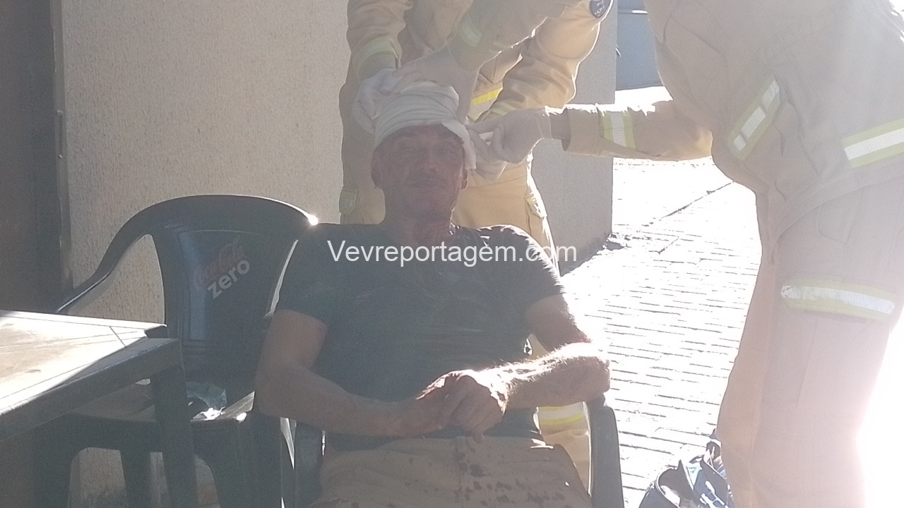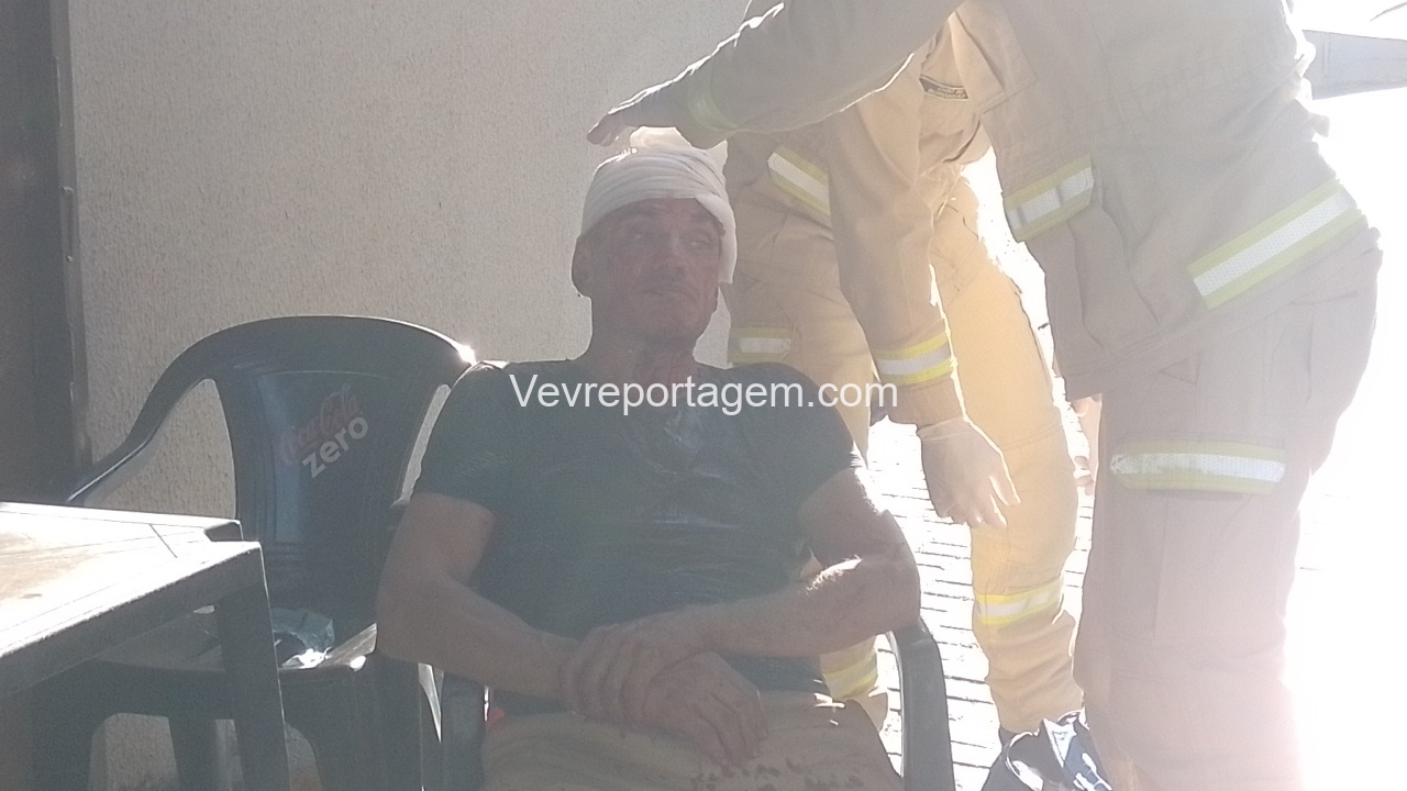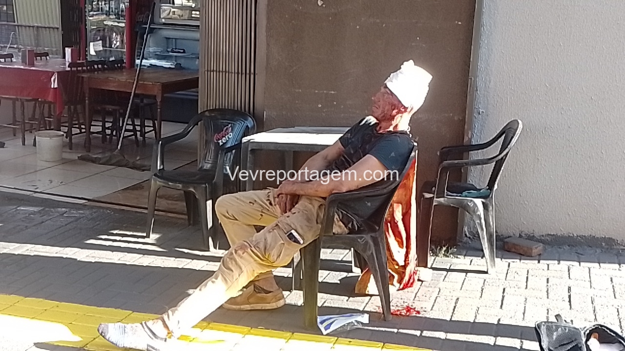 No local, foi constatada a ocorrência, onde um indivíduo estava com um sangramento na cabeça, os socorristas avaliaram o indivíduo, realizaram um curativo na cabeça do mesmo, em seguida encaminhado andando para o interior da ambulância para melhor ser avaliado.