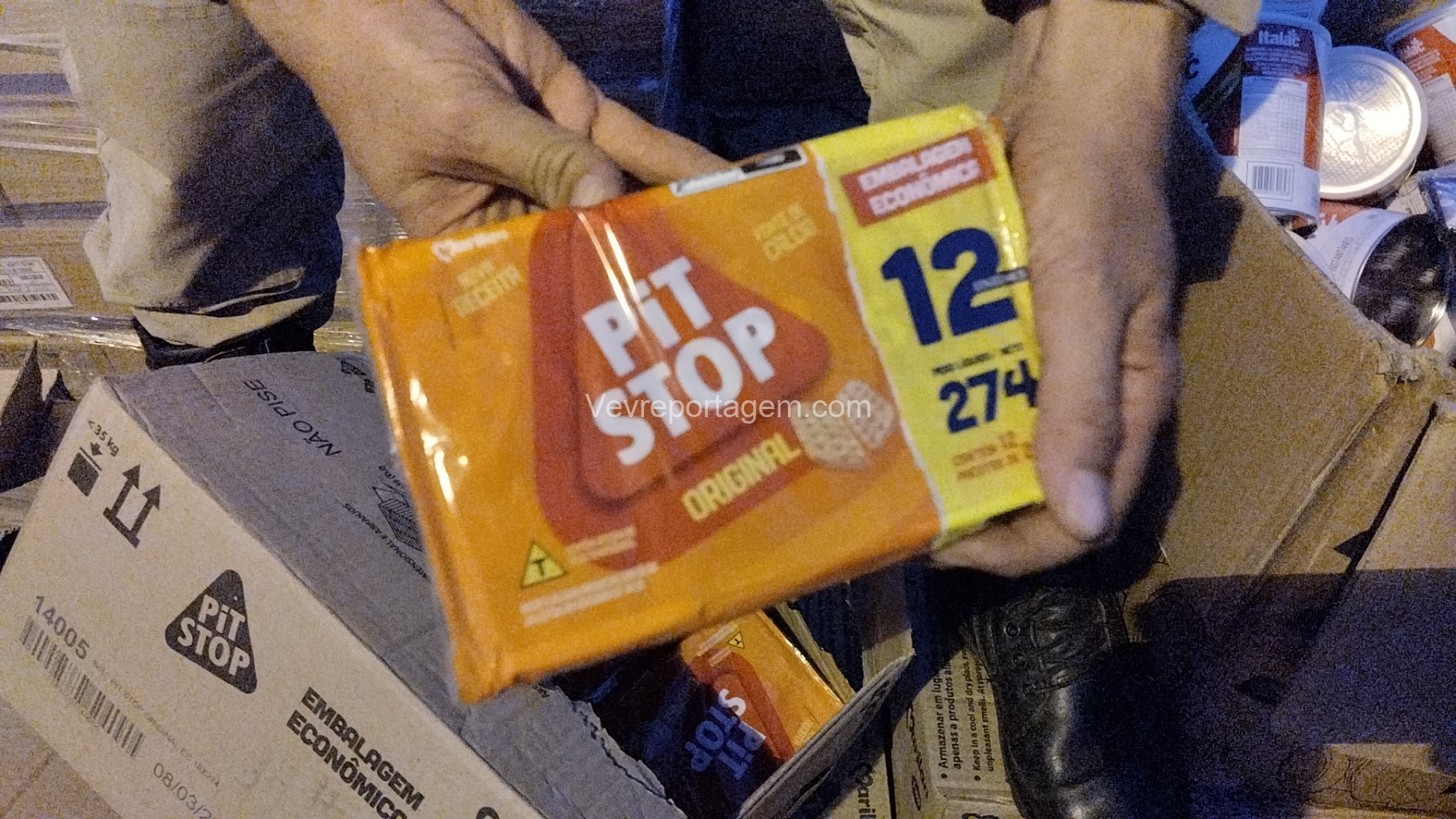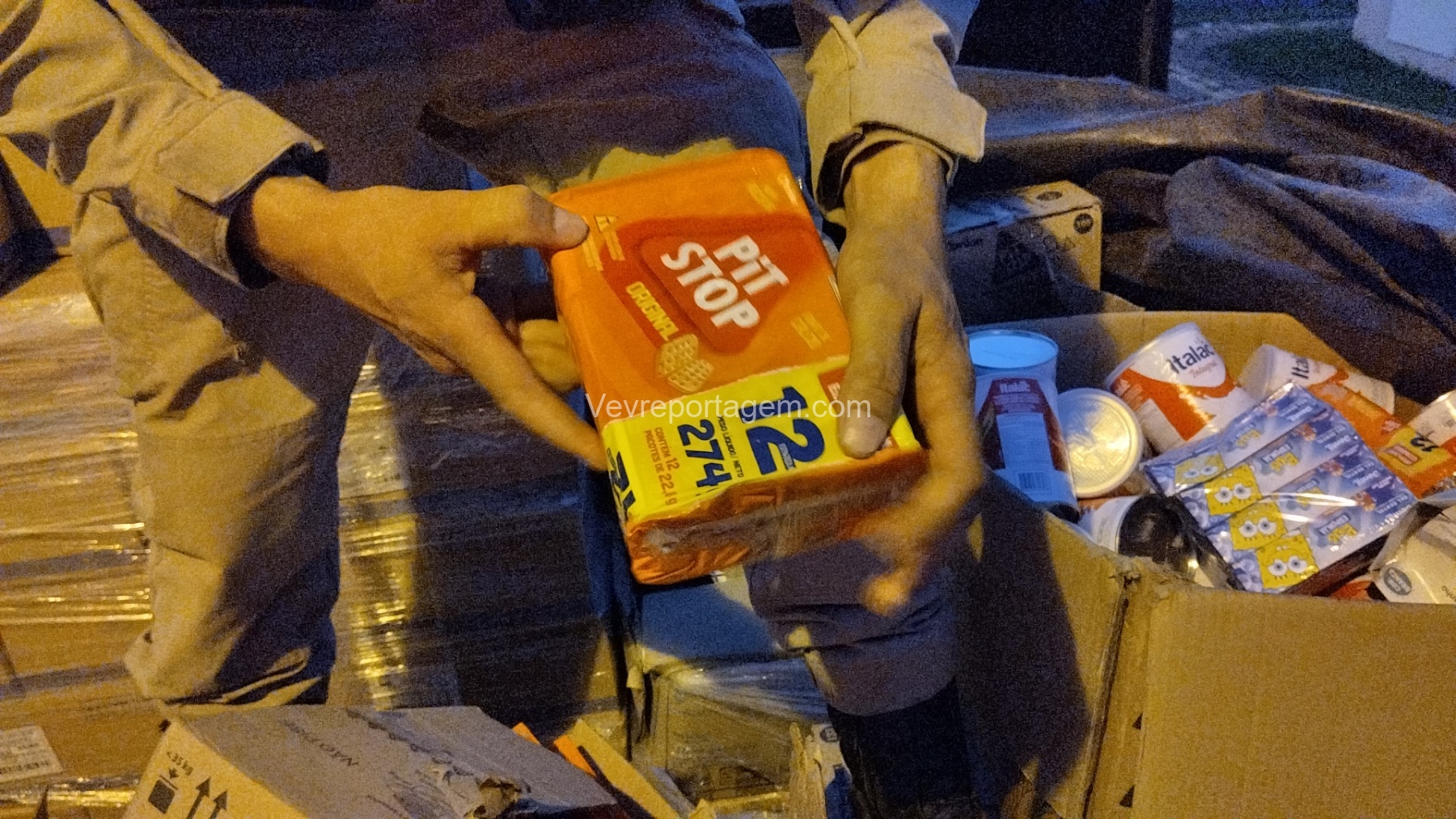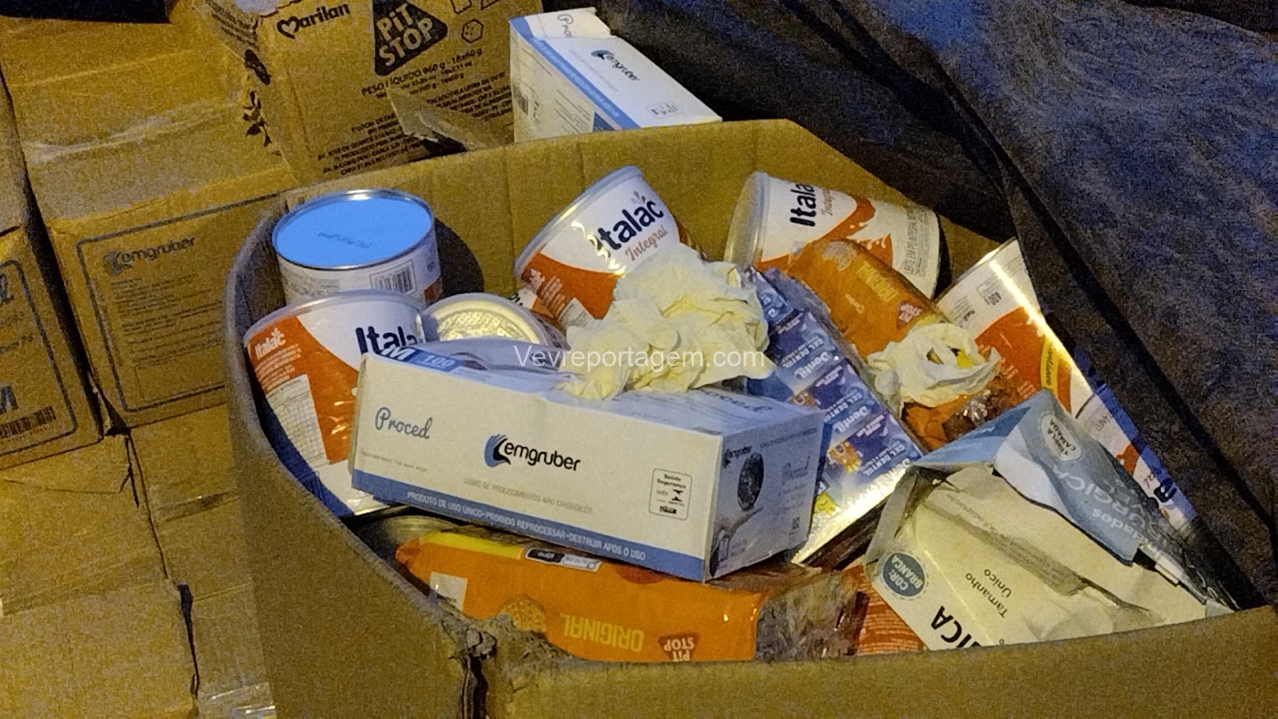 Segundo as informações repassadas no local, os produtos seriam excedentes de doações relacionadas à catástrofe que atingiu a cidade há algum tempo.