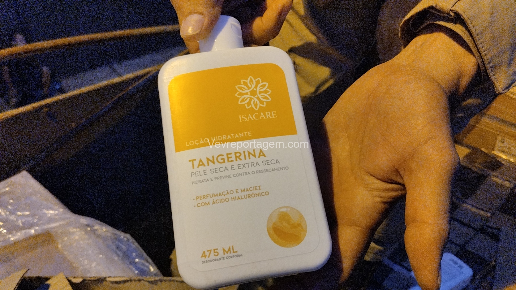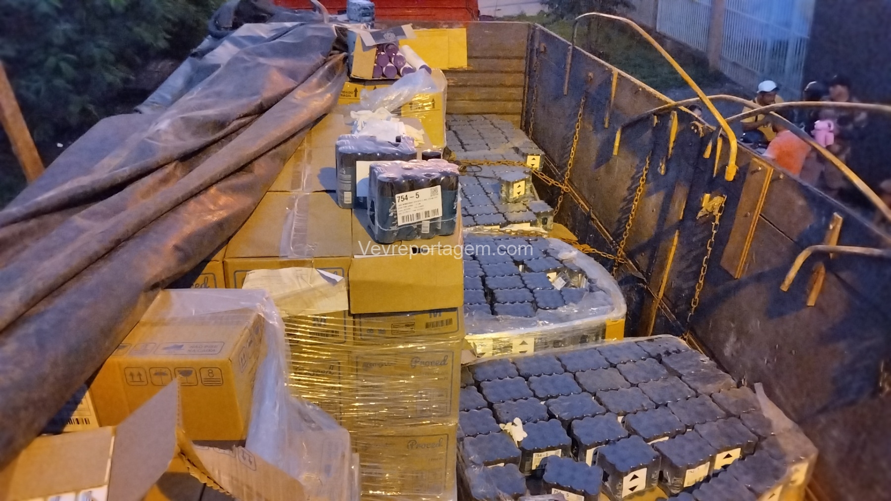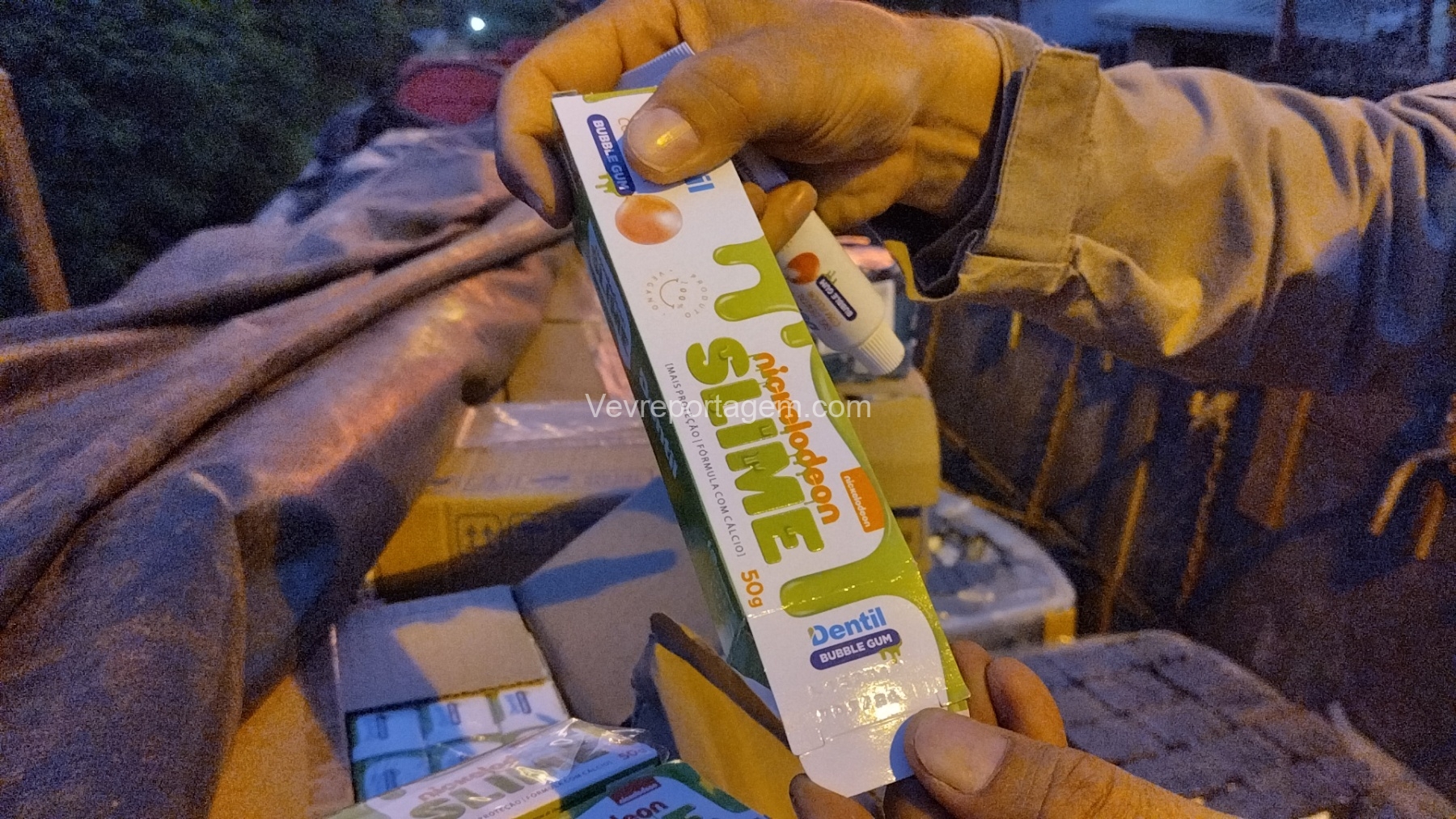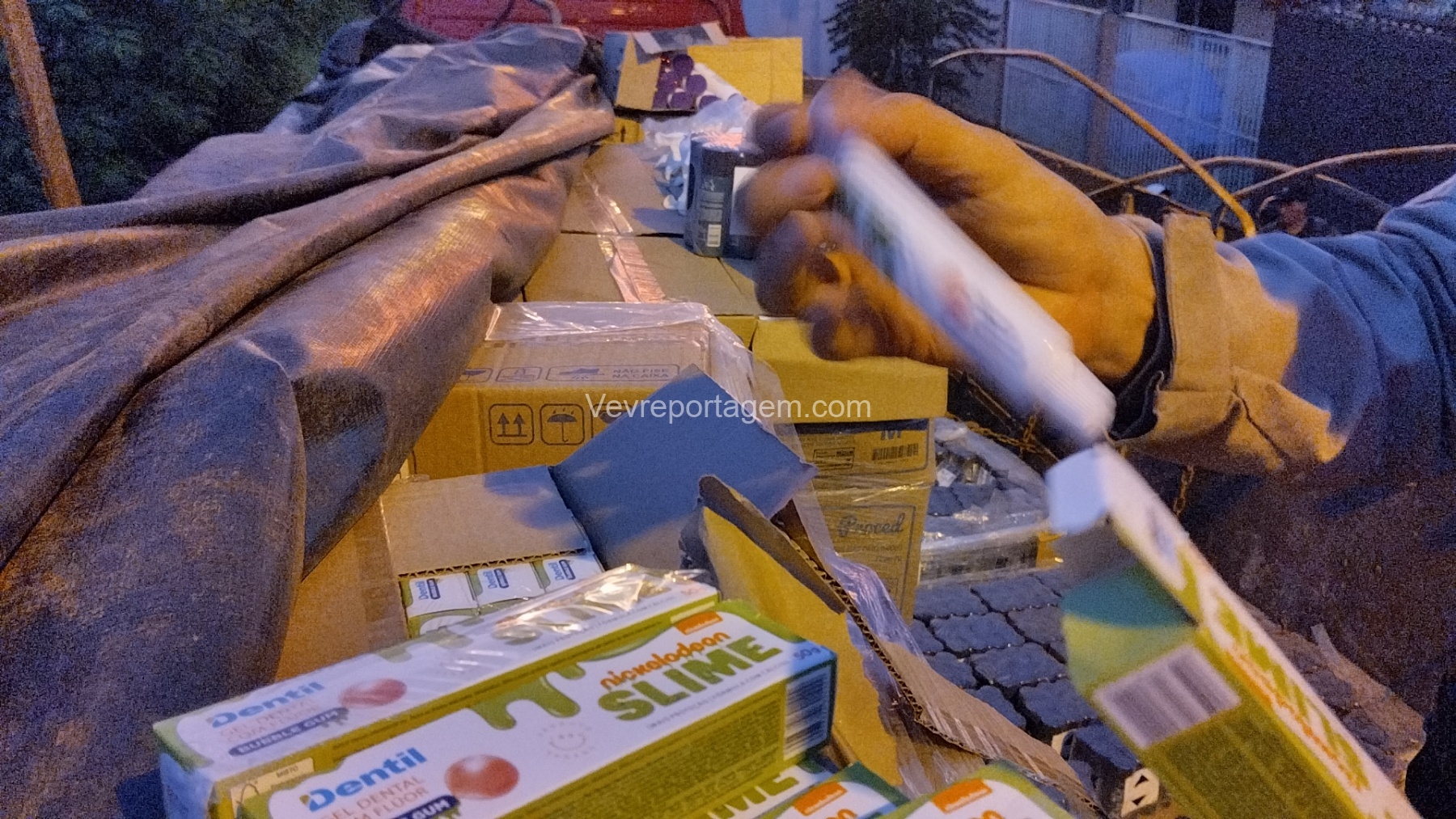 Segundo as informações repassadas no local, os produtos seriam excedentes de doações relacionadas à catástrofe que atingiu a cidade há algum tempo.