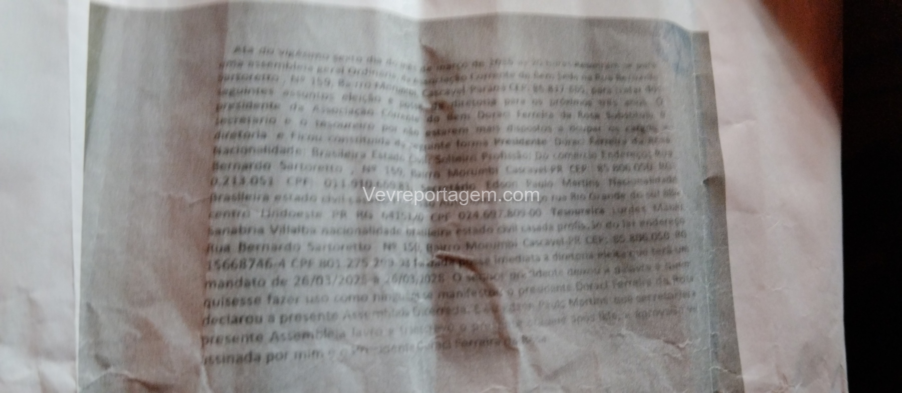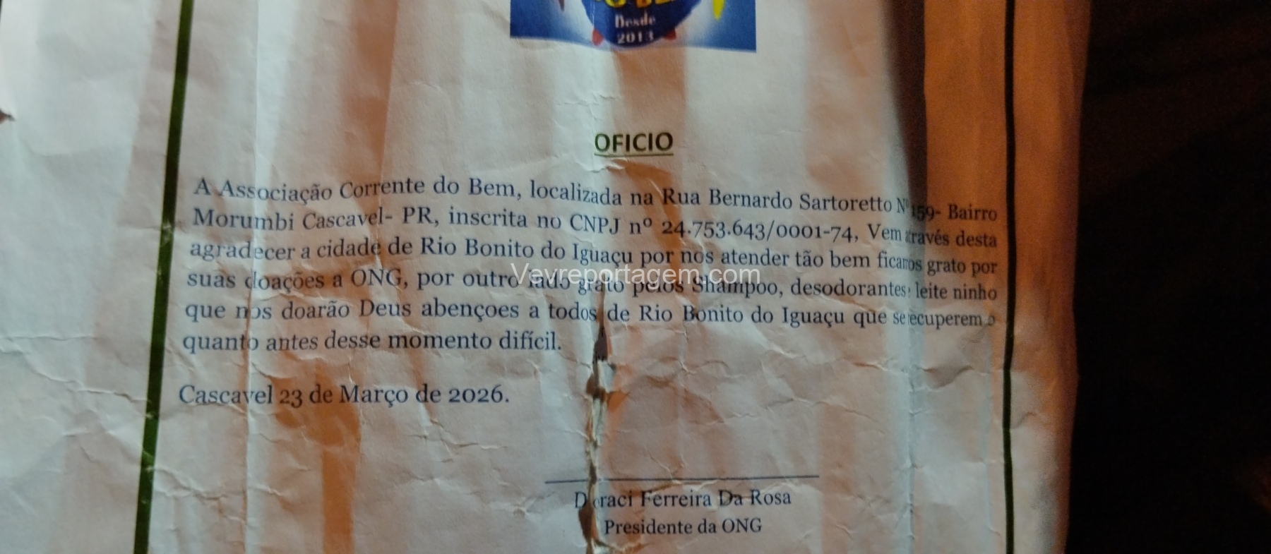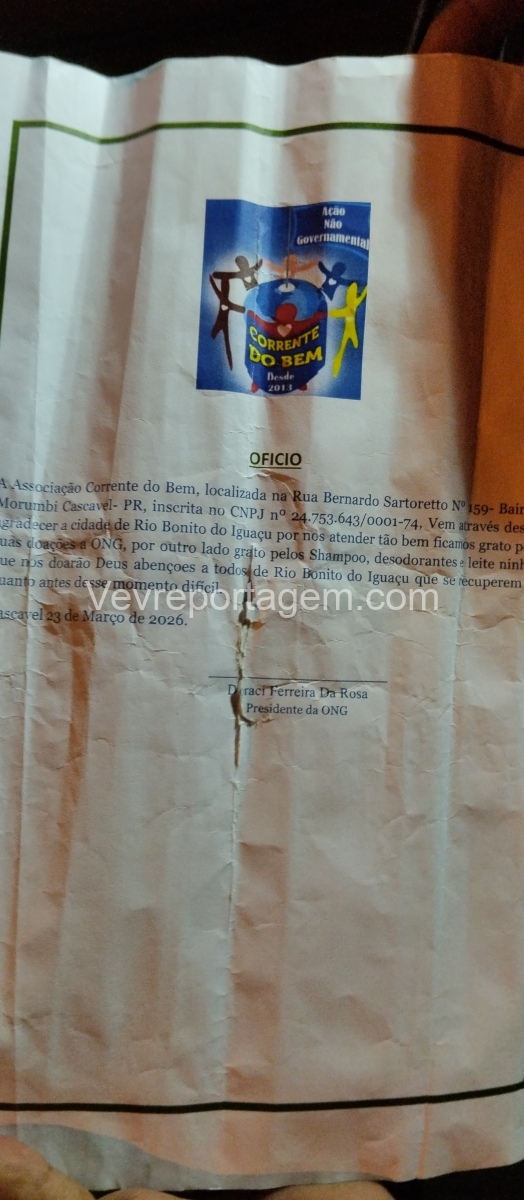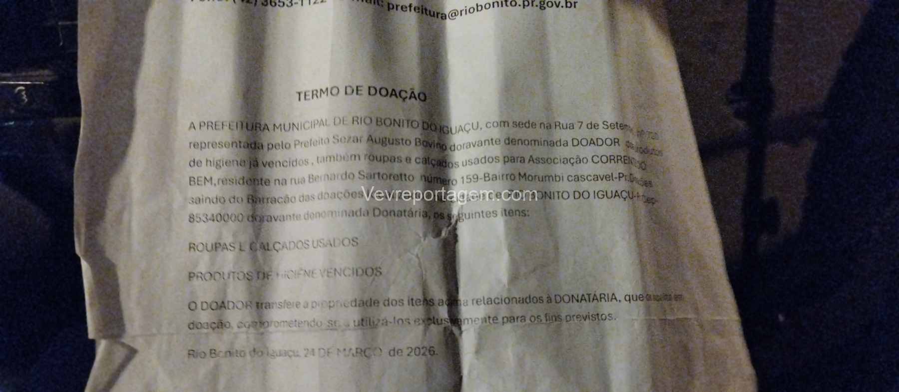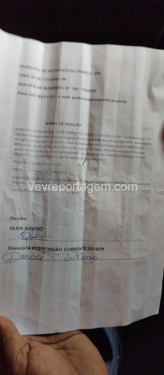 O responsável também afirmou que a doação foi autorizada pelo prefeito e pela primeira-dama do município de Rio Bonito do Iguaçu.