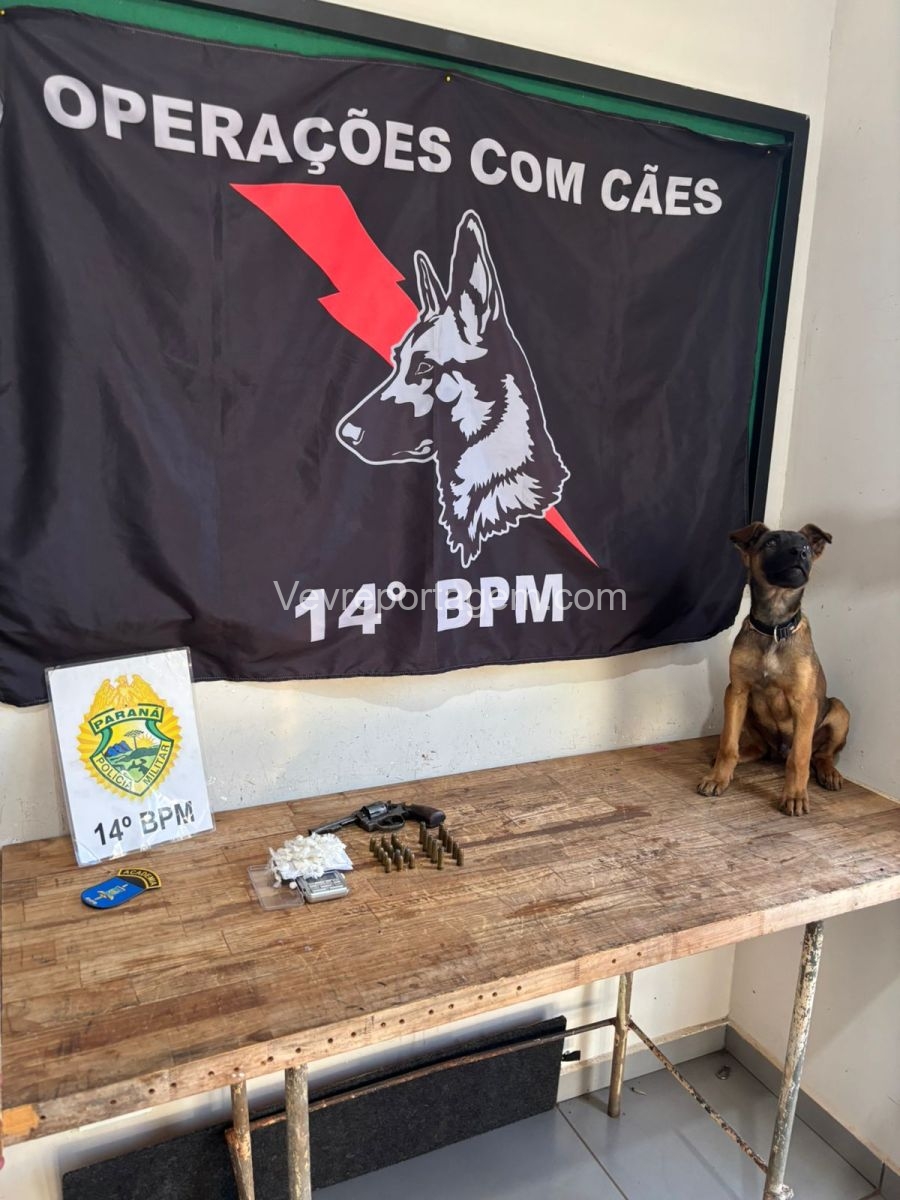 A operação, que contou com o apoio do cão de faro K9 Nero, resultou na localização de uma arma de fogo, 25 munições de calibres variados, um carregador de pistola e 60 buchas de cocaína, totalizando aproximadamente 19 gramas da droga.