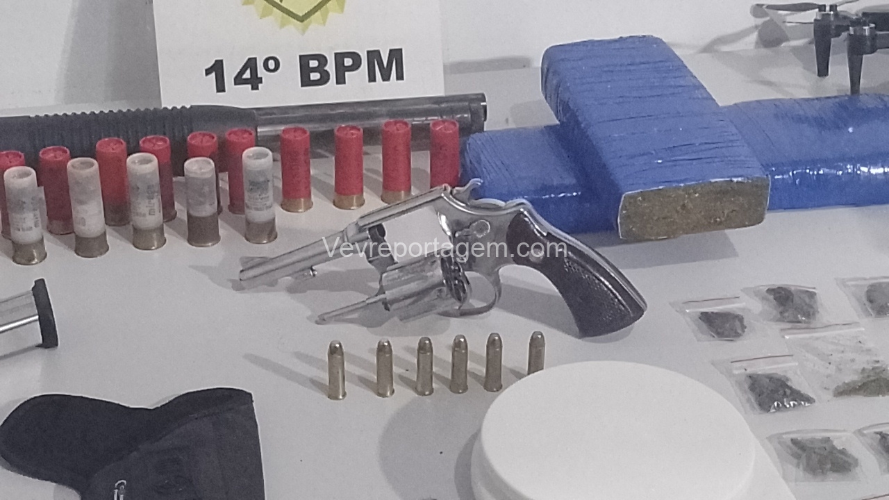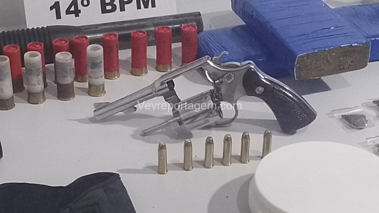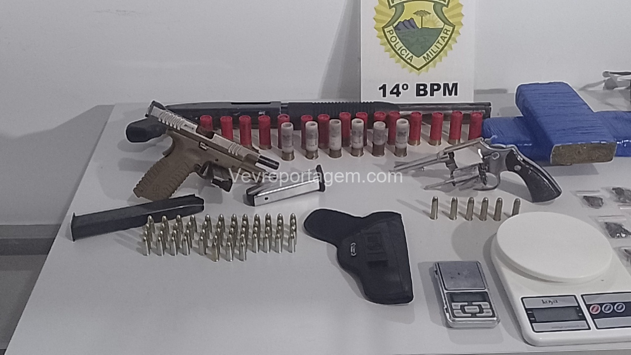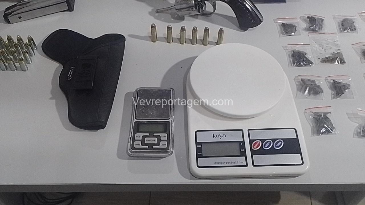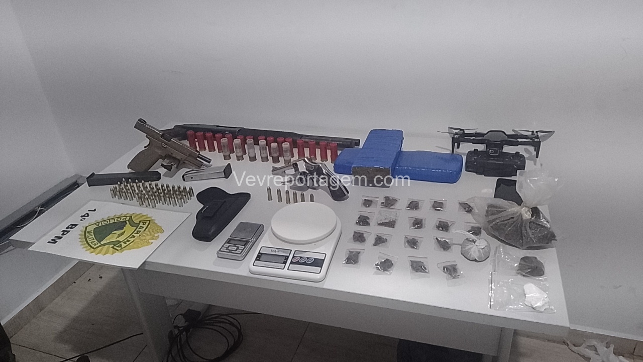 No entanto, em conversa com os policiais, o homem afirmou que mantinha armas de fogo dentro da casa. Na vistoria realizada no imóvel, os militares encontraram um verdadeiro arsenal: um revólver calibre .38, uma pistola 9mm, uma espingarda calibre 12, além de um carregador alongado com seletor de rajadas. Também foram localizados entorpecentes, como maconha, balanças de precisão, cocaína, haxixe, “capulho” e diversas munições.
