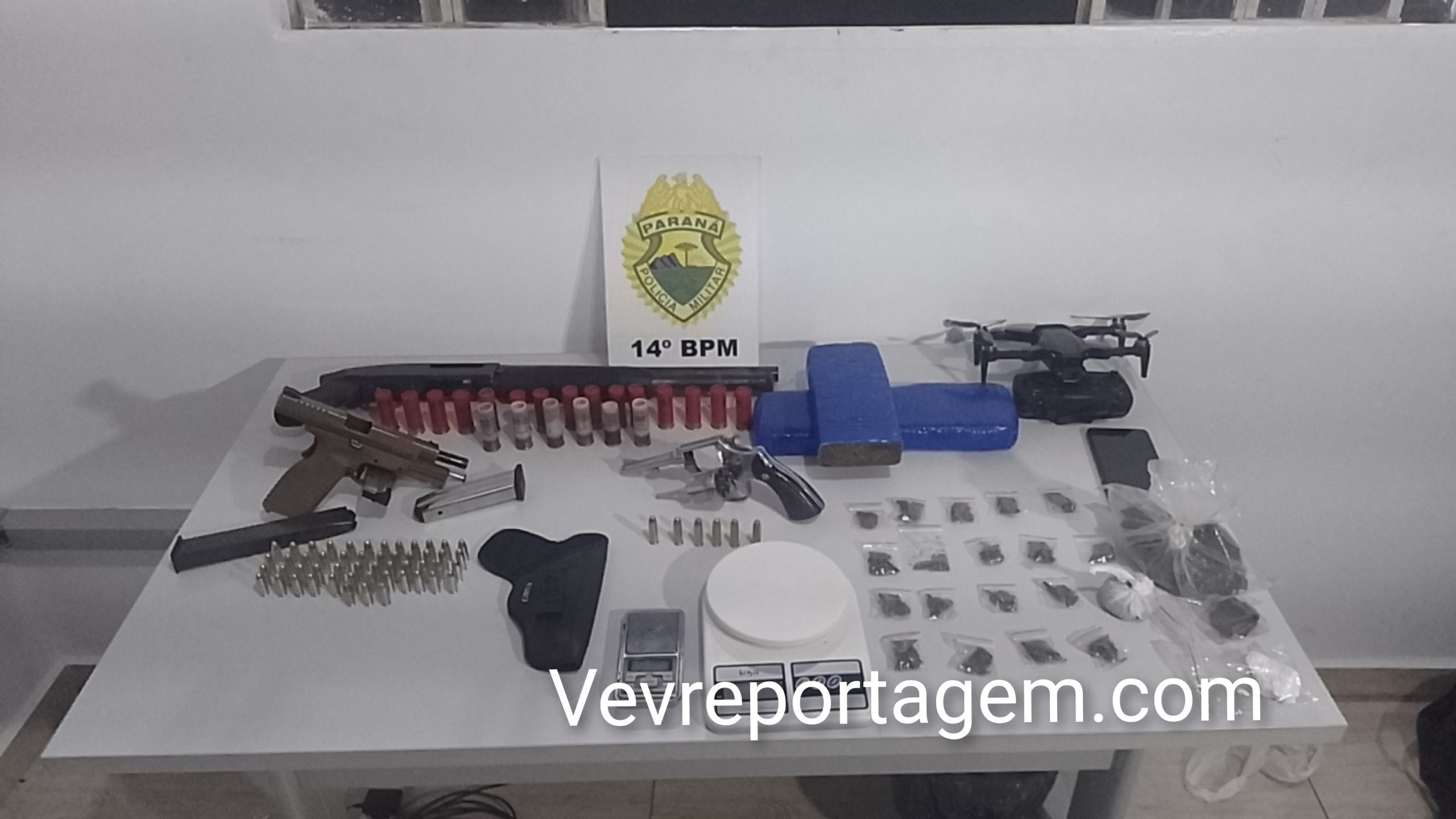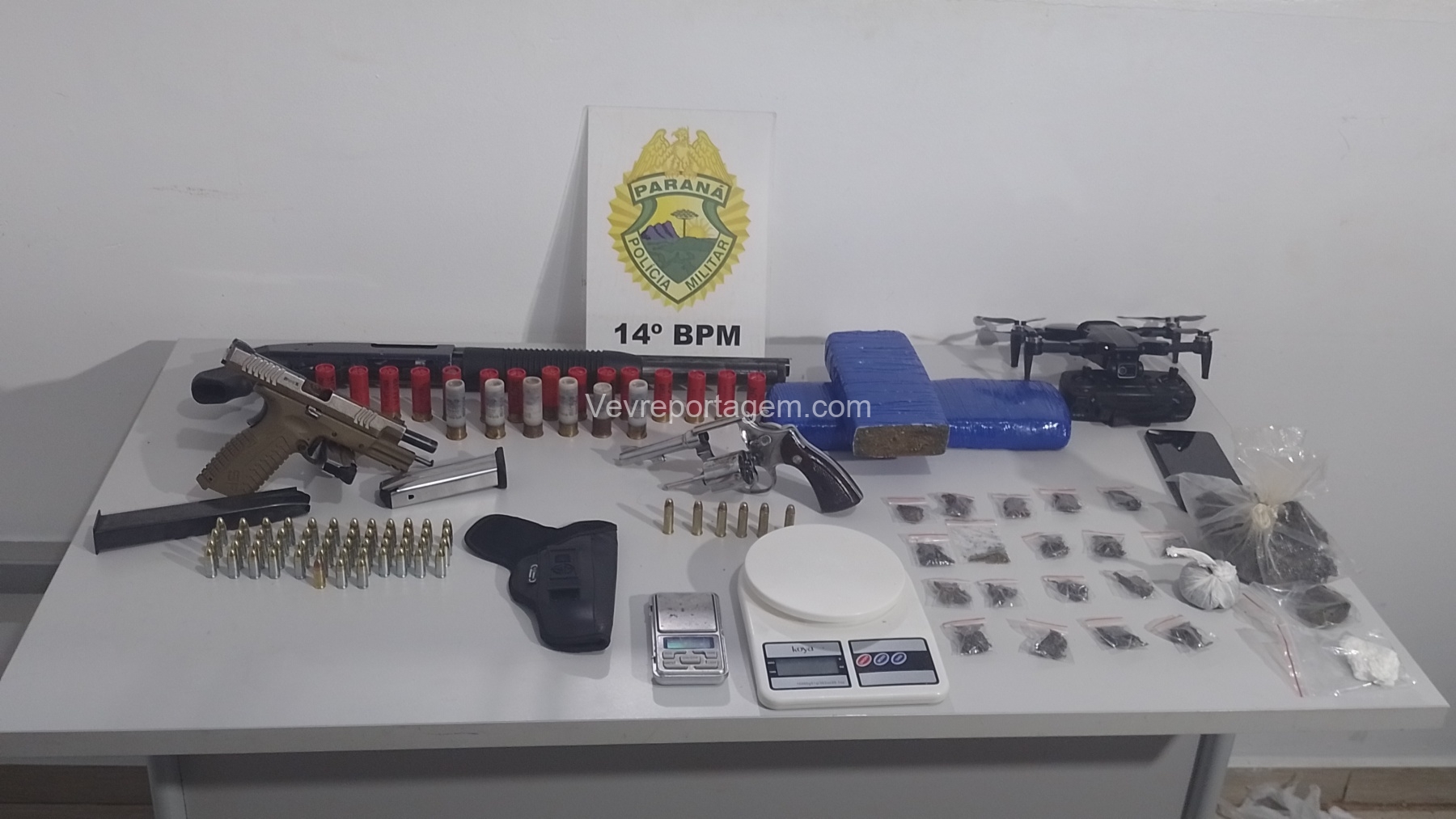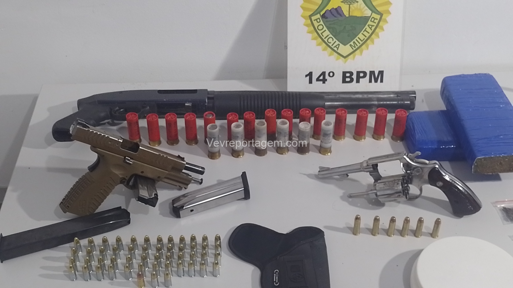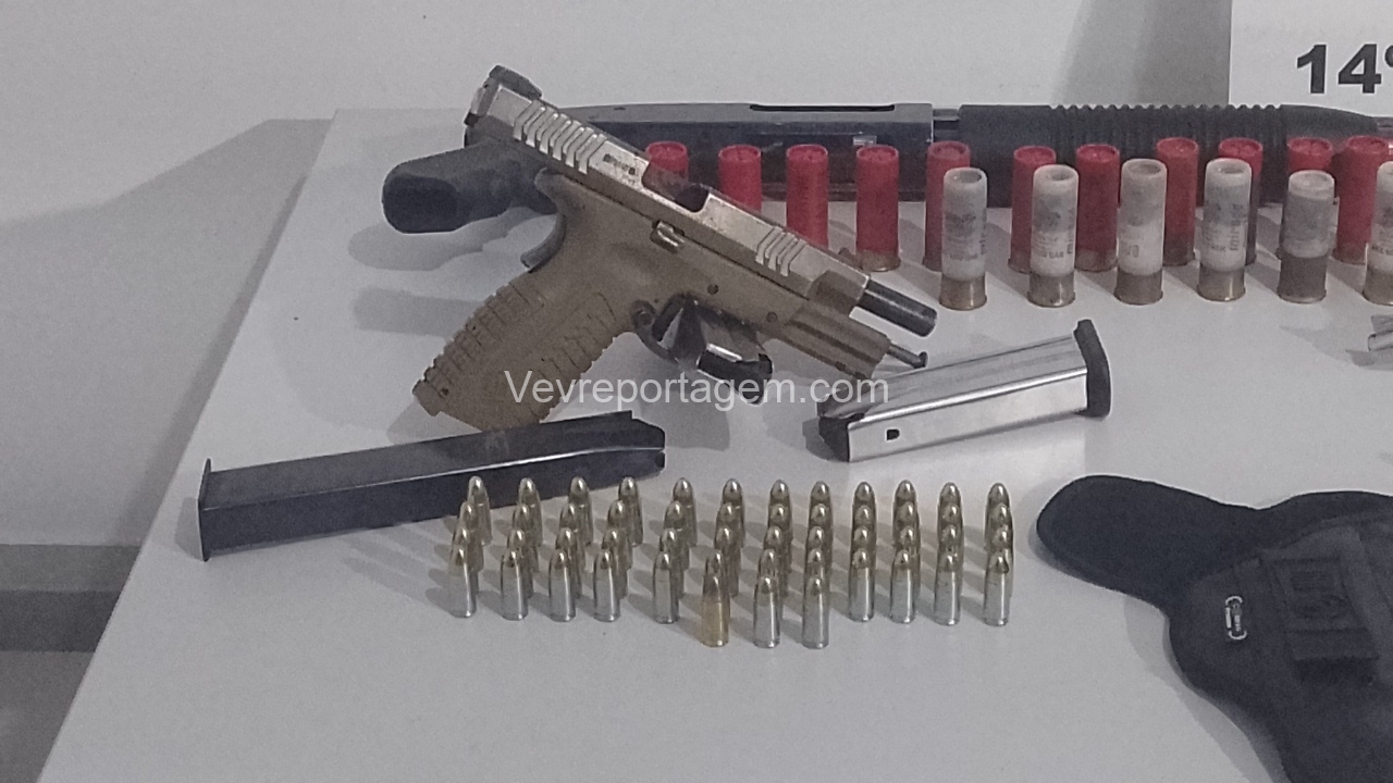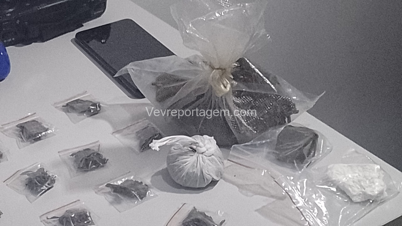 No entanto, em conversa com os policiais, o homem afirmou que mantinha armas de fogo dentro da casa. Na vistoria realizada no imóvel, os militares encontraram um verdadeiro arsenal: um revólver calibre .38, uma pistola 9mm, uma espingarda calibre 12, além de um carregador alongado com seletor de rajadas. Também foram localizados entorpecentes, como maconha, balanças de precisão, cocaína, haxixe, “capulho” e diversas munições.