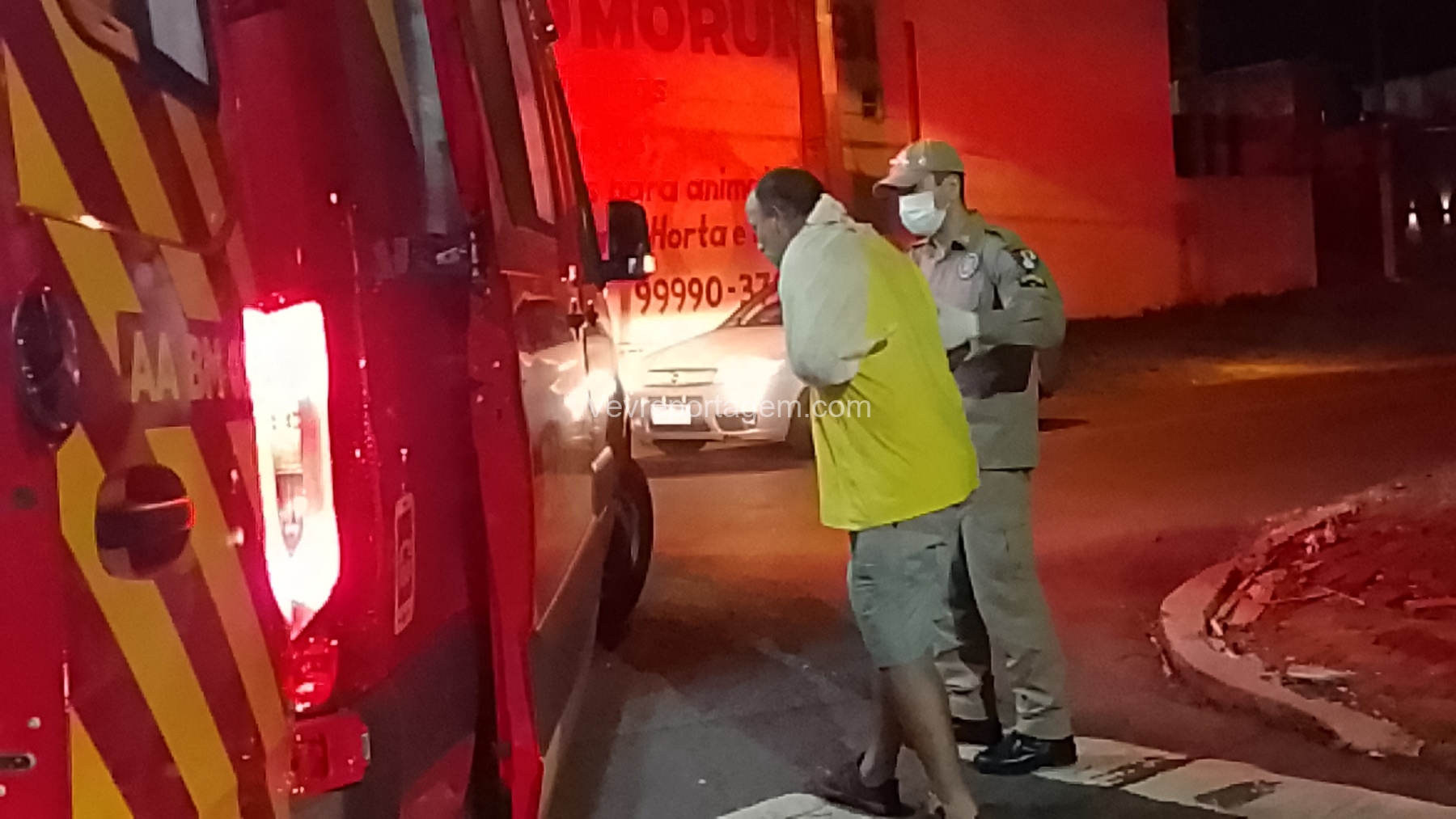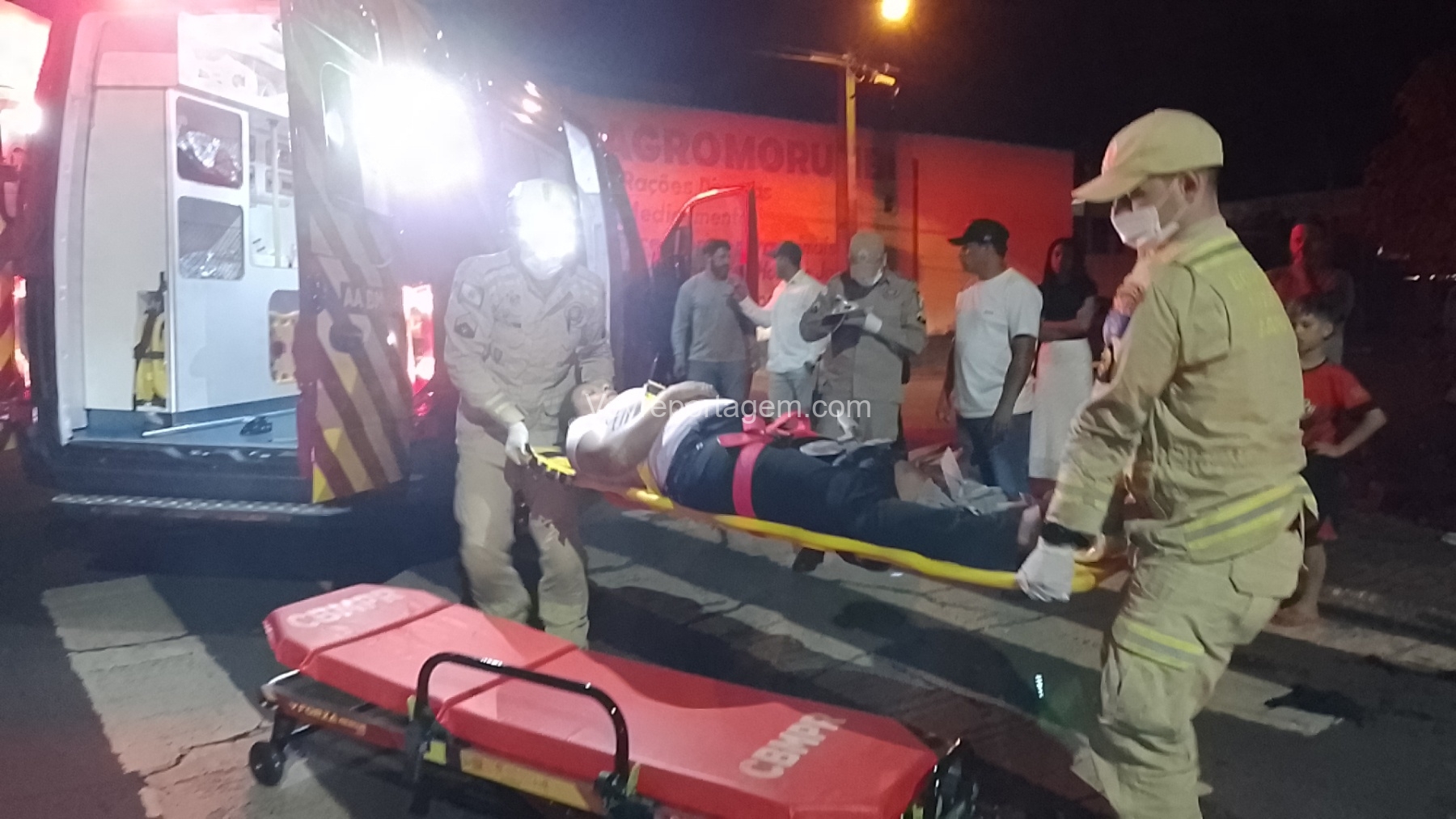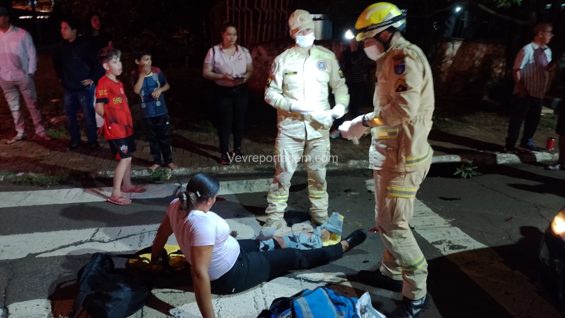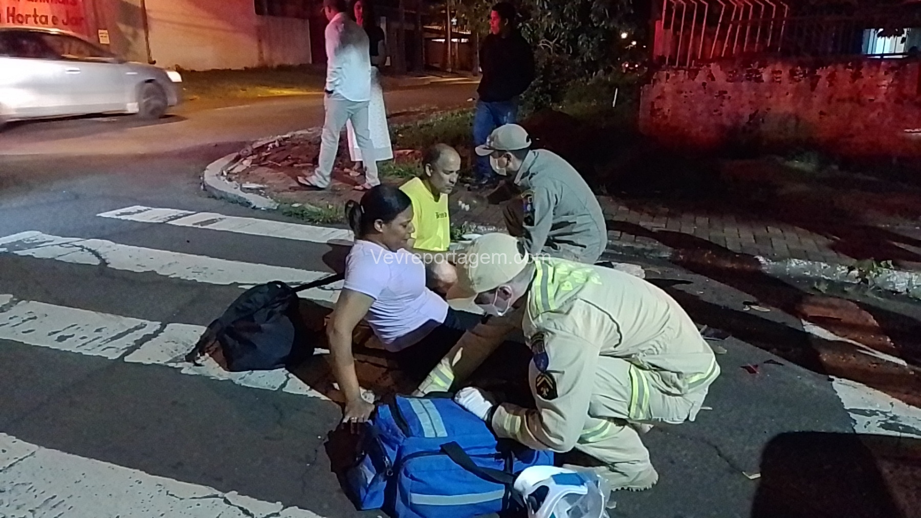 No local, foi constatada uma colisão entre um automóvel e uma motocicleta, resultando em duas vítimas, sendo um homem e uma mulher, que estavam caídos ao solo.