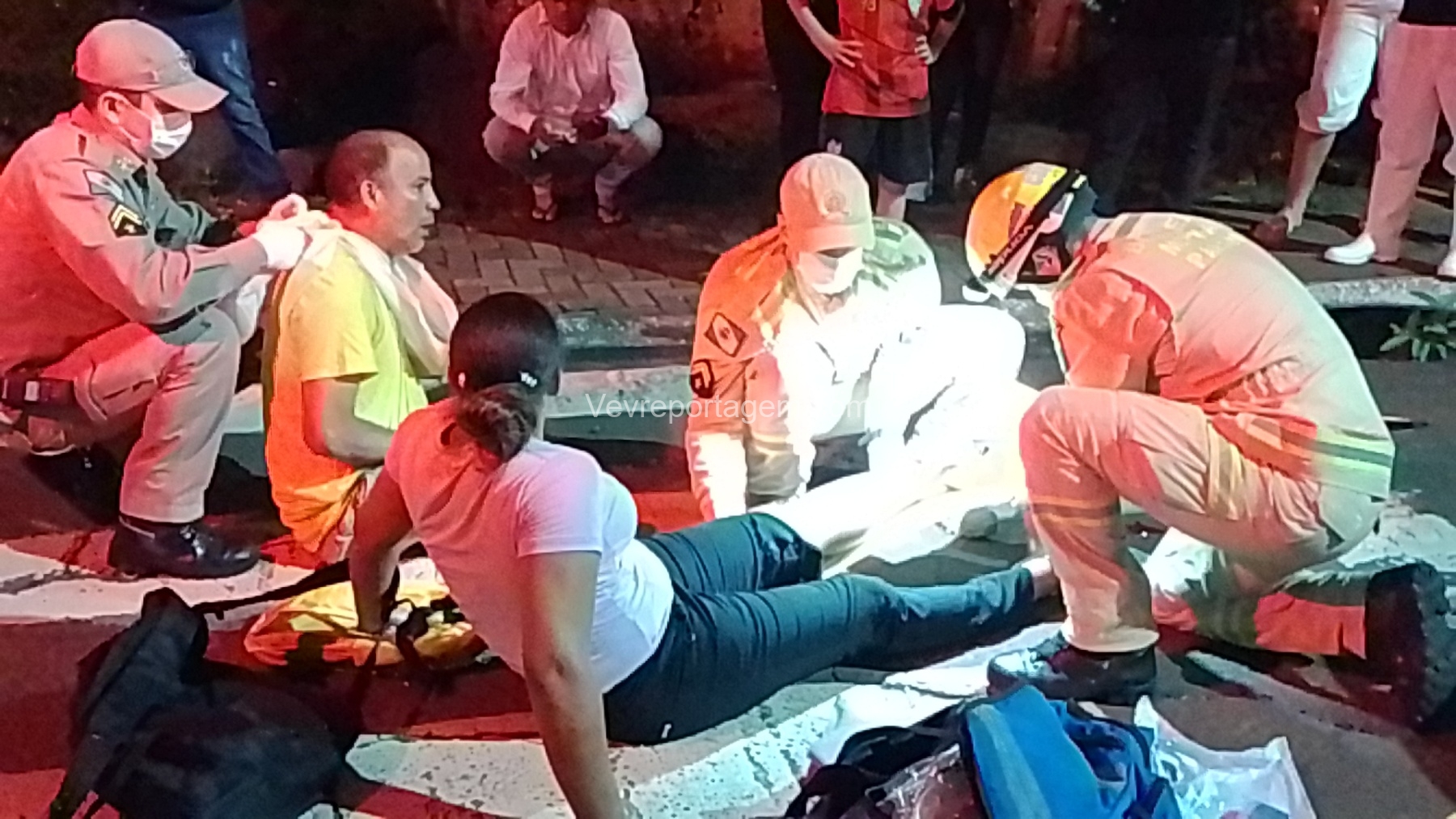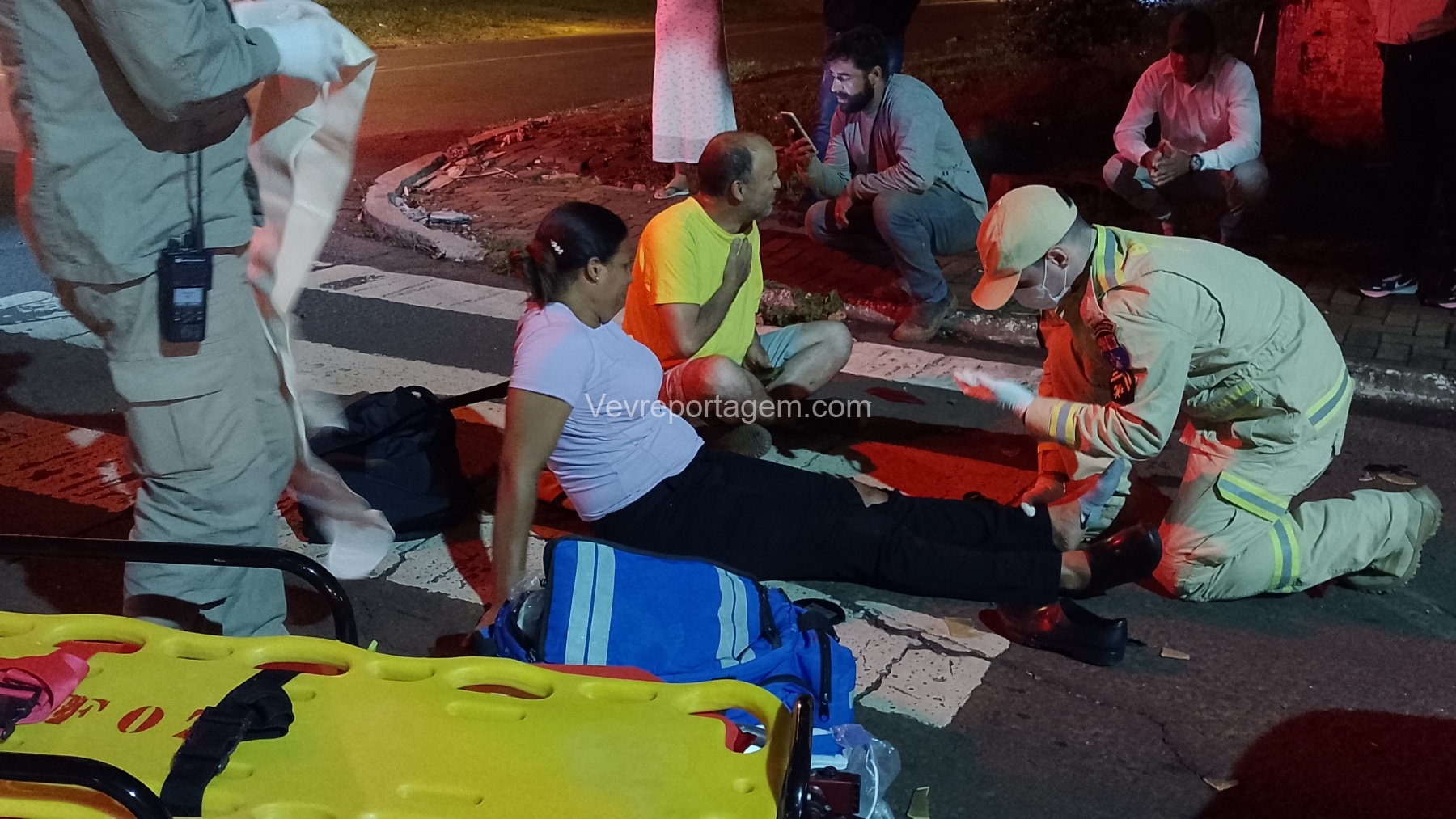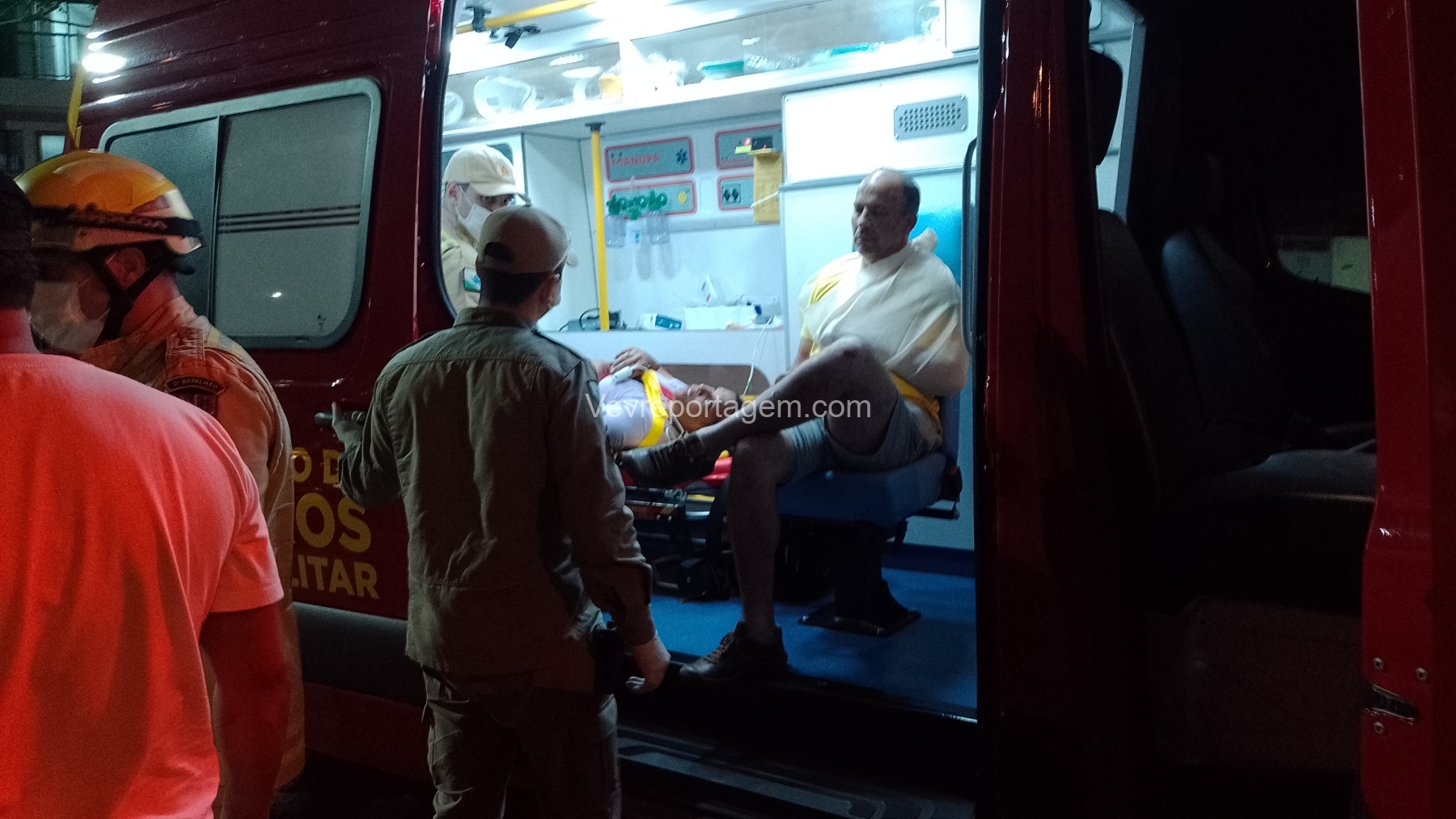 Durante o atendimento, o homem apresentava suspeita de fratura na clavícula. Ele foi imobilizado com o uso de tipóia e encaminhado, andando, até a ambulância do SIATE. Já a mulher apresentava lesões nos joelhos; ela teve a perna imobilizada, foi colocada em uma maca e encaminhada para o interior da ambulância para avaliação mais detalhada.