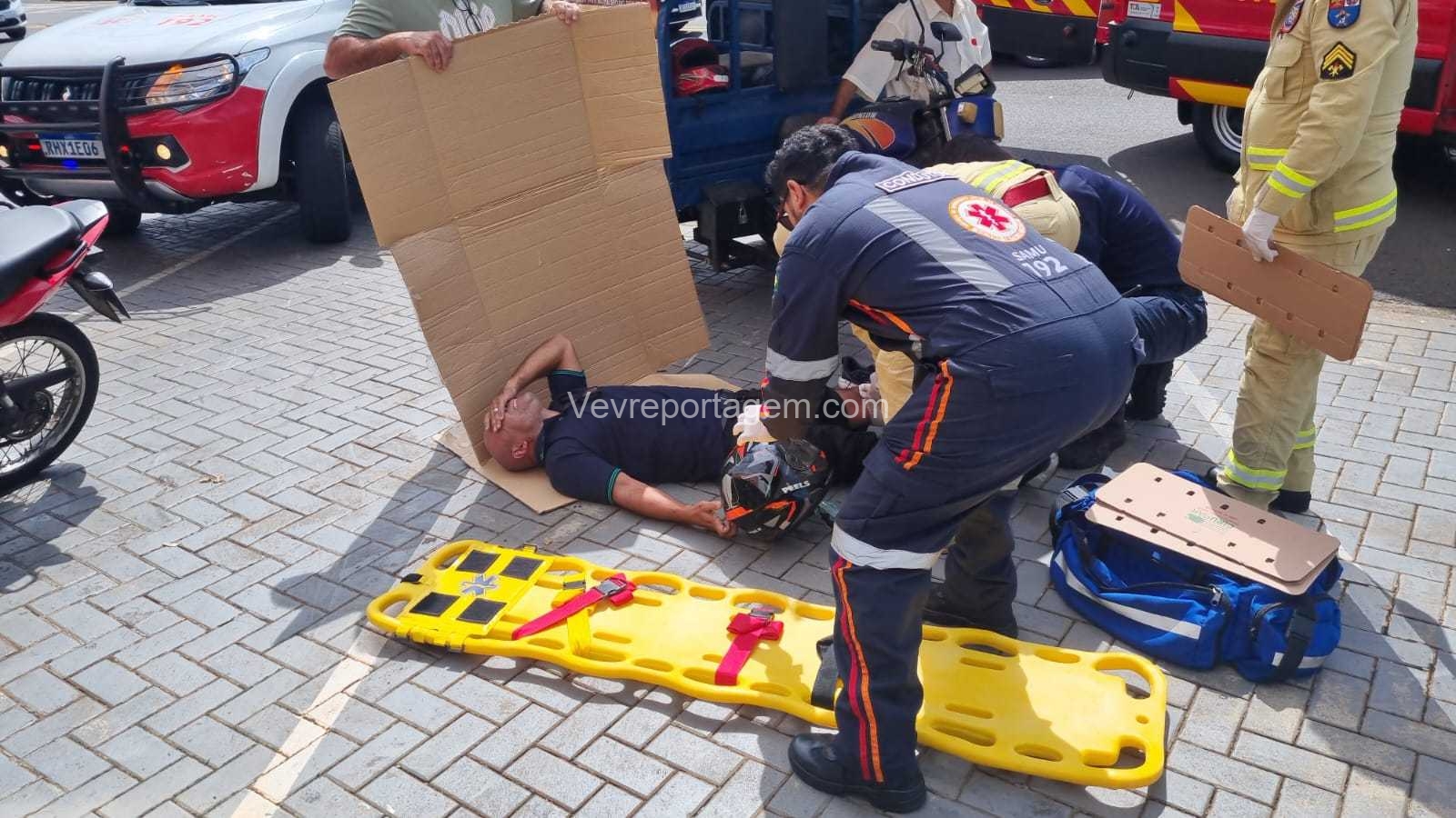 No local, foi constatada uma colisão envolvendo duas motocicletas, sendo uma delas de carga. Um dos condutores, um homem, foi encontrado caído ao solo com escoriações e suspeita de fratura em uma das pernas. Ele recebeu os primeiros atendimentos ainda no local, sendo imobilizado pela equipe de resgate.