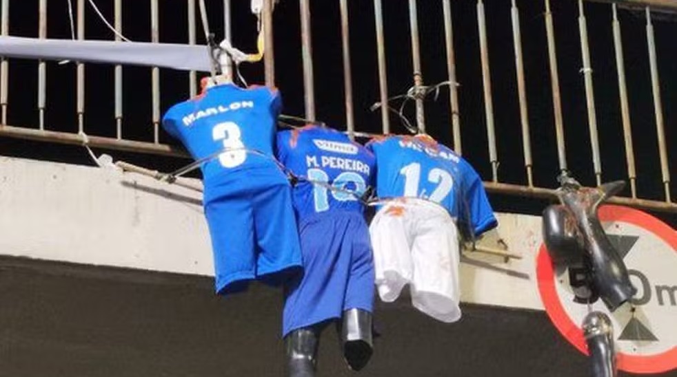 Os bonecos, com camisas levando os nomes dos três jogadores, estavam sem cabeça, com as pernas penduradas à parte e manchas em simulação a sangue. O Cruzeiro diz que acionou as forças de segurança para averiguar os fatos.