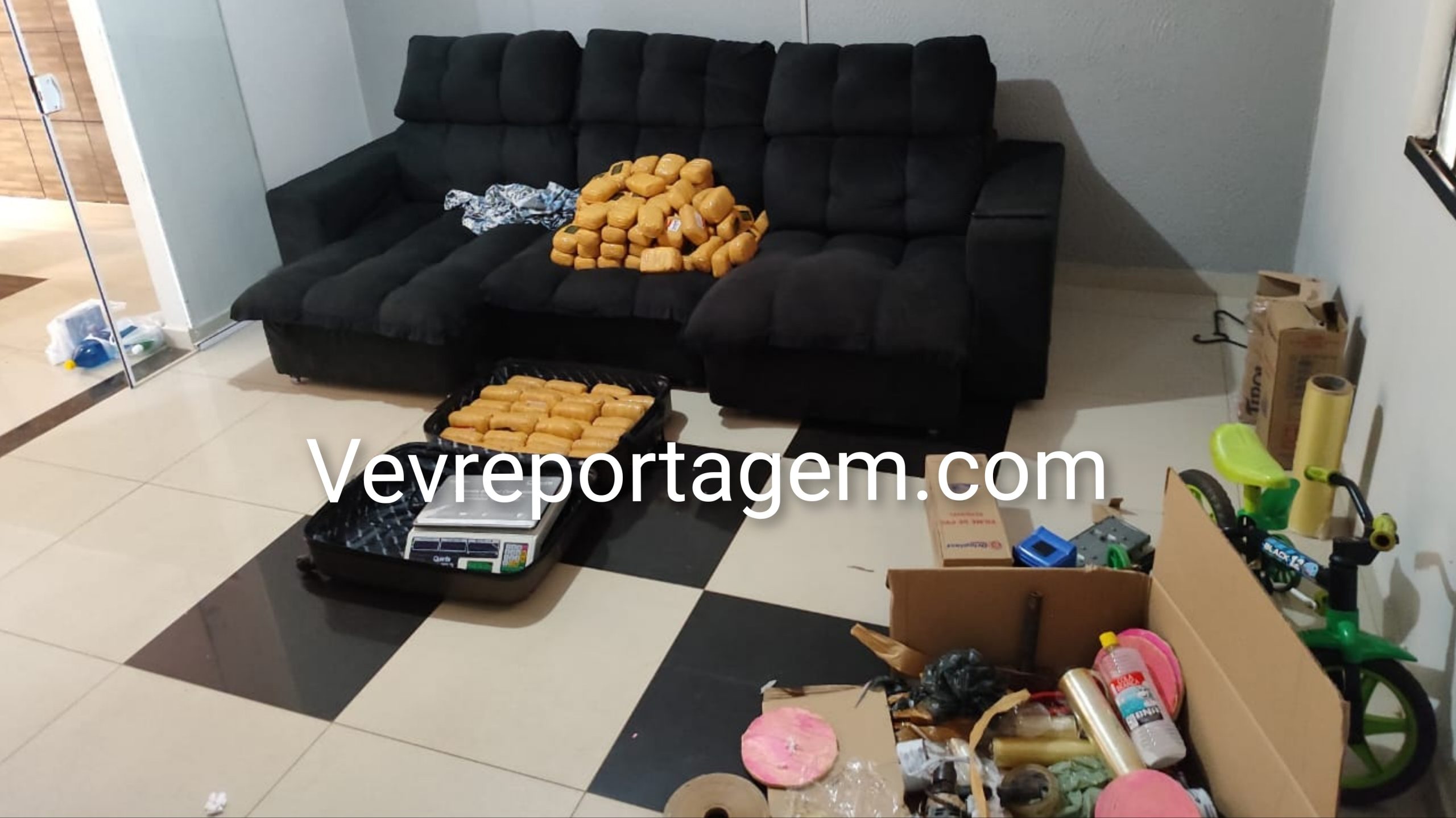 Ao entrarem na residência, os agentes ouviram barulhos no telhado. Vizinhos relataram ter visto ao menos dois suspeitos fugindo pelos imóveis próximos. No interior da casa, sobre um sofá, foram encontrados 59,3 quilos de haxixe, divididos em 111 invólucros. Em outro cômodo, havia 253,6 quilos de maconha, escondidos dentro de tubos de PVC, simulando bobinas de papel para facilitar o transporte.