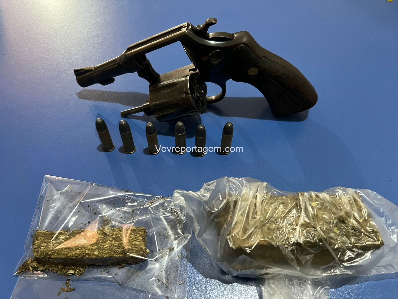 No fiel cumprimento da ordem judicial foram encontrados e apreendidas drogas – 11 buchas de cocaína e 18 gramas de maconha -, 01 revólver calibre 38, com 06 munições, dinheiro e uma balança de precisão.