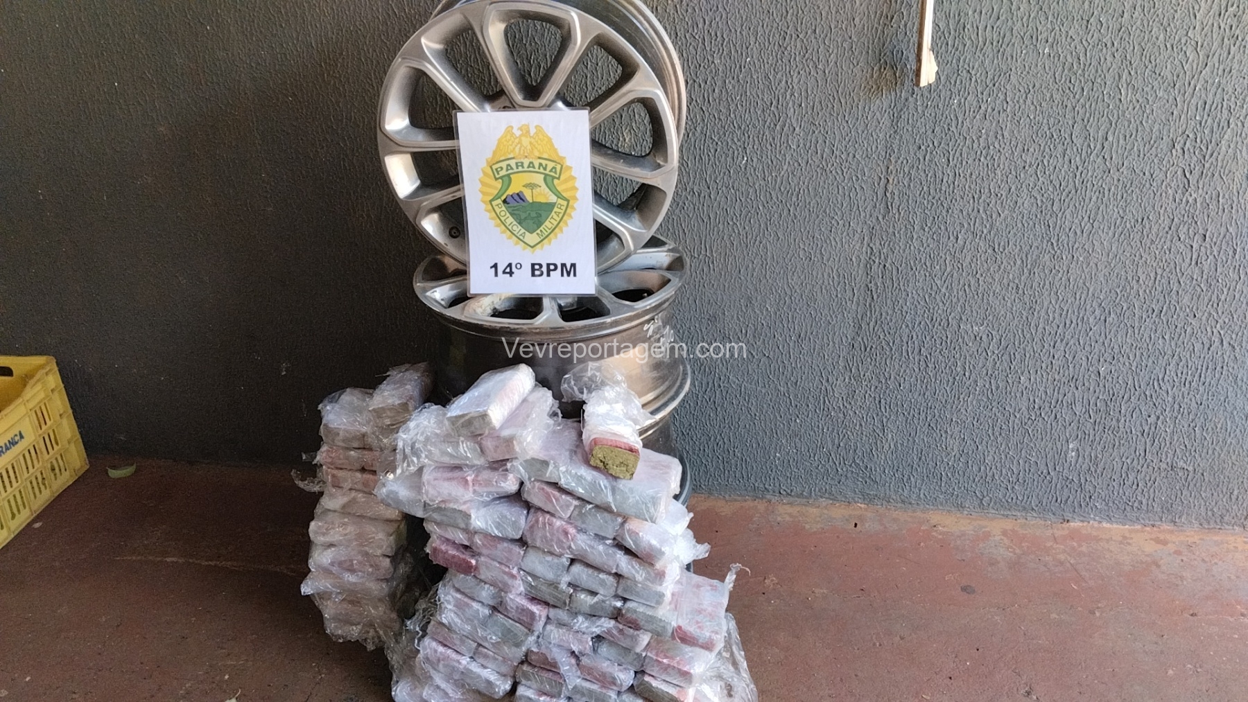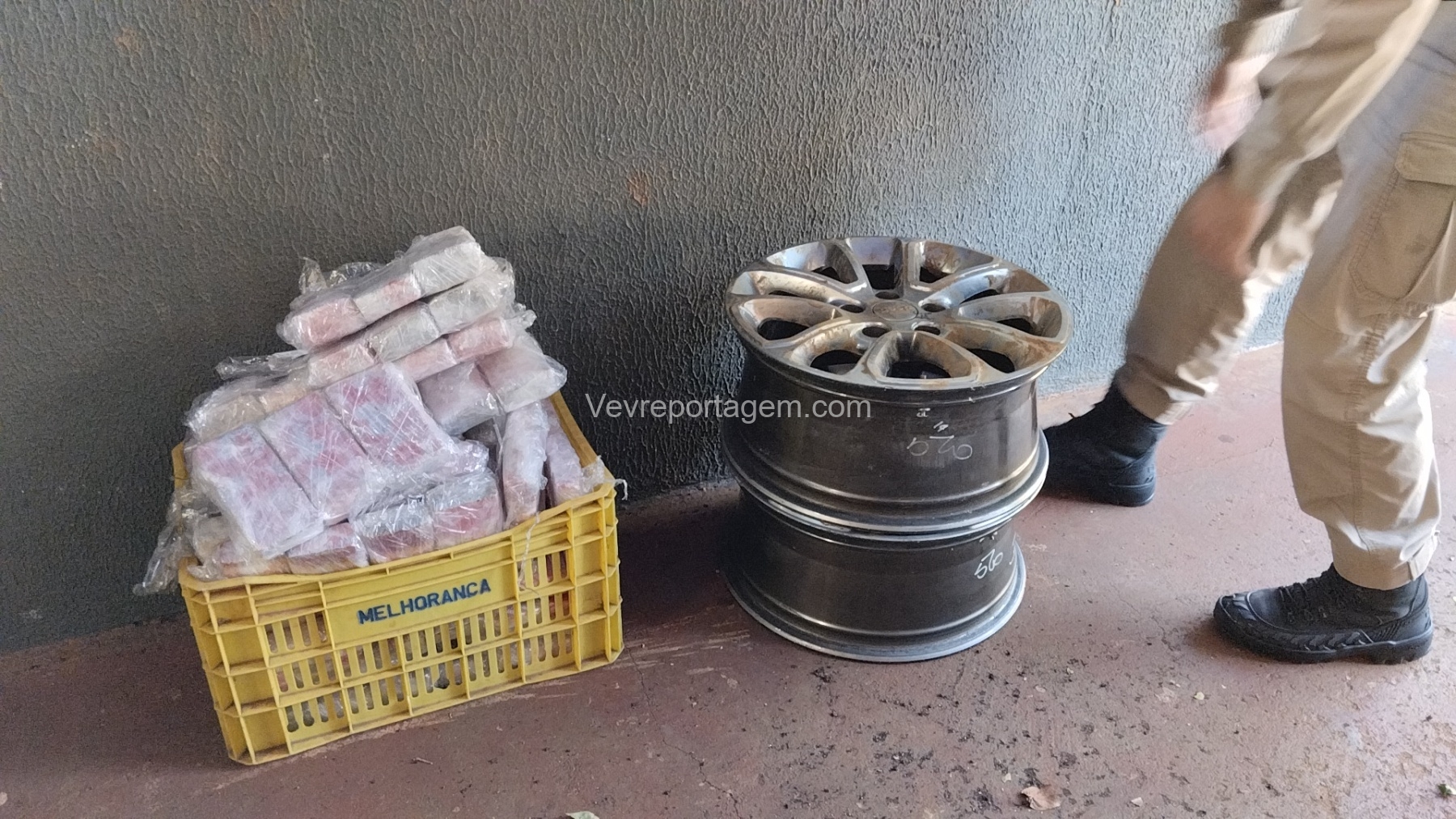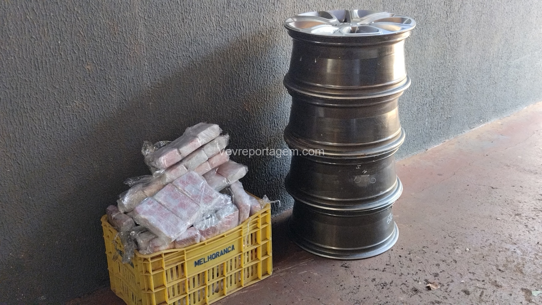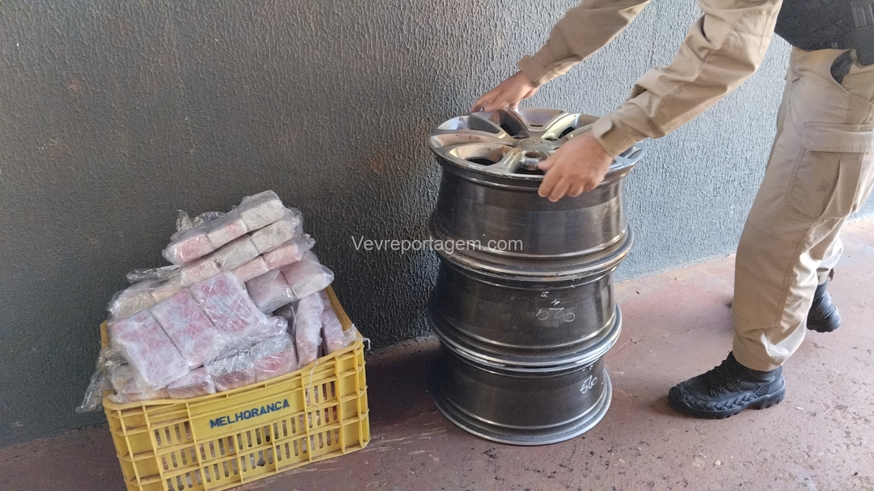 As rodas estavam envoltas em papel filme, o que levantou suspeita. Durante a abordagem e verificação, os policiais constataram que entorpecentes estavam escondidos no interior dos pneus.