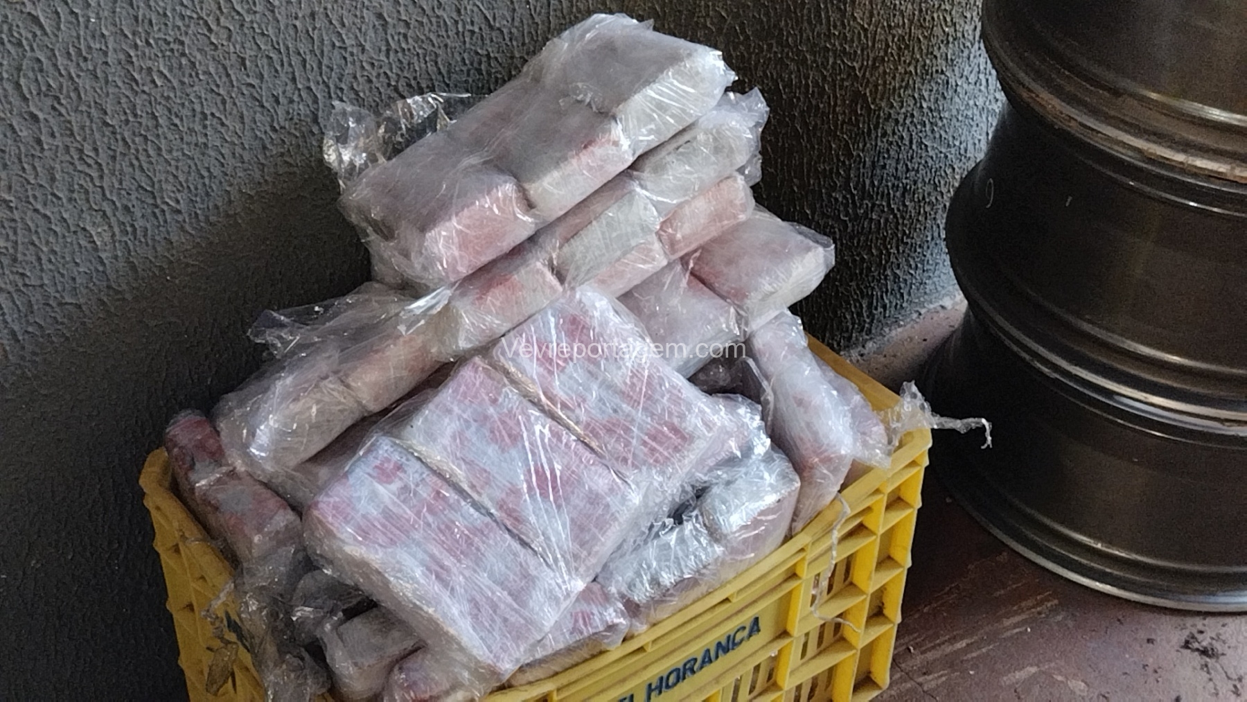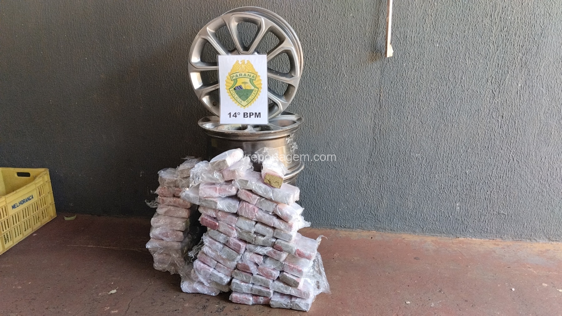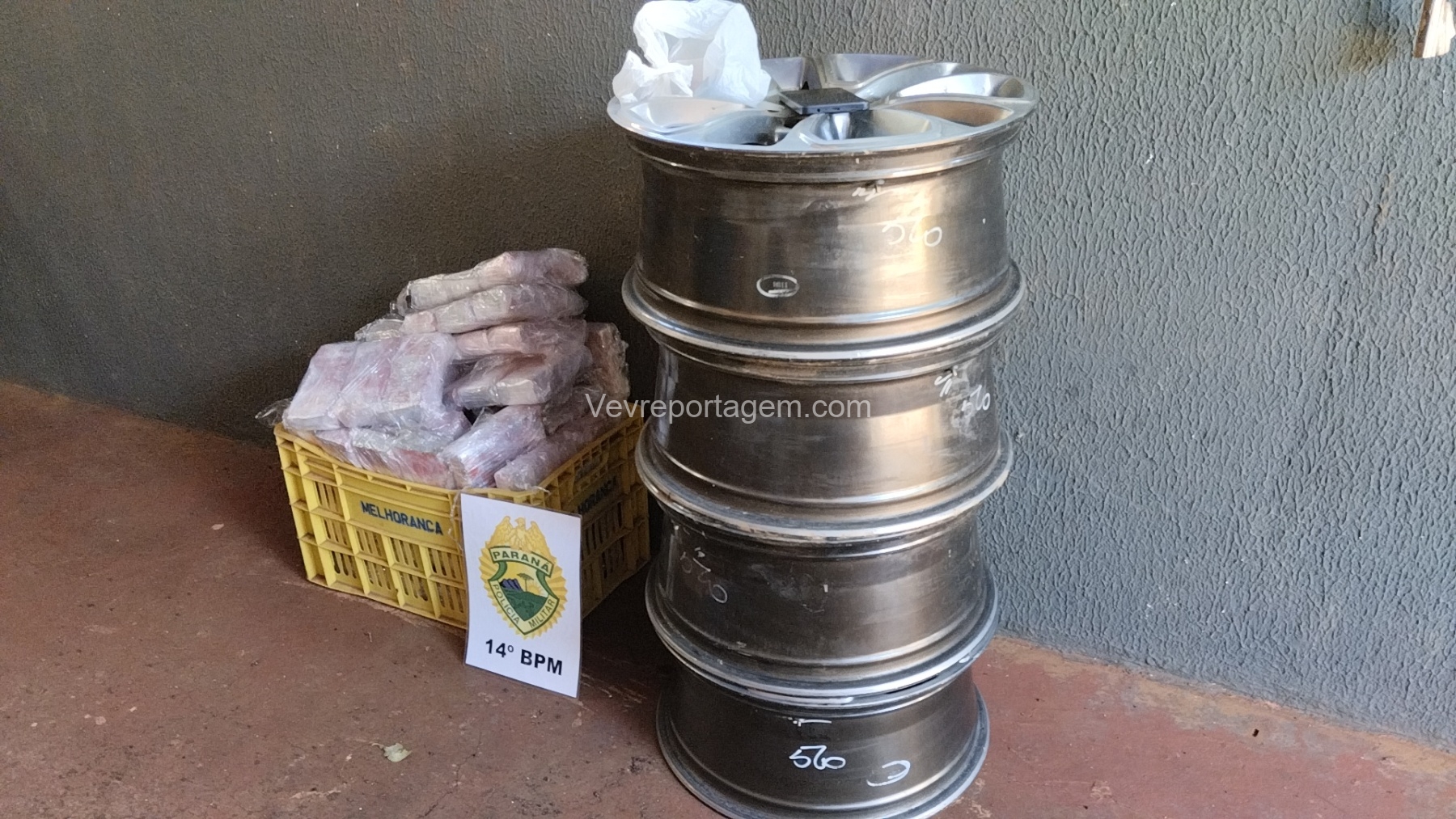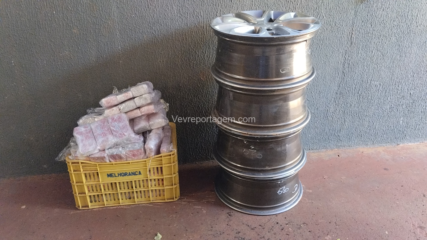 As rodas estavam envoltas em papel filme, o que levantou suspeita. Durante a abordagem e verificação, os policiais constataram que entorpecentes estavam escondidos no interior dos pneus.