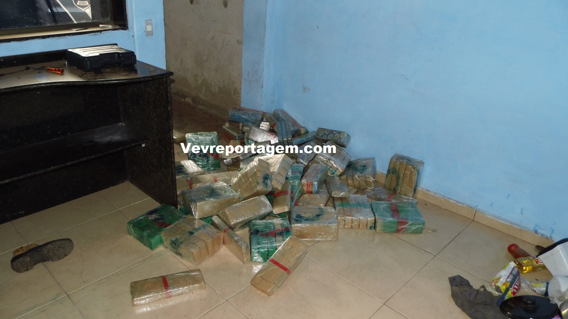 Ao chegarem no lugar da denúncia, os policias entraram e encontraram os quatro homens. Dois estavam carregando o forro do ônibus, que estava preparado com fundos falsos e os outros dois estavam do lado de fora com vários tabletes de maconha, preparando a droga para ser levada nos fundos falsos.