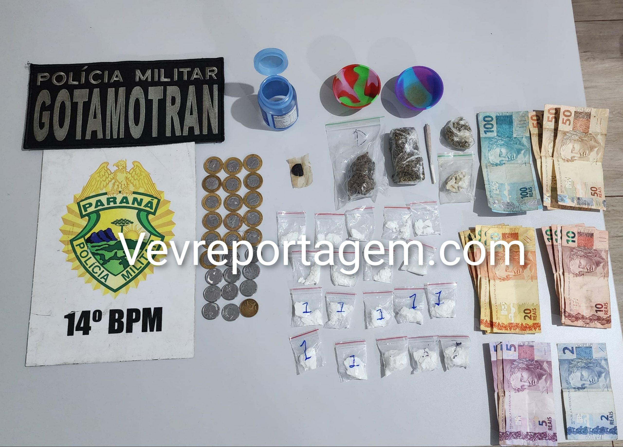 Durante a revista pessoal, os policiais encontraram no bolso do condutor um recipiente com 19 buchas de substância análoga à cocaína. Na pochete que ele carregava, foram localizados dois pequenos tabletes de substância semelhante à maconha, uma porção adicional, além da quantia de R$ 548, sendo R$ 527 em cédulas e R$ 21 em moedas.