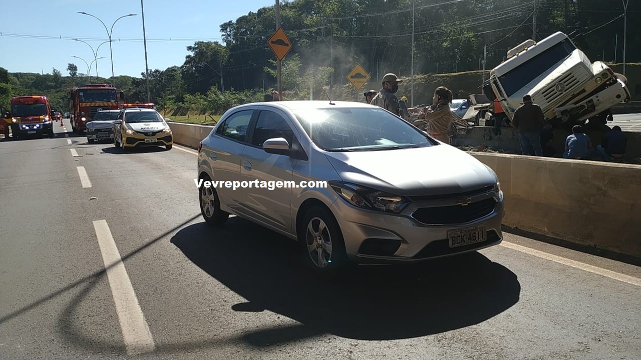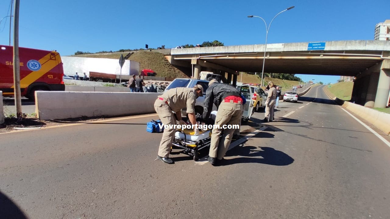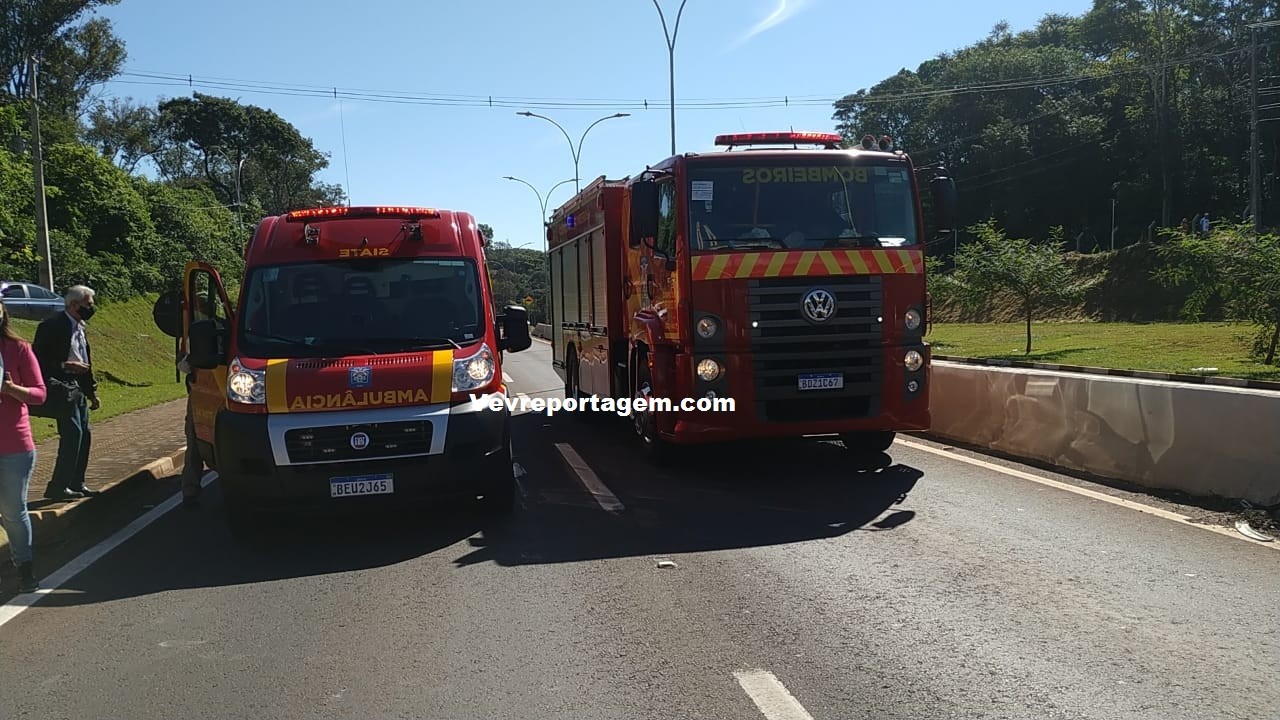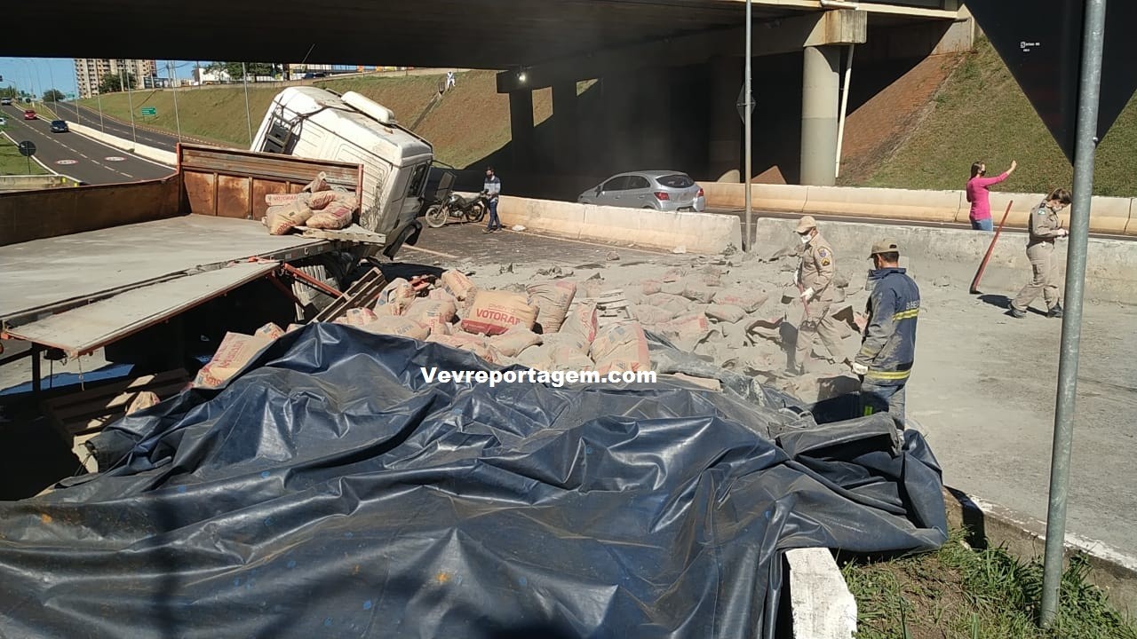 Na manhã desta quarta-feira, 28 de abril de 2021, por volta das 09h40 minutos, os socorristas do Siate, foram acionados para deslocarem até a Avenida Paraná, no viaduto, pois segundo as informações repassadas que uma carreta teria tombado e a carga de cimento teria caído em cima de um motociclista que passava na via.