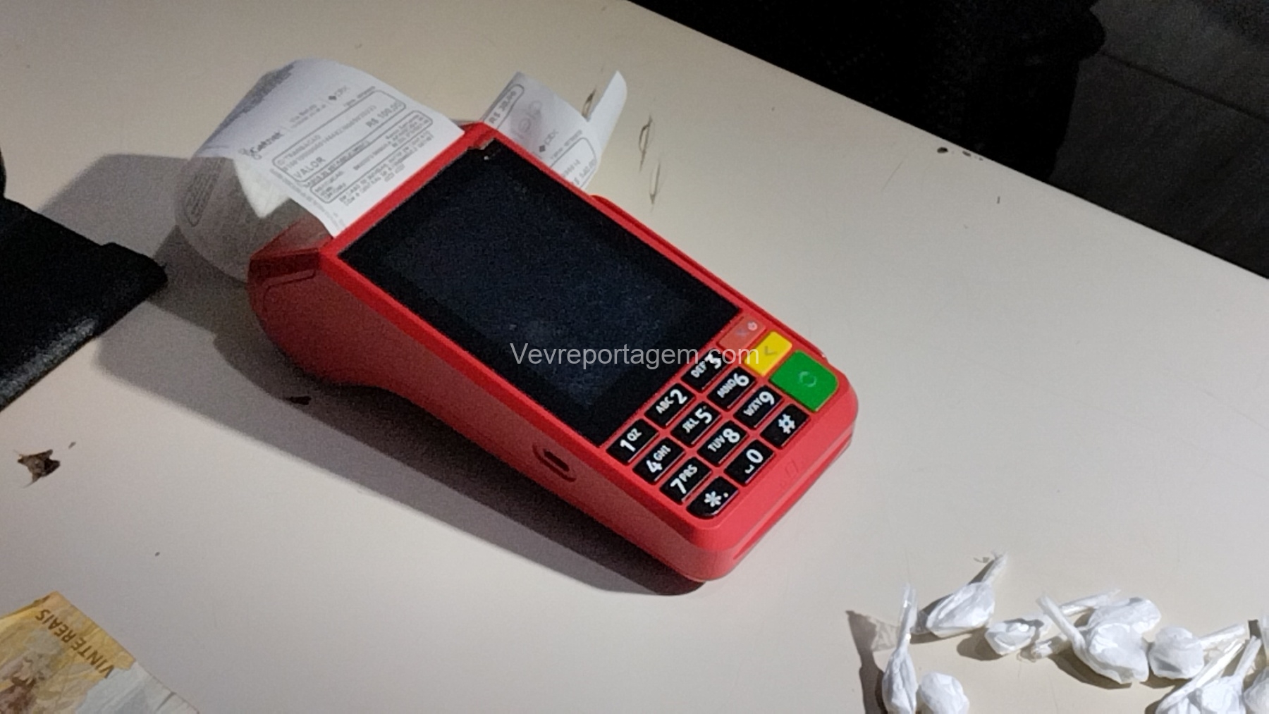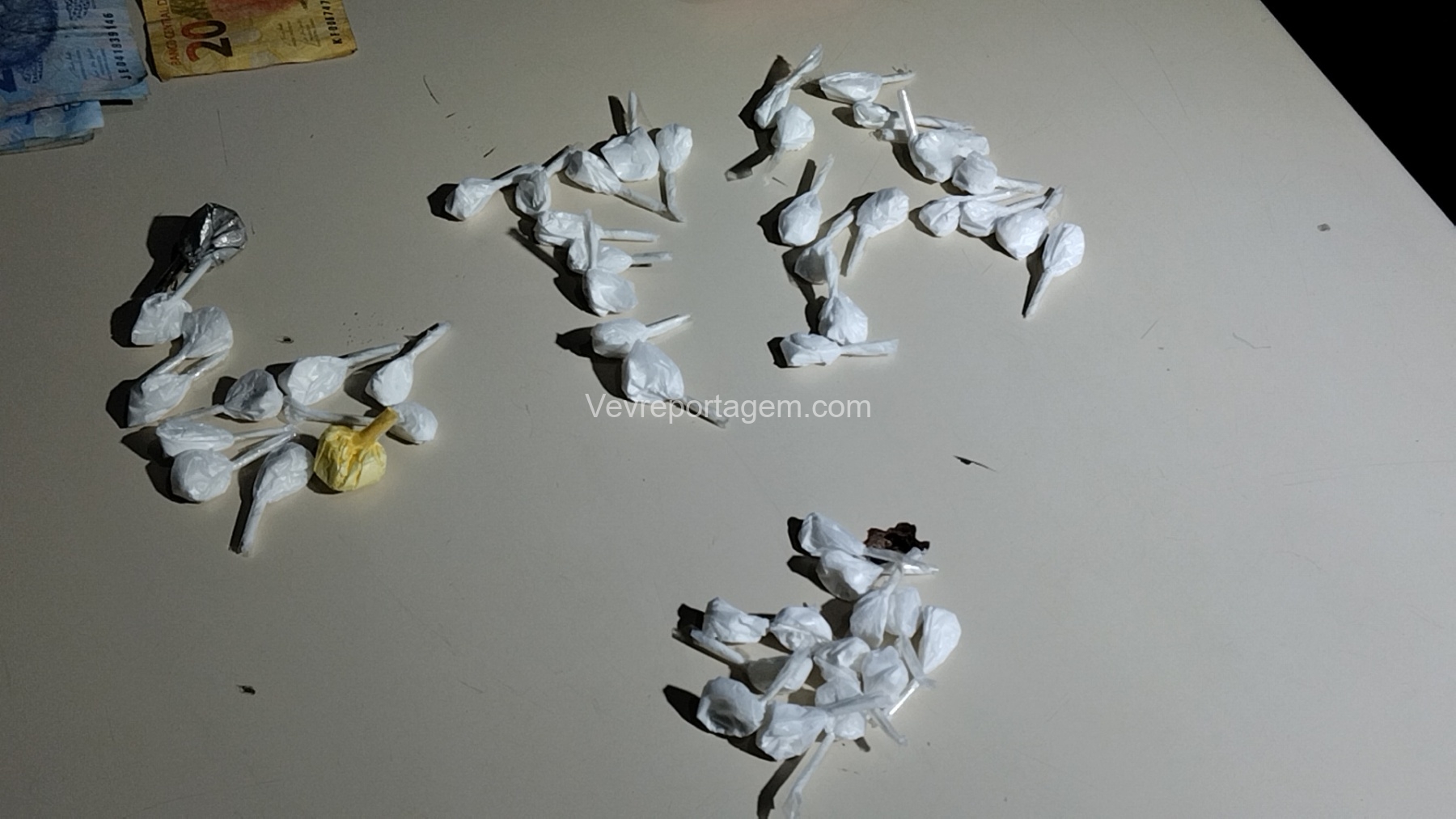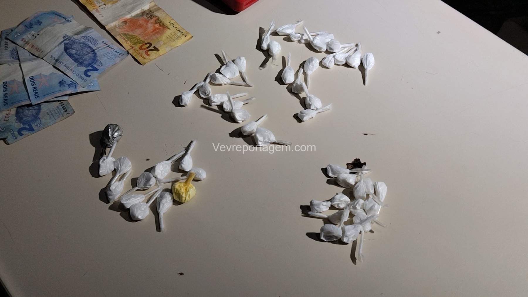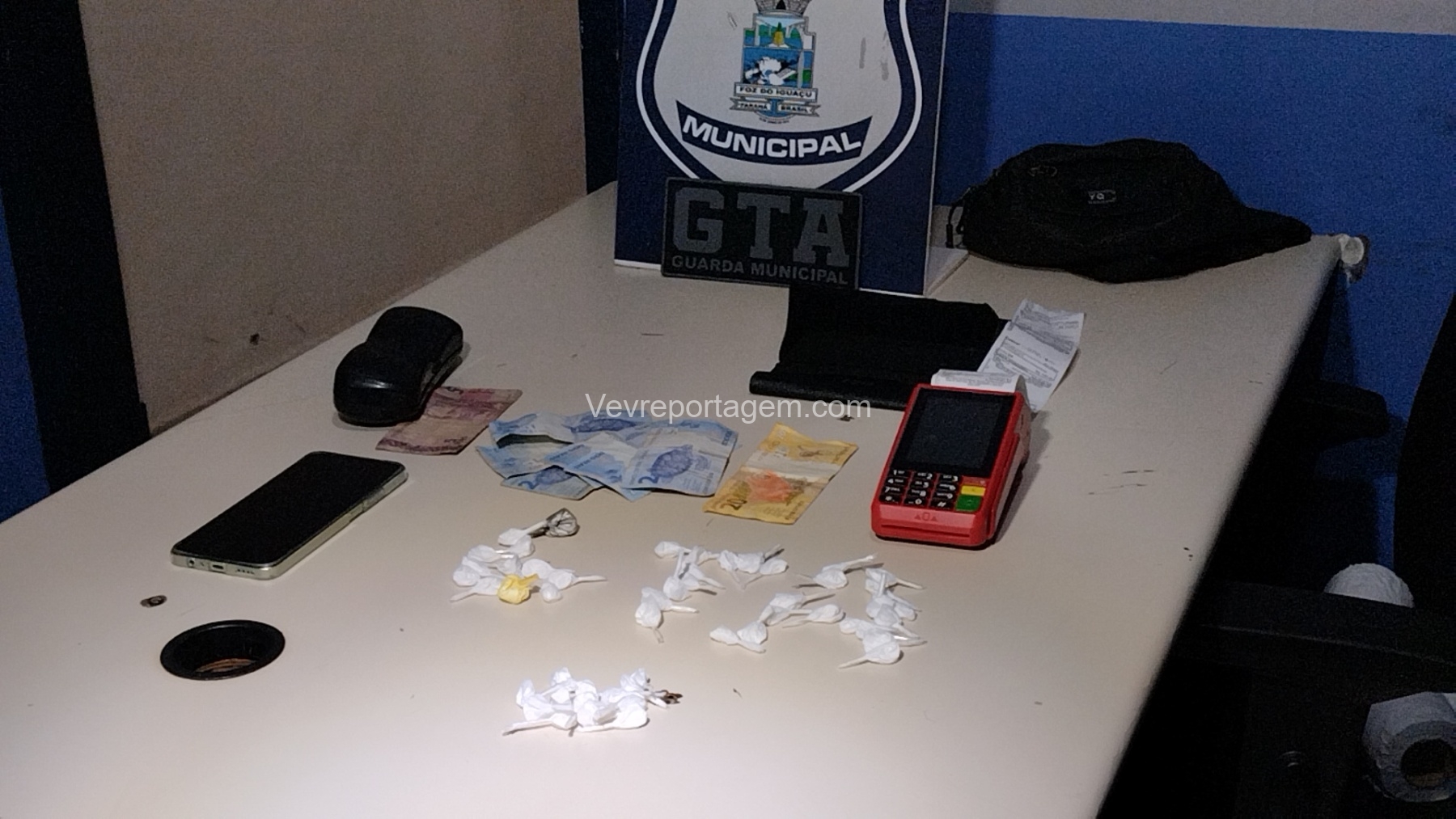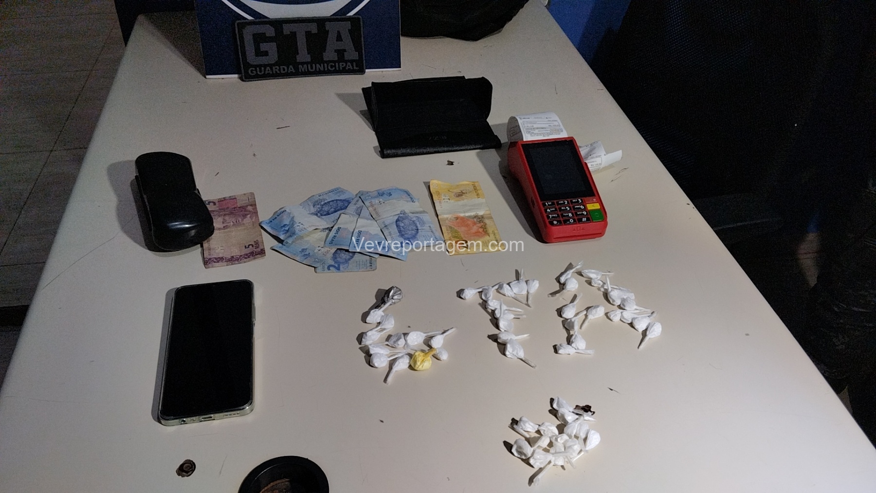 Diante da situação, a equipe realizou a abordagem. Durante a revista, os agentes localizaram algumas buchas de cocaína, uma quantia em dinheiro e também uma maquininha de cartão, que estaria sendo utilizada para realizar a cobrança na venda de entorpecentes.