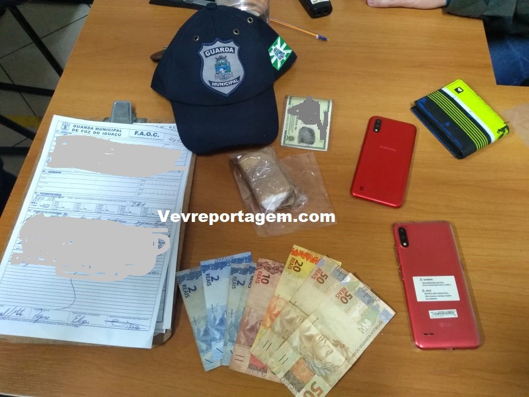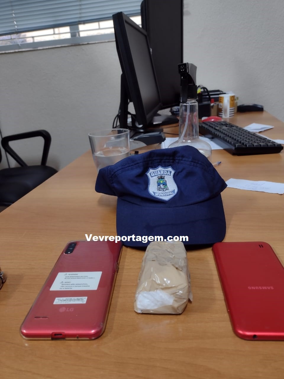 Ato continuo este foi perseguido e abordado sendo submetido a busca pessoal e localizado em um dos bolsos um invólucro de fita adesiva e dentro uma substancia de cor branca análoga a cocaína que após pesada totalizou 100 gramas, dois aparelhos de telefone celular e 141 reais, o abordado foi identificado como sendo um adolescente de 16 anos de idade.