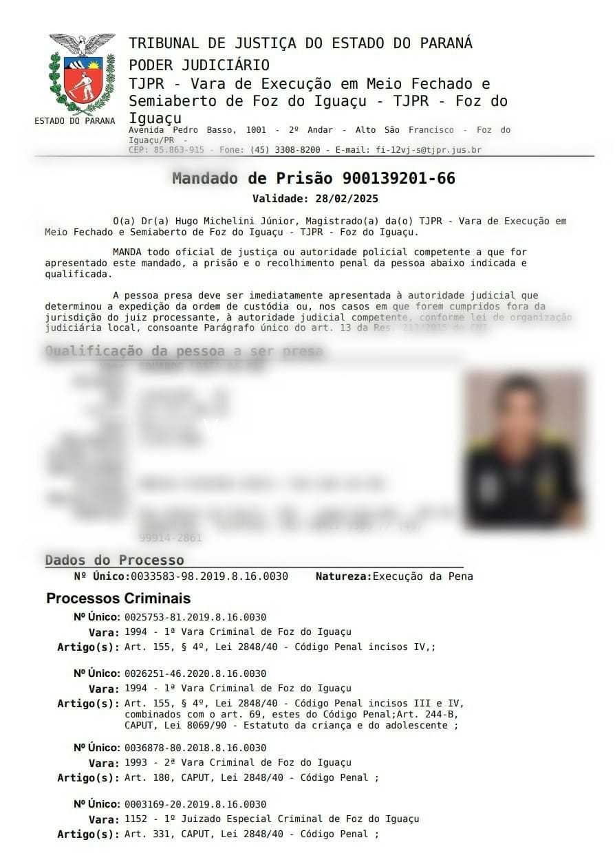 Ato contínuo sendo realizado abordagem no homem, onde foi submetido a busca pessoal, porém, nada de ilícito localizado, ao inserir o nome do homem e pesquisado junto ao sistema informatizado da central de operações, foi constatado haver contra este um mandado de prisão Expedido pela Vara de Execuções Penais de Foz do Iguaçu.