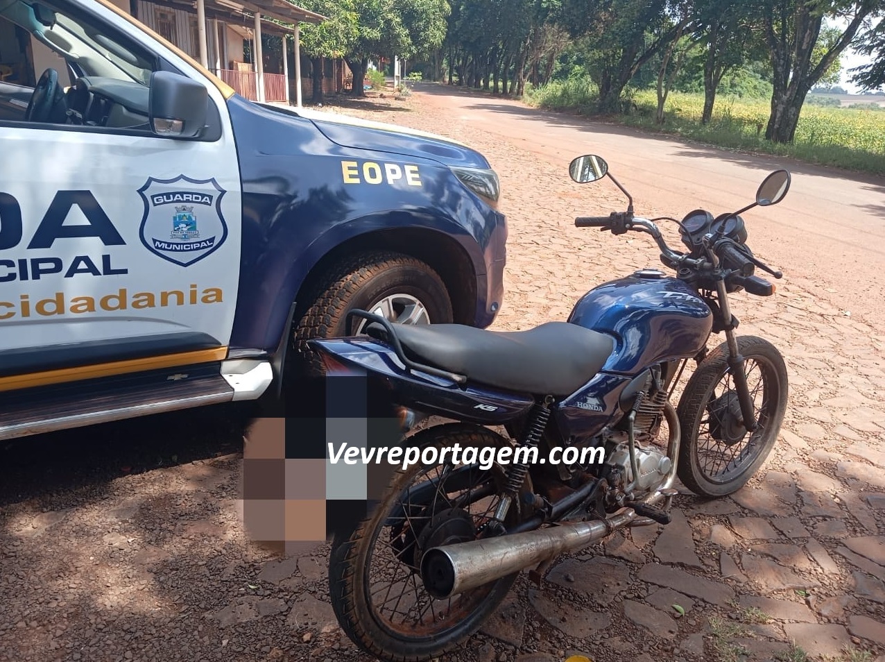 A ação ocorreu após denúncia anônima, que levou os agentes até a Rua Vera Cruz, s/nº. No local, foi localizada uma motocicleta Honda CG Titan, de cor azul, com placas AJW-8G39.