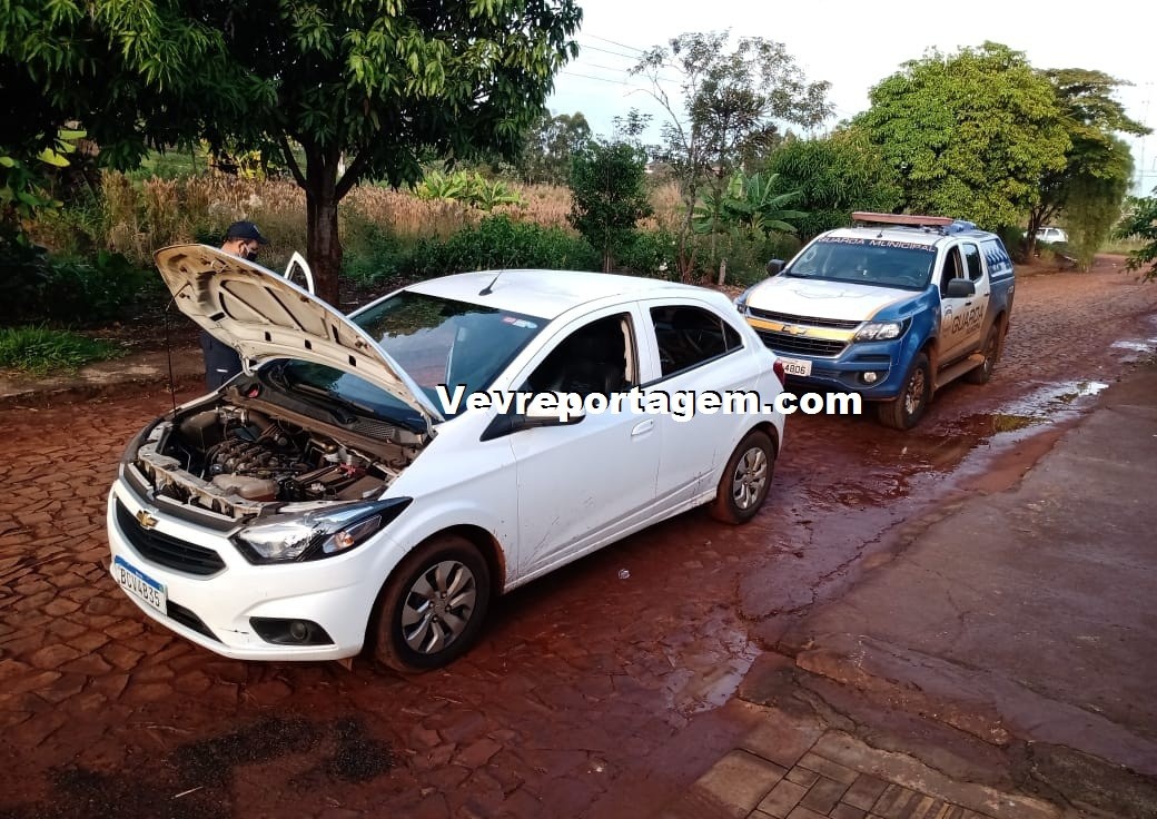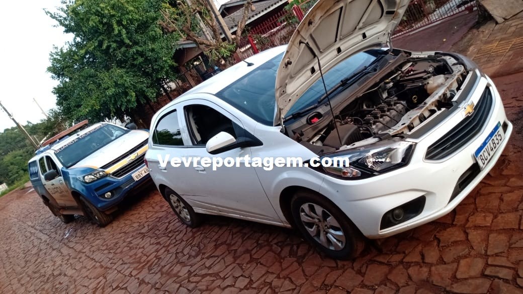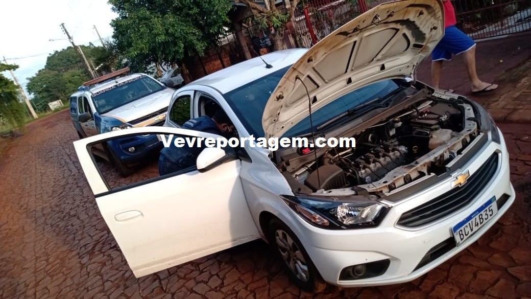 Ato continuo a equipe aproximou-se e constatou que o veículo estava aberto tratando-se de um veiculo da marca CHEVROLET modelo ONIX de cor BRANCA e placas BCV-4B35 da cidade de Foz do Iguaçu qual ao ter a placa inserida no sistema informatizado da central de operações constatou-se que o veículo havia sido roubado por volta das 02h00 minutos, de um motorista de aplicativo.