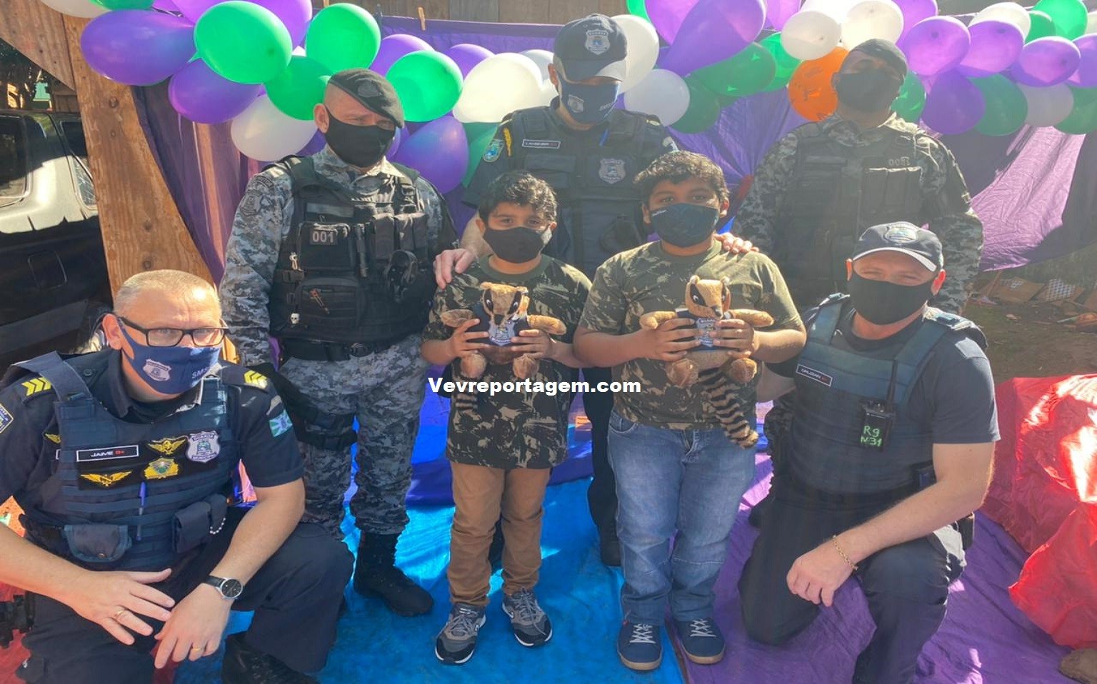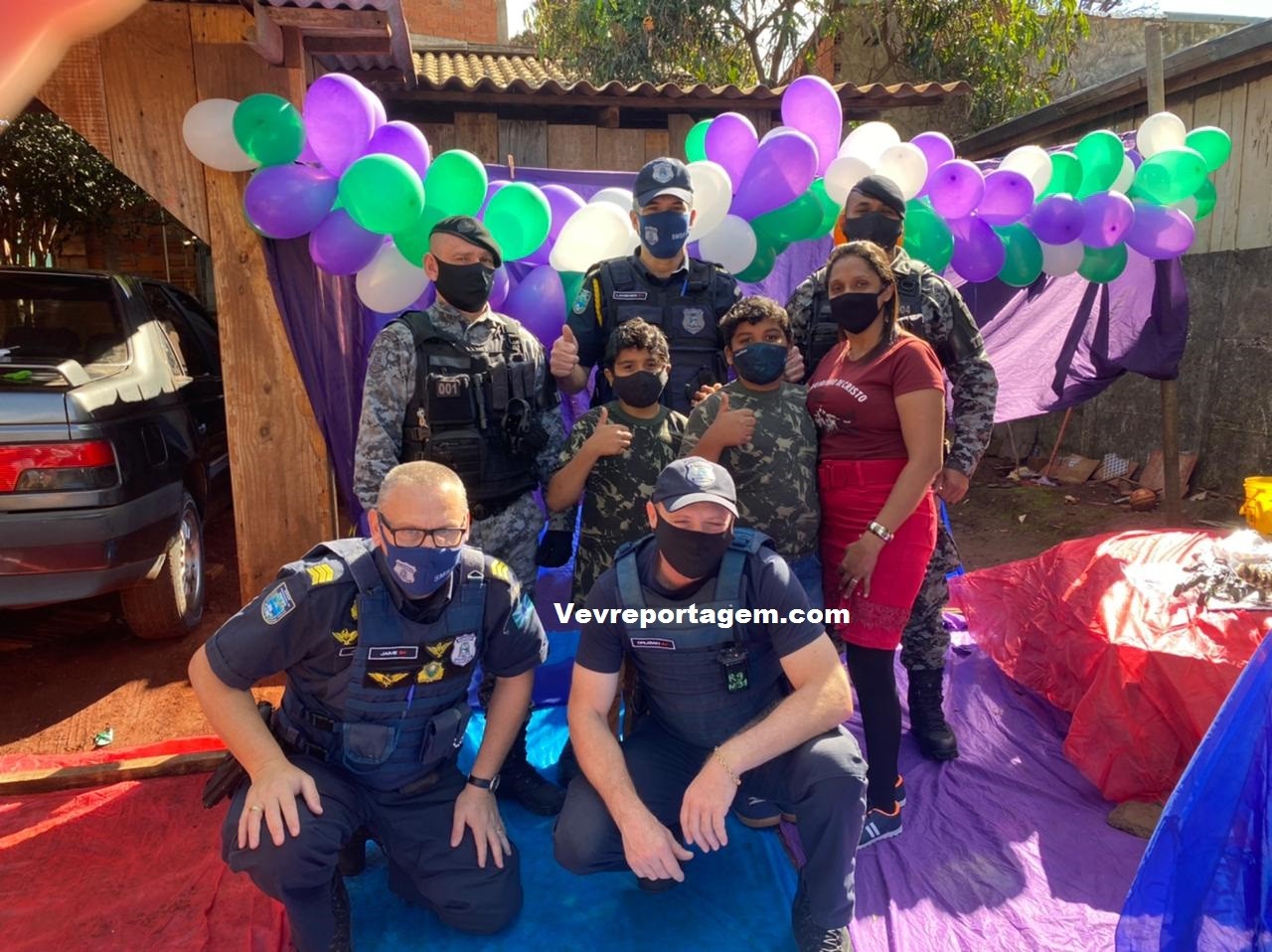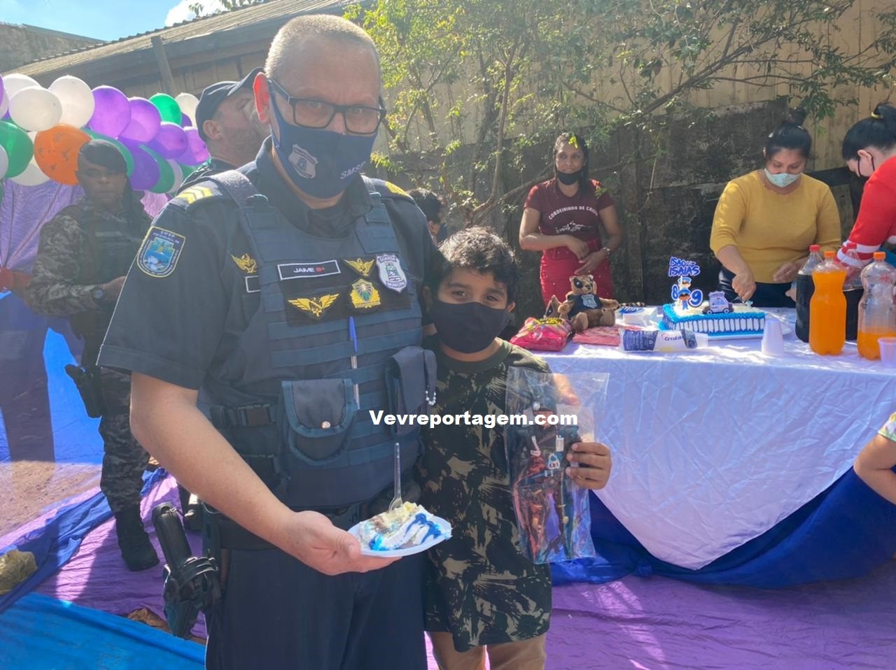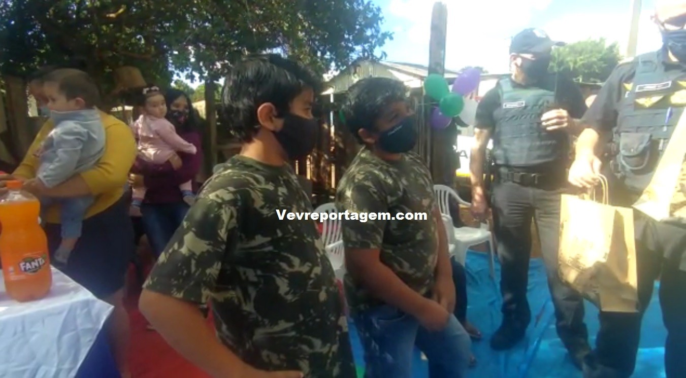 A guarnição além de ir na festa dos aniversariantes, levaram presentes e um bolo para comemorarem com as duas crianças este dia tão especial. Antes de cantarem o parabéns os aniversariantes tiraram fotos com os guardas municipais e até entraram na viatura para conhecer como funciona.