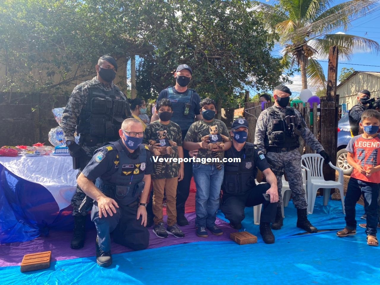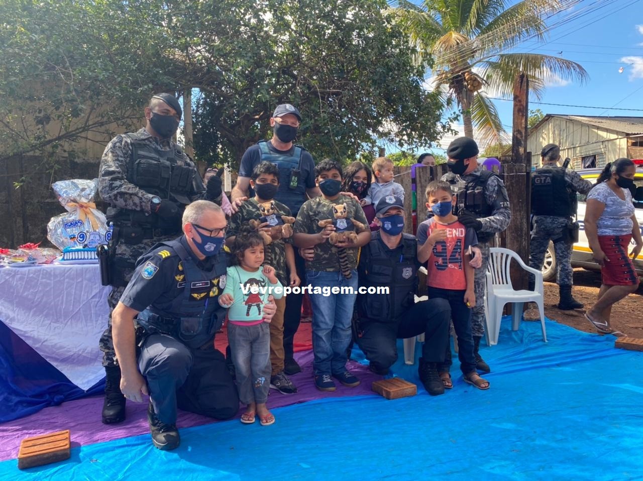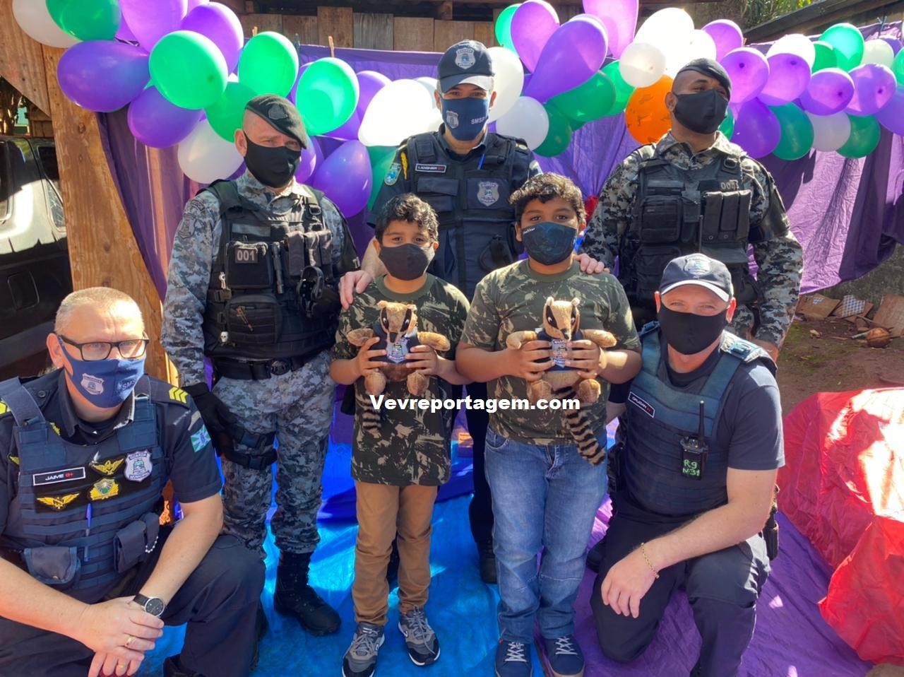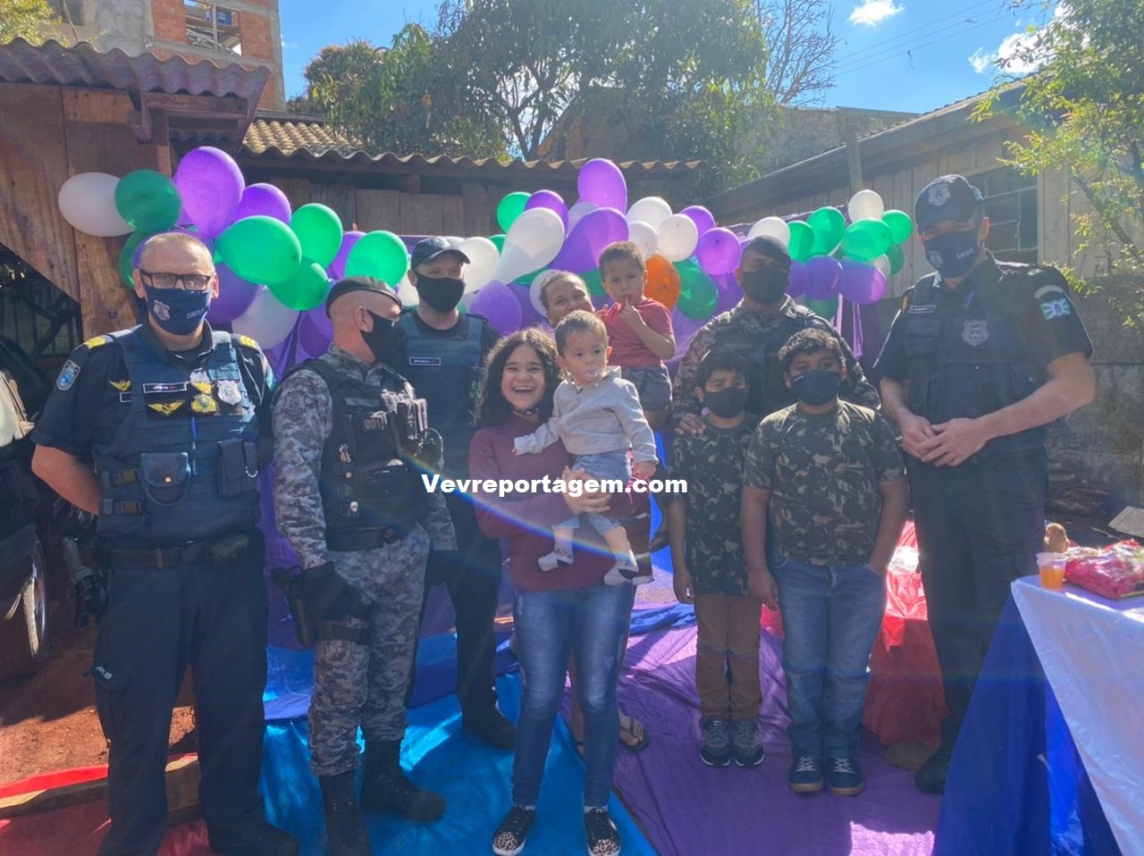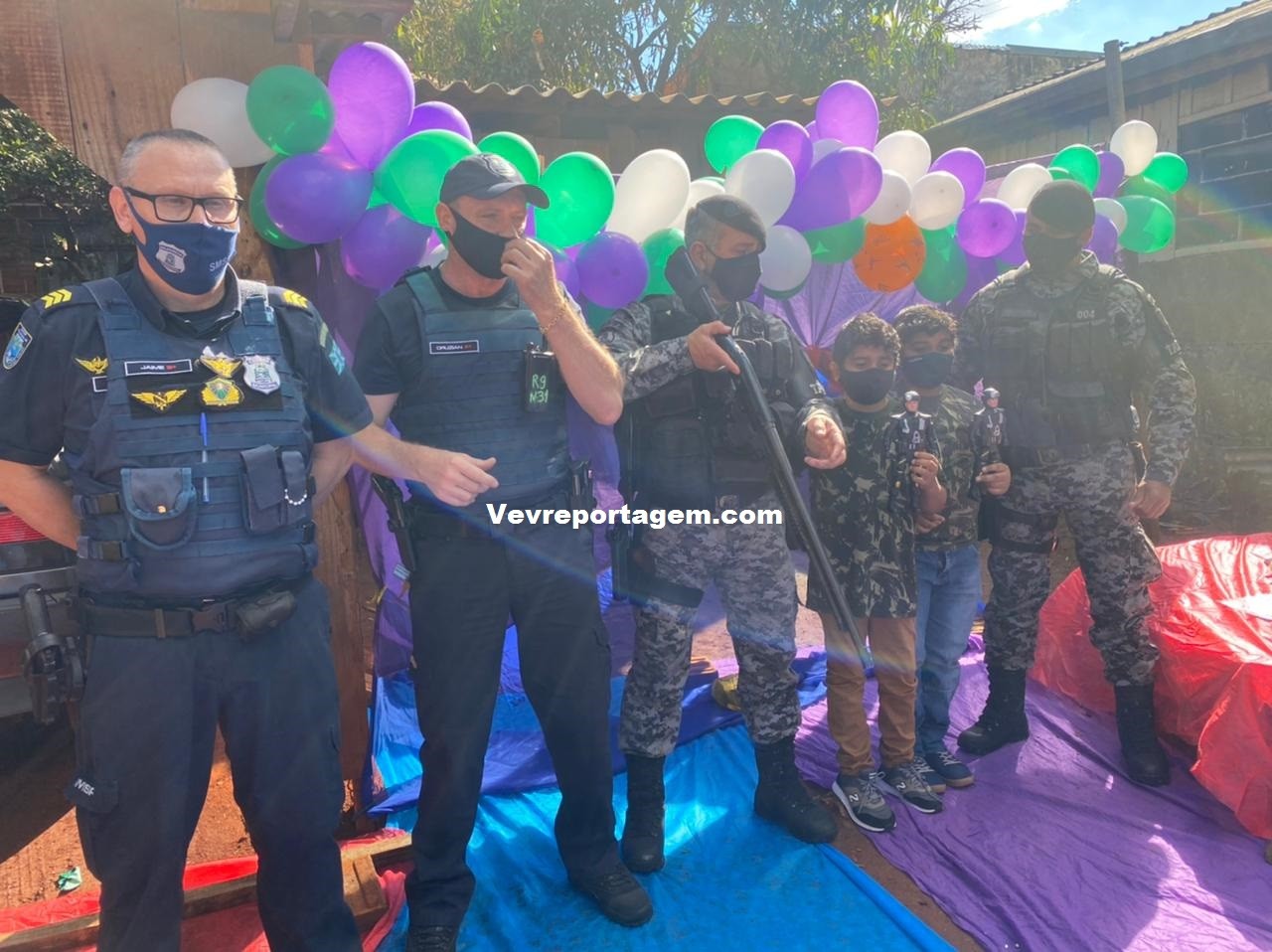 A guarnição além de ir na festa dos aniversariantes, levaram presentes e um bolo para comemorarem com as duas crianças este dia tão especial. Antes de cantarem o parabéns os aniversariantes tiraram fotos com os guardas municipais e até entraram na viatura para conhecer como funciona.