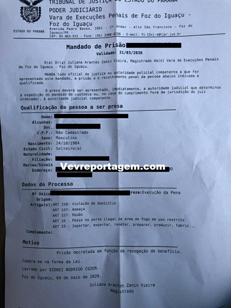 De imediato a equipe se deslocou até a até o local, onde lograram êxito em localizar o indivíduo, de imediato foi feita a abordagem em revista pessoal nada de ilícito foi encontrado, porém ao consultar o nome do mesmo no sistema policial, foi constado que havia um mandado de prisão em aberto, com validade 31/03/2036, pelos crimes de roubo, tráfico de drogas, porte ilegal de arma de fogo de uso restrito, violação domiciliar e ameaça.