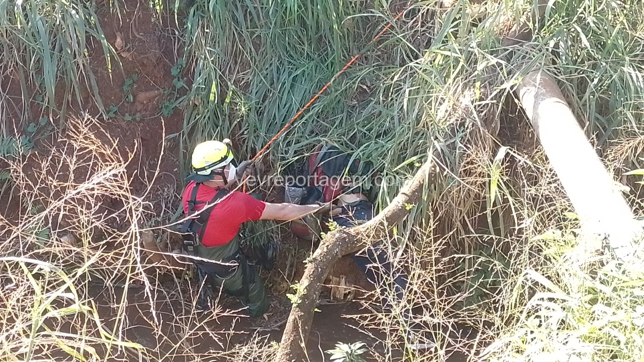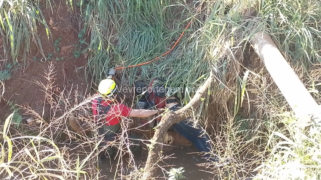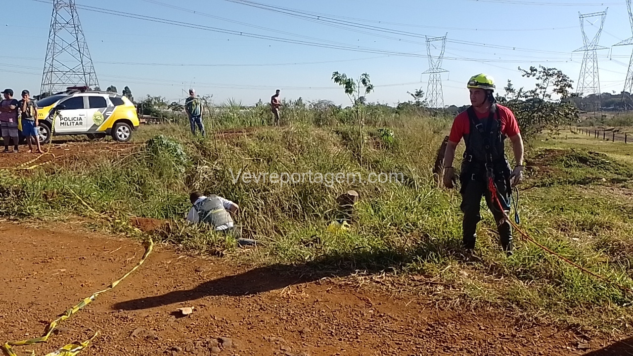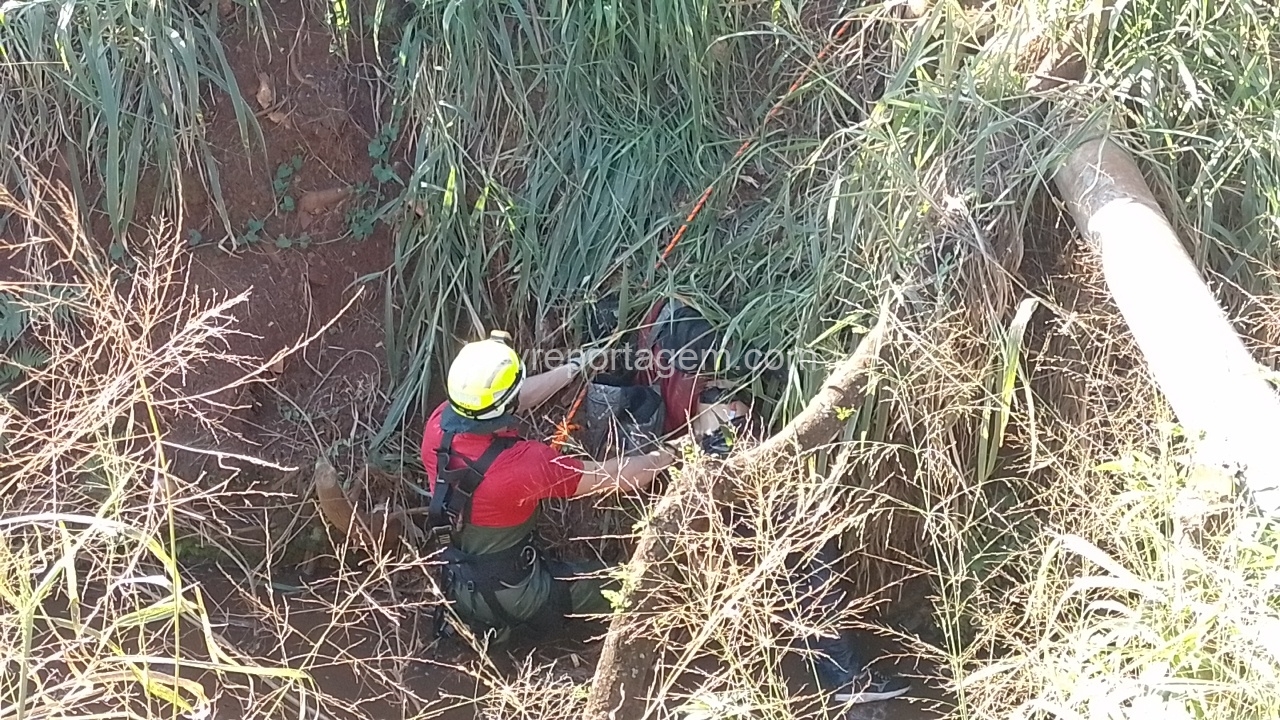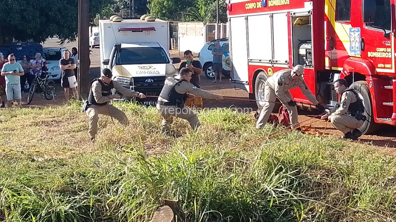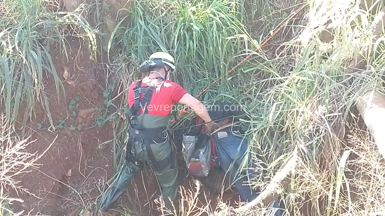 Para a remoção do corpo, foi necessária a atuação do Corpo de Bombeiros, que enviou uma equipe com uma viatura ABTR (Auto Bomba Tanque Resgate) especializada para esse tipo de situação. Após o resgate, os peritos realizaram uma análise preliminar no local e constataram que não havia sinais visíveis de ferimentos causados por violência. No entanto, foi identificado um traumatismo craniano encefálico (TCE).