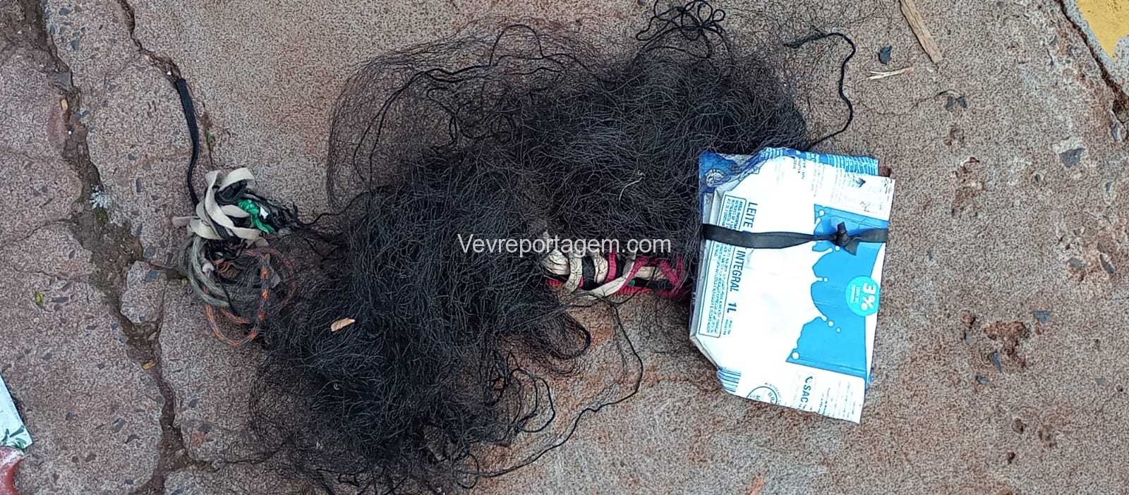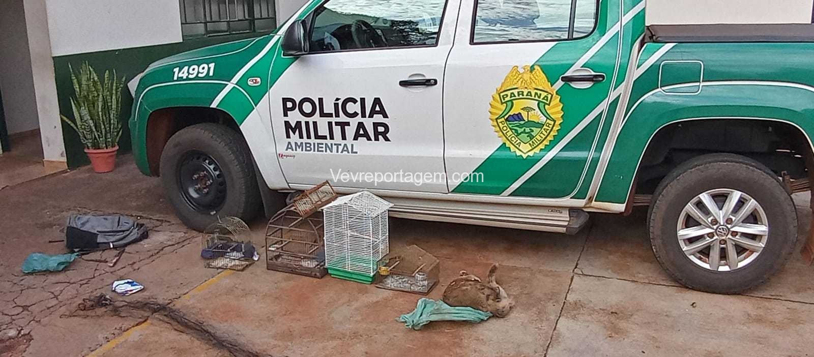 Após denúncia anônima, policiais ambientais abordaram um homem na Avenida das Cataratas, em Foz do Iguaçu, e encontraram na garupa da sua bicicleta um quati morto, uma gaiola com uma ave silvestre trinca-ferro e redes de captura de pássaros.