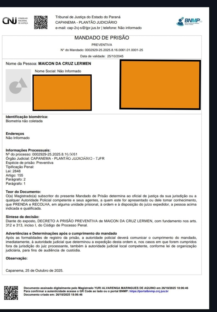 Conforme informações levantadas posteriormente, Maicon possuía um mandado de prisão em aberto pelo artigo 155 do Código Penal (furto), expedido pela Vara Criminal da Justiça da cidade de Capanema.