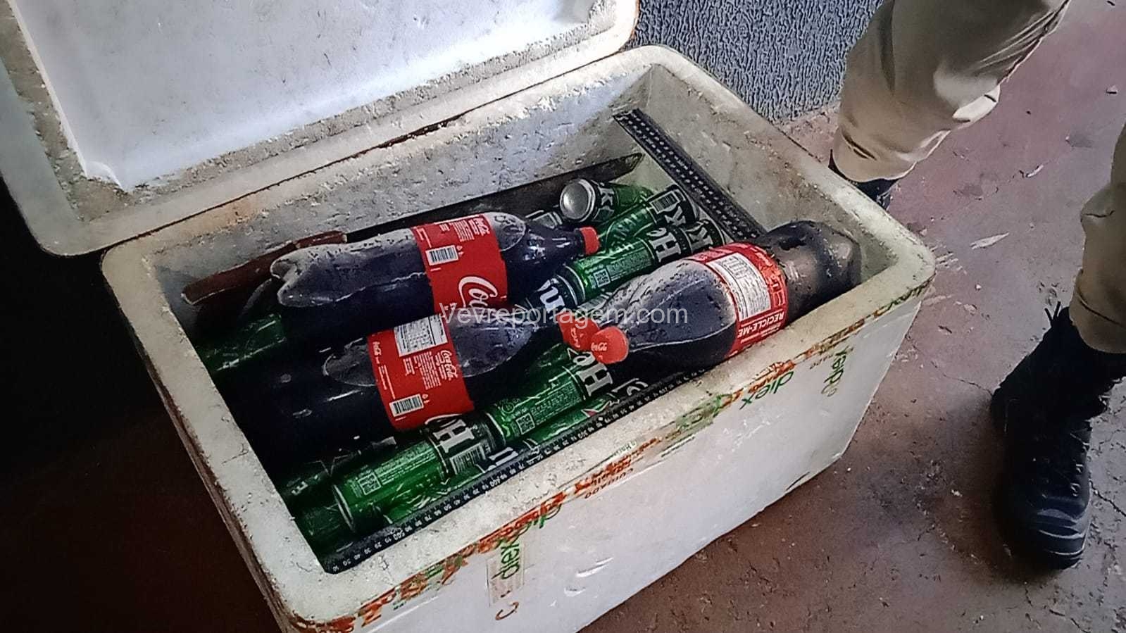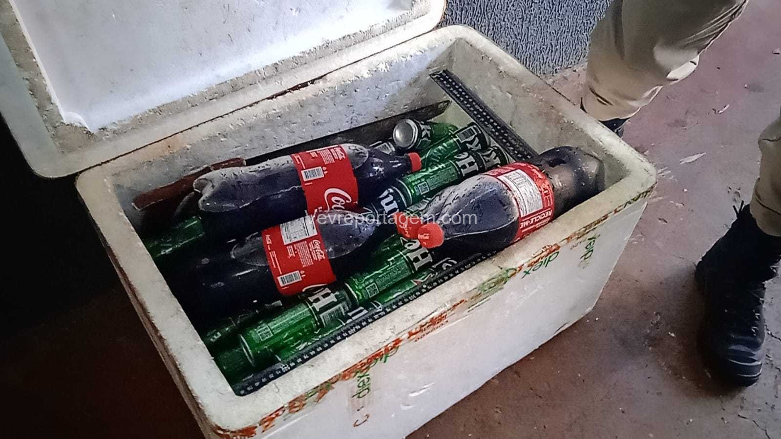 Os policiais realizaram buscas nas proximidades e localizaram o suspeito parado em uma esquina, consumindo uma cerveja. Durante a abordagem e vistoria, foi constatado que dentro da caixa de isopor havia garrafas de cerveja, incluindo Heineken, além de Coca-Cola, água e outros produtos provenientes do furto.