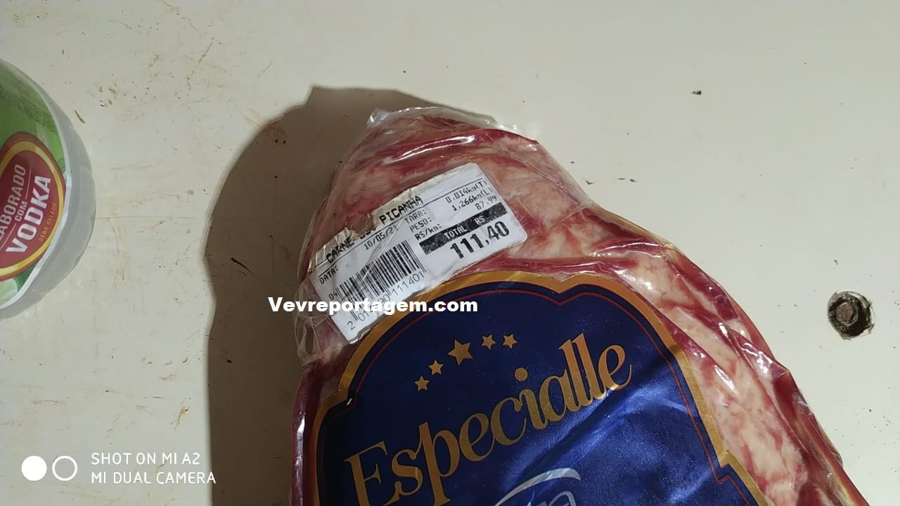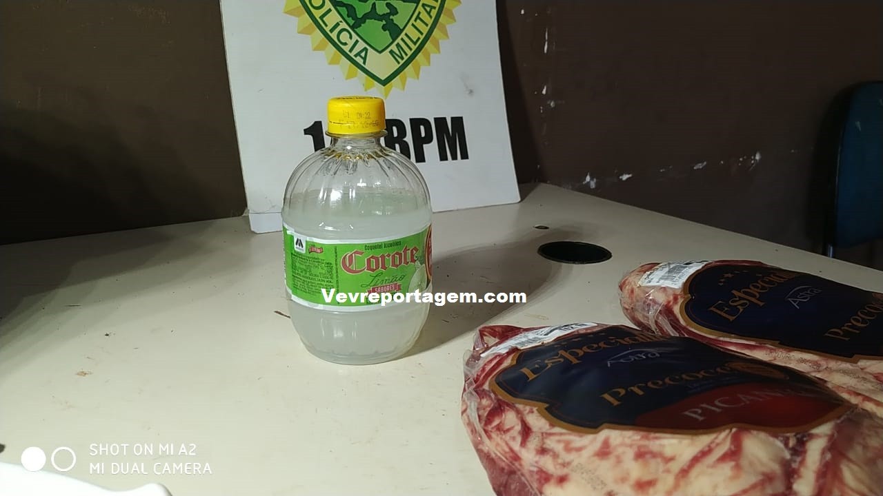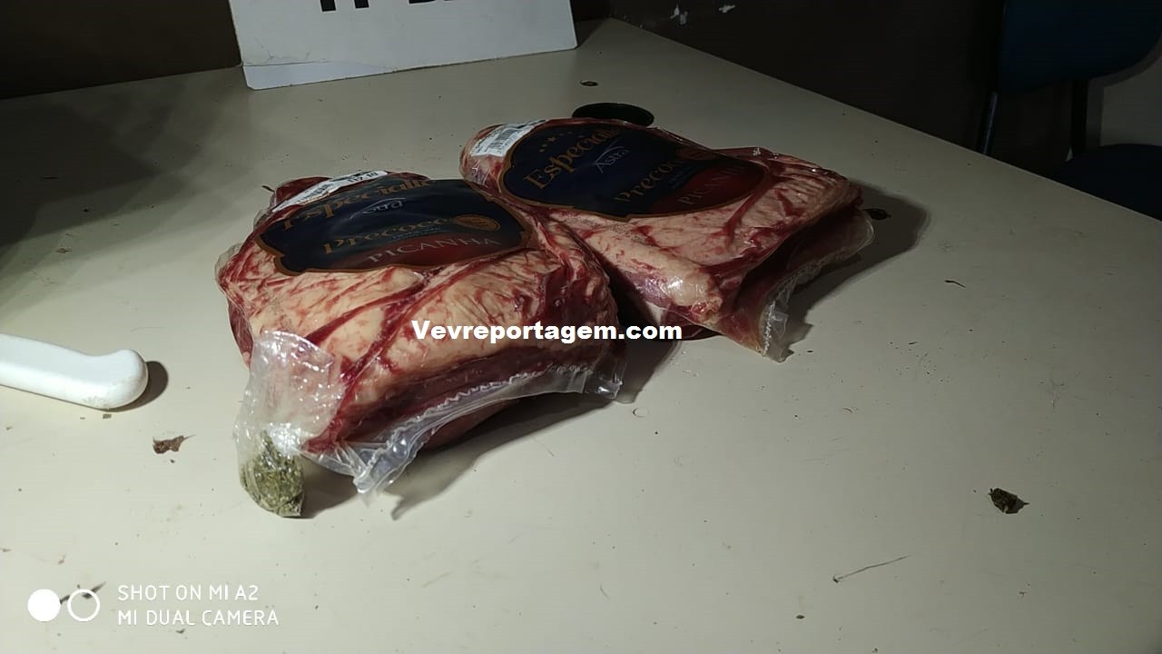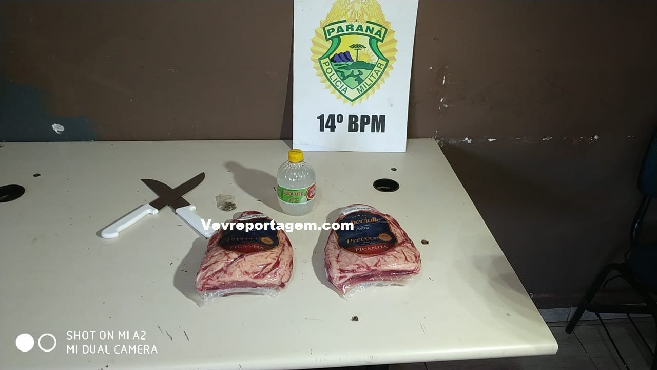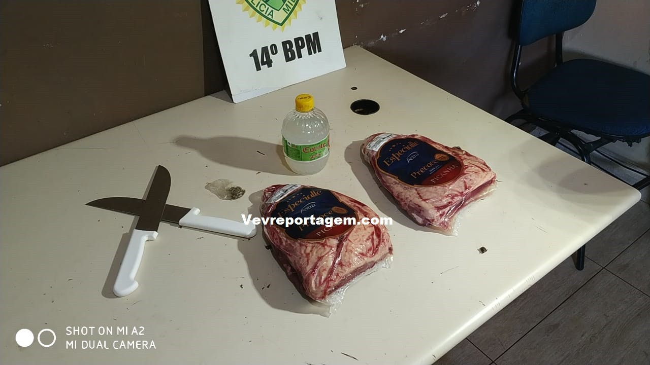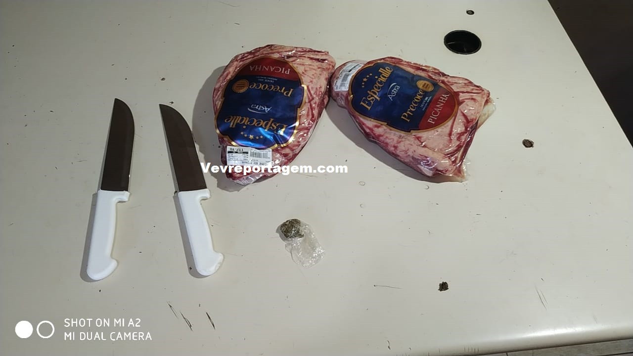 No local, os policiais constataram a ocorrência, o homem estava detido e com duas peças de picanha, duas facas e um corote. Na revista pessoal foi encontrado uma pequena porção de maconha, segundo ele era para seu uso.