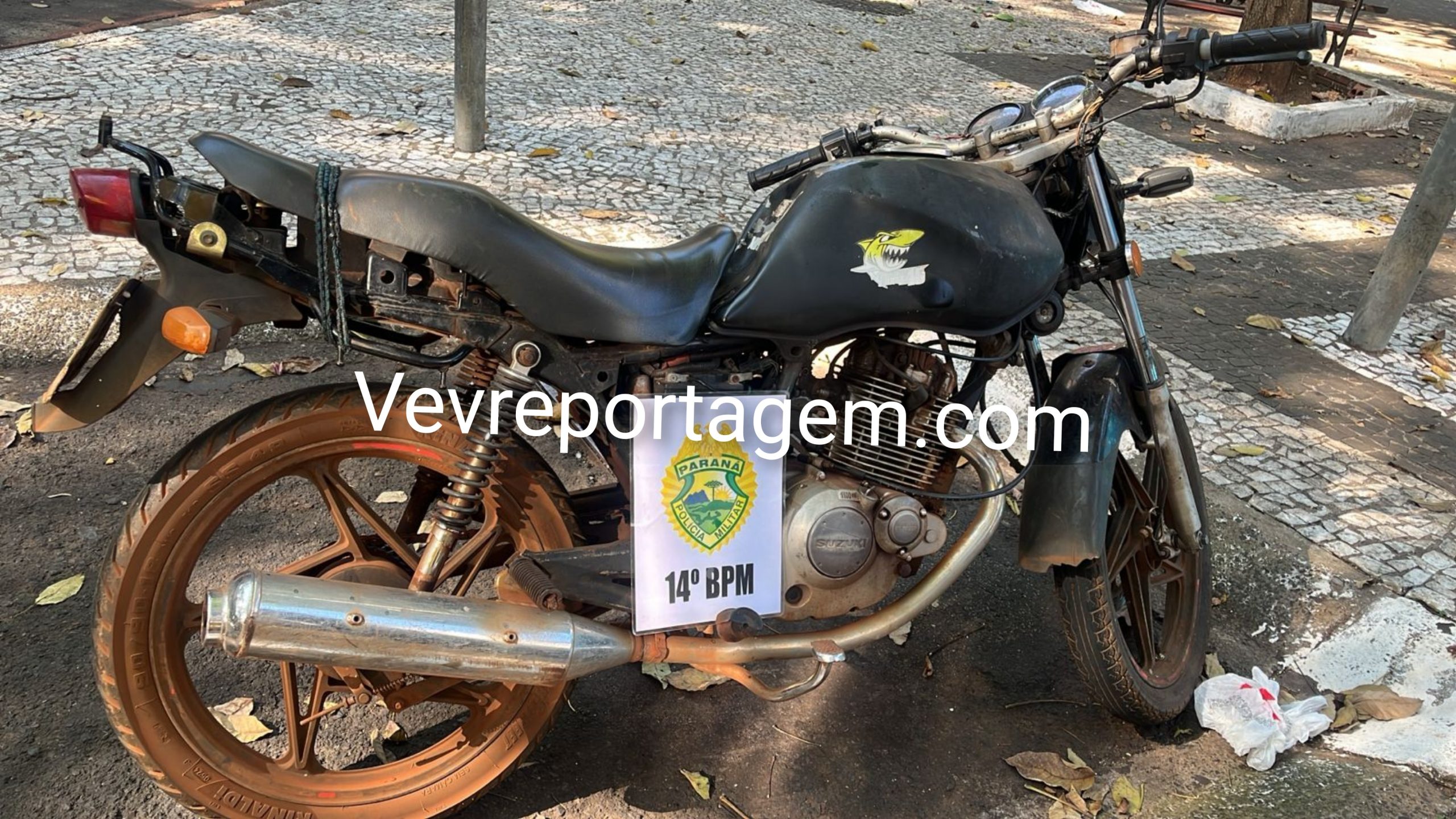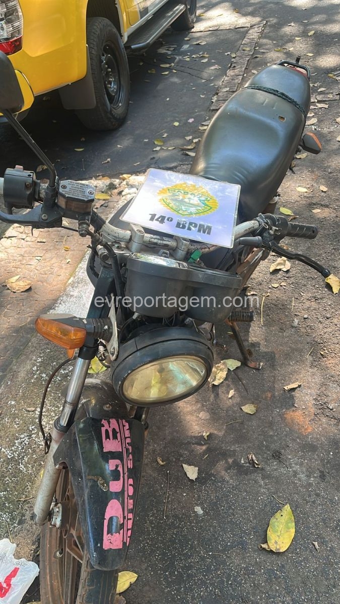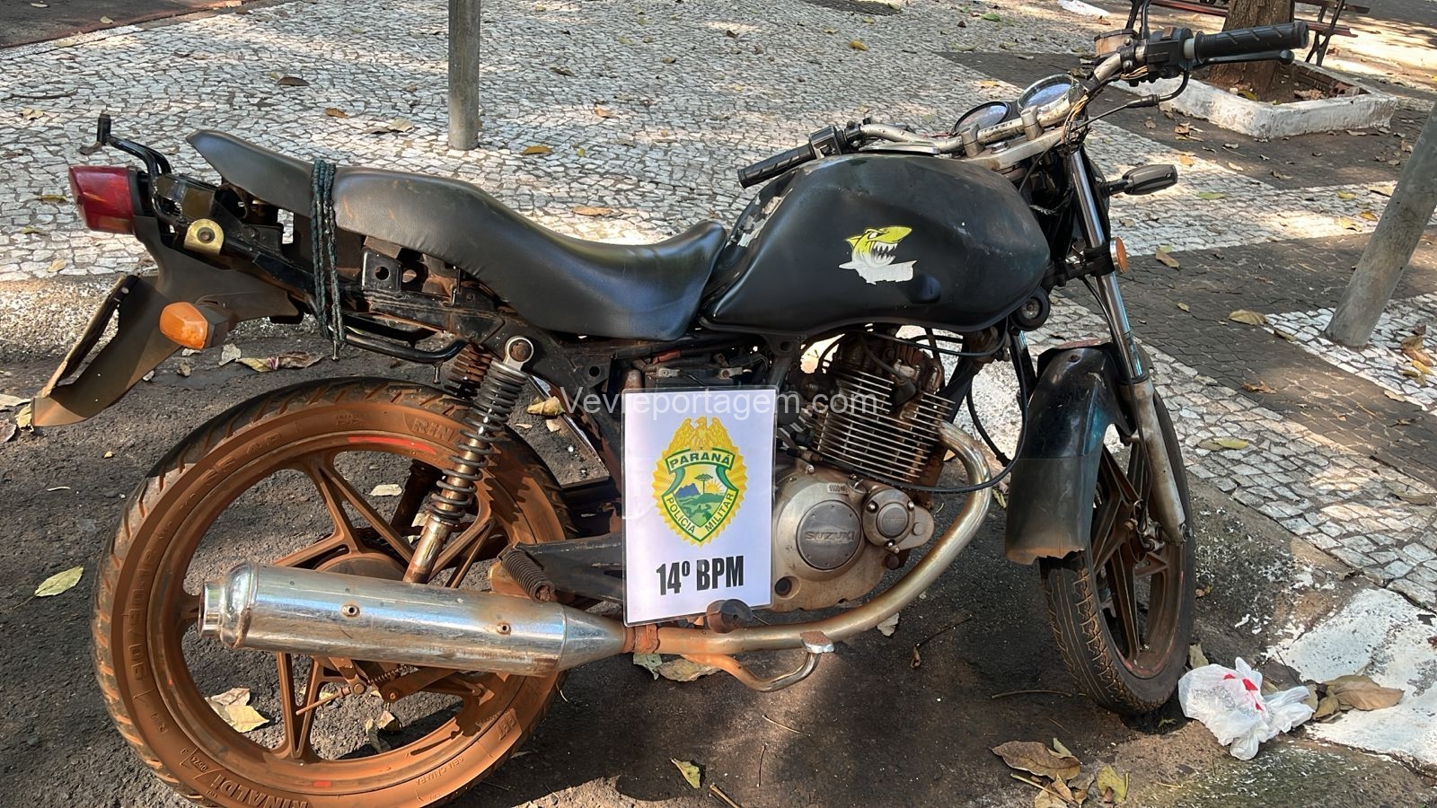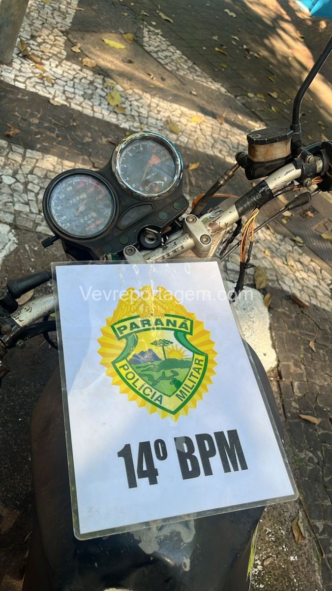 Durante patrulhamento de trânsito, os policiais localizaram uma motocicleta estacionada, de placa AOS-4866, que possuía registro de furto. Próximo ao veículo estava um homem de 58 anos, que trabalhava como pintor em uma loja nas proximidades e afirmou ser o proprietário da motocicleta.