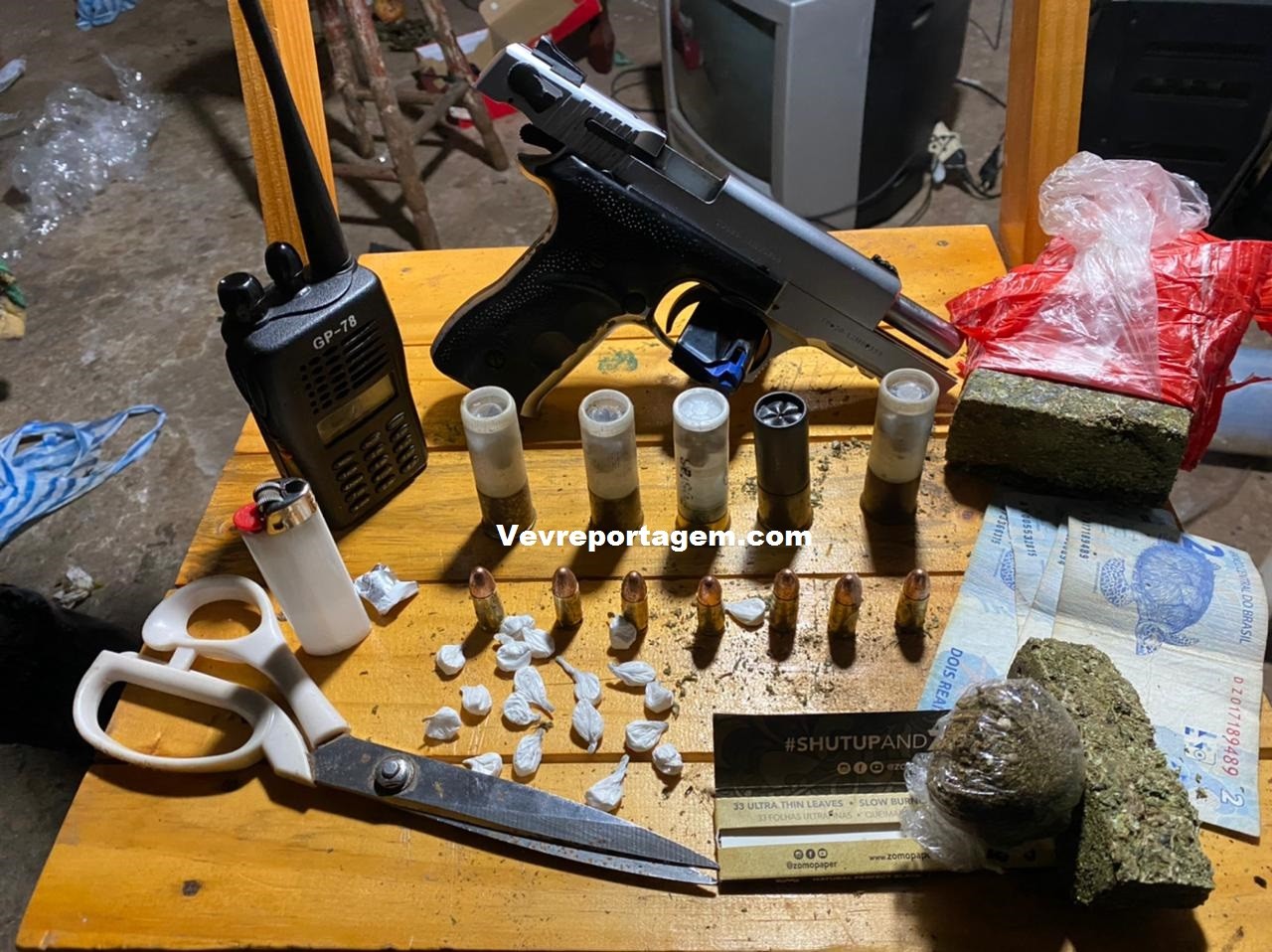 No interior da residencia foram localizados, tablete de maconha, cartuchos de espingarda calibre 12, buchas de cocaína, radio comunicador e uma pistola calibre 9mm com 7 munições intactas.
