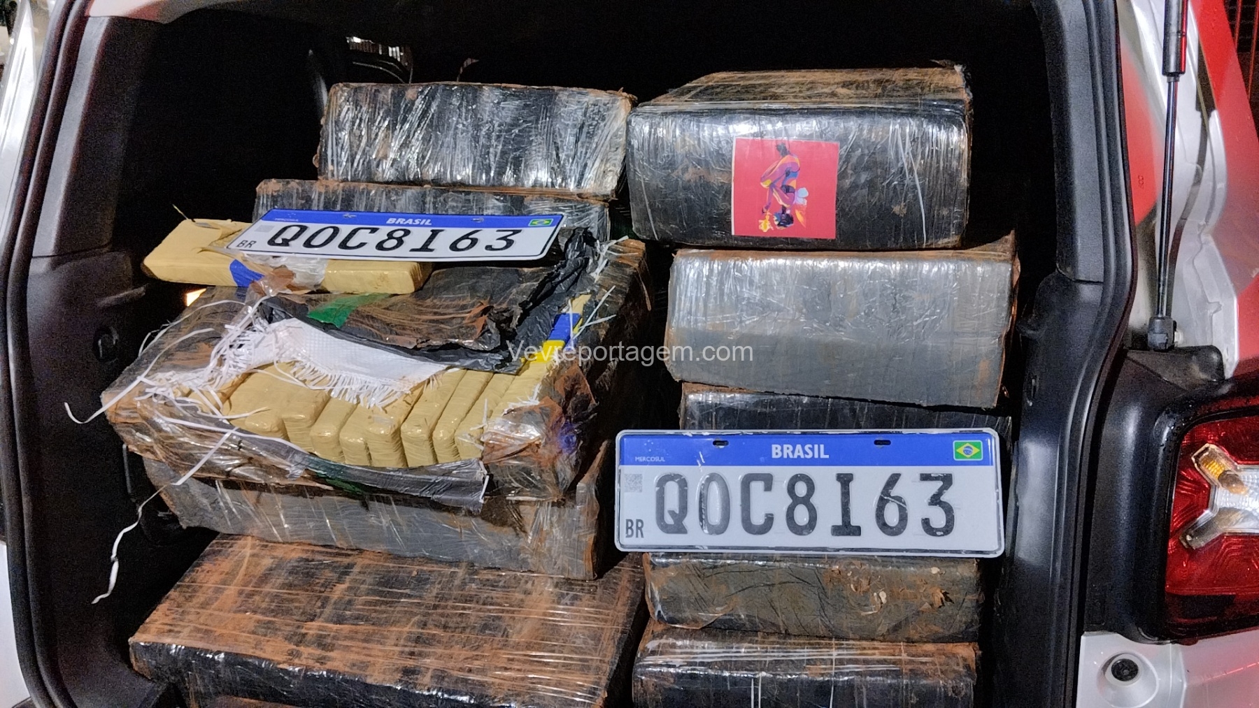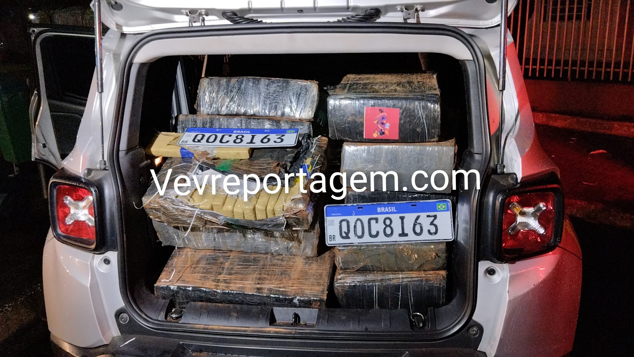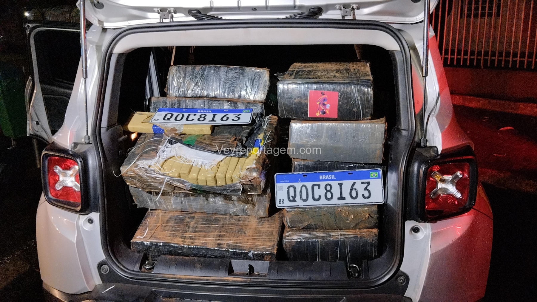Para averiguação, o vidro dianteiro direito do veículo foi quebrado. Após a abertura, foi confirmado que a carga se tratava, de fato, de tabletes de maconha, além de serem localizadas no interior do automóvel as placas originais QOC8I63, indicando adulteração do veículo.