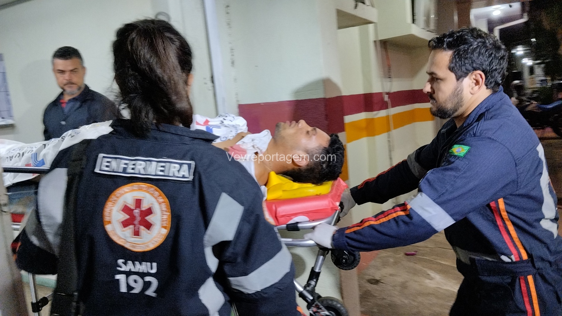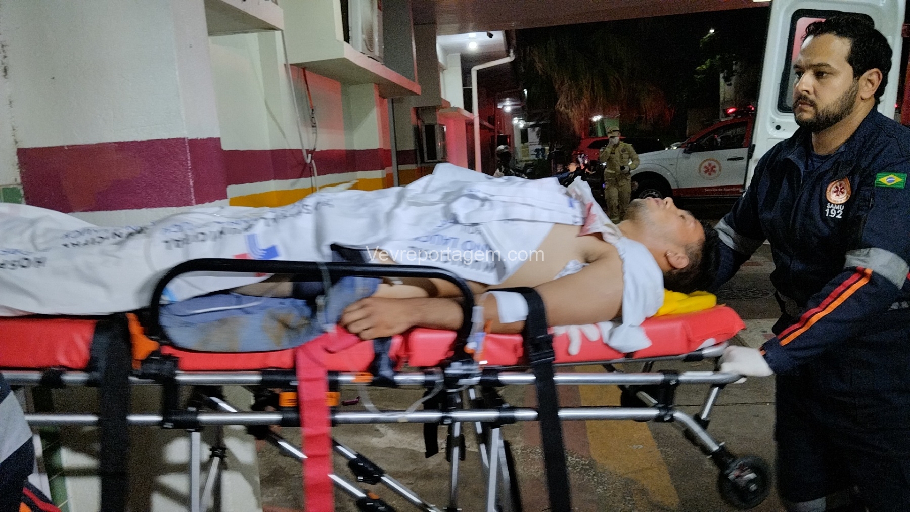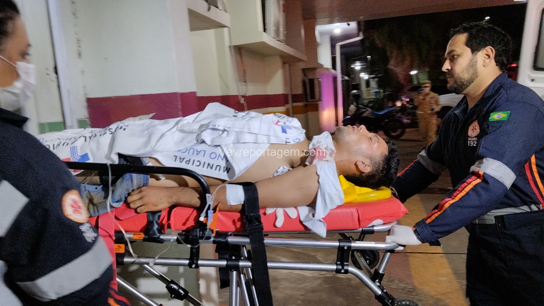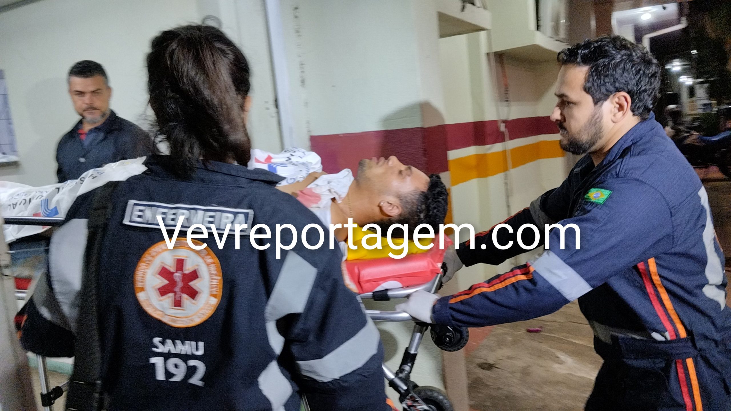 No local, as equipes constataram que um jovem havia sido alvejado, apresentando ferimentos na região do abdômen. A vítima foi rapidamente imobilizada e encaminhada para o interior da ambulância, onde recebeu atendimento do médico do SAMU.
