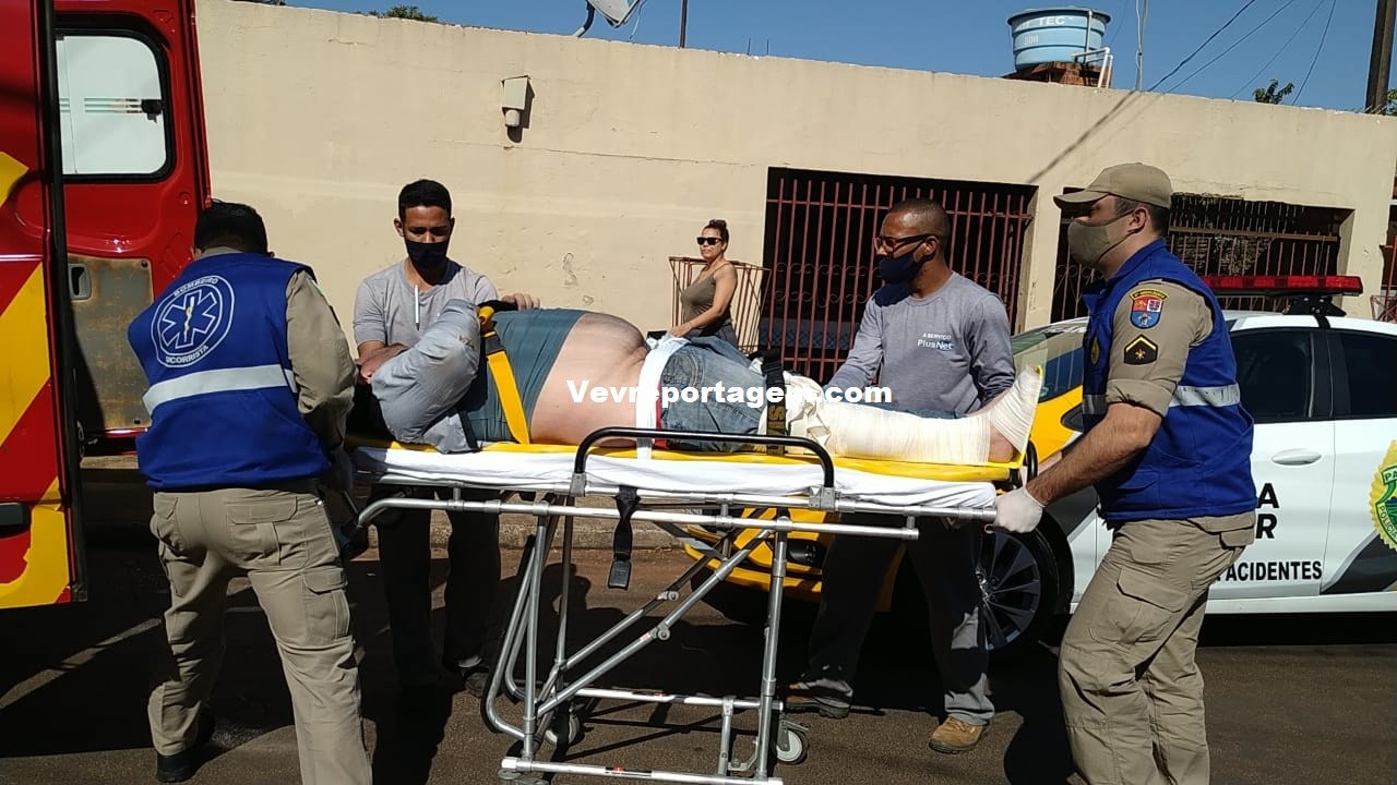 No local foi constatado a ocorrência, onde o motociclista estava em solo sentindo fortes dores na perna, após ser avaliado pelo socorristas foi constatado que o mesmo tinha uma fratura na perna direita.