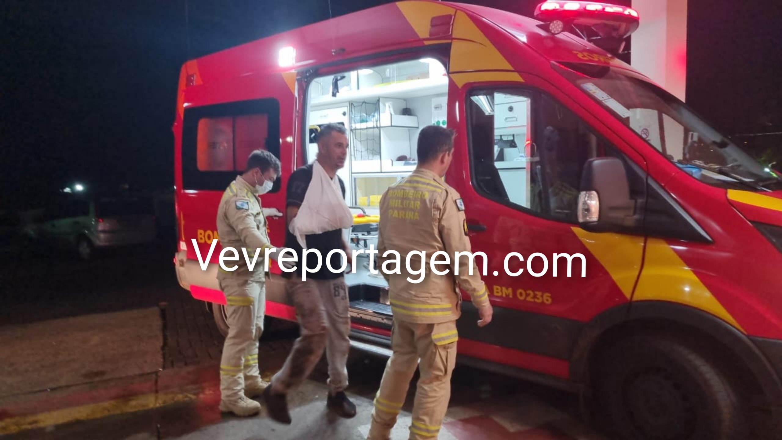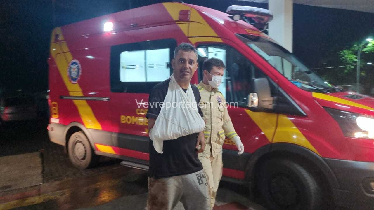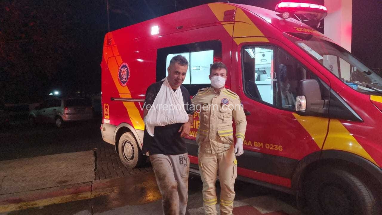 Ao chegarem ao local, encontraram o motociclista caído ao solo. Durante a avaliação, os socorristas constataram suspeita de fratura no braço da vítima. O homem foi imobilizado e encaminhado, andando, para o interior da ambulância, onde recebeu atendimento inicial.