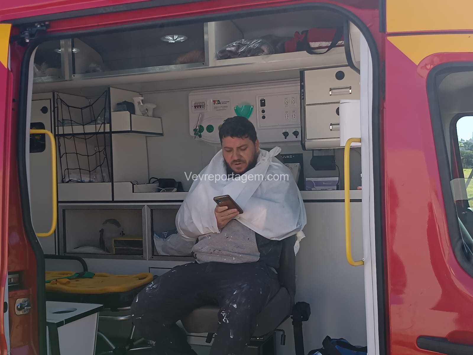 No local, foi constatada a colisão entre uma motocicleta e um automóvel. O motociclista, um homem de 36 anos, estava caído ao solo e se queixava de fortes dores pelo corpo. Ele foi imobilizado, colocado em uma maca e encaminhado à ambulância para uma avaliação mais detalhada.