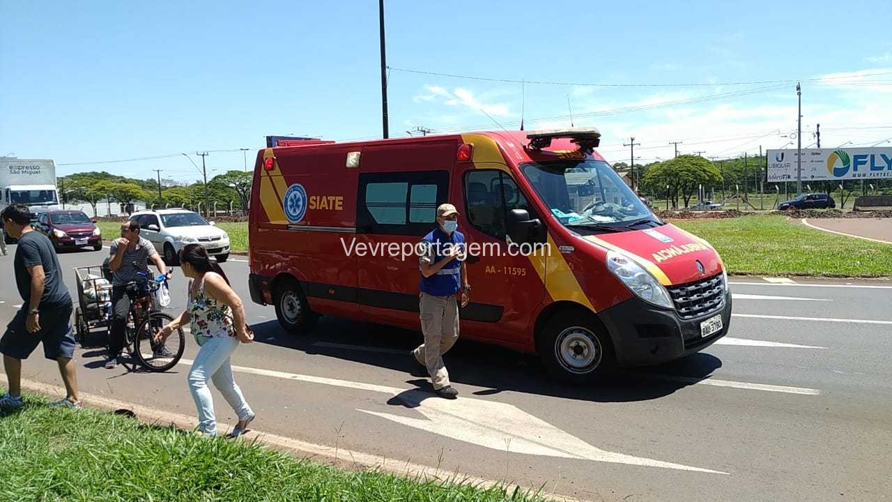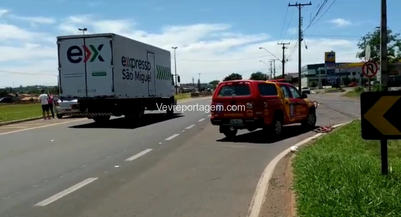 Os socorristas do Siate e apoio médico, foram acionados para deslocarem até a BR-277, na antiga rotatória do CTG Charrua, para darem atendimento a um acidente de trânsito, envolvendo uma motocicleta e um automóvel. Segundo o que foi repassado para os bombeiros que o motociclista teve uma fratura exposta na perna direita.