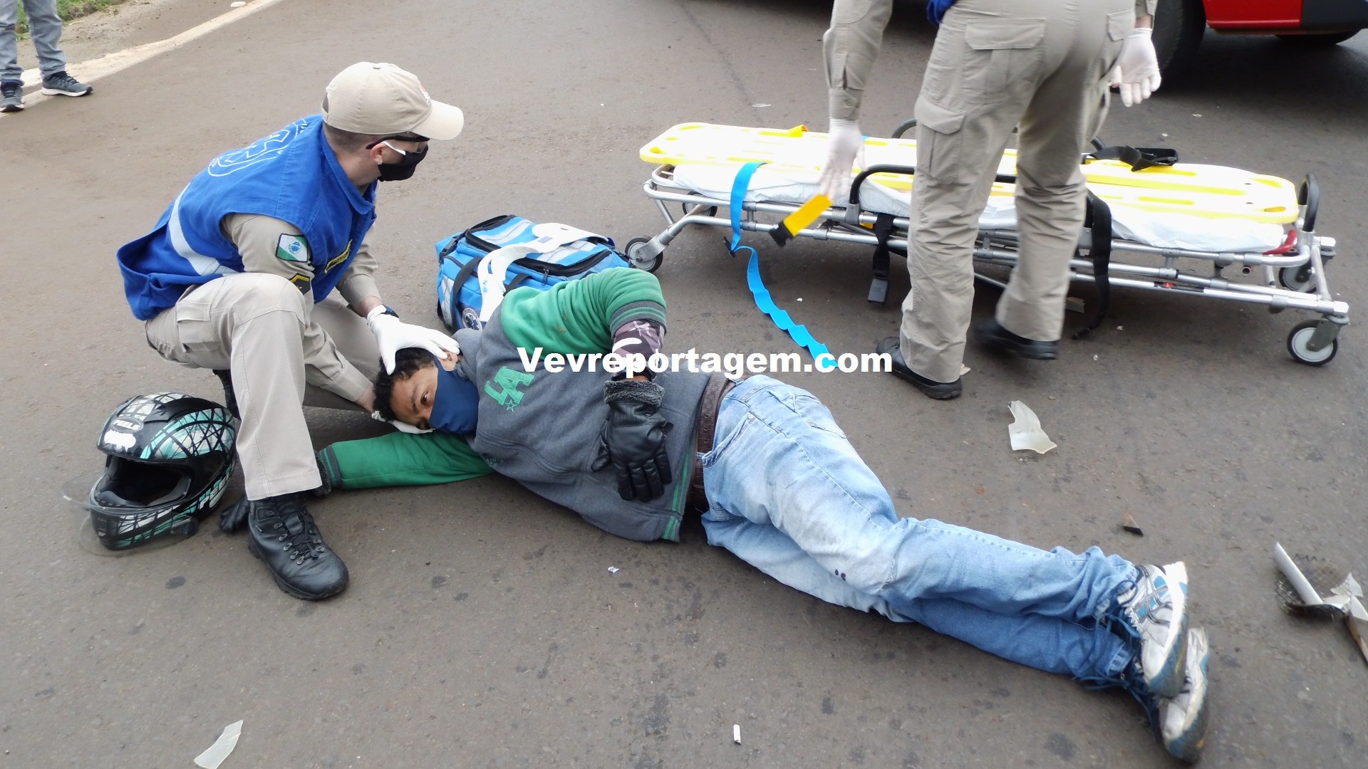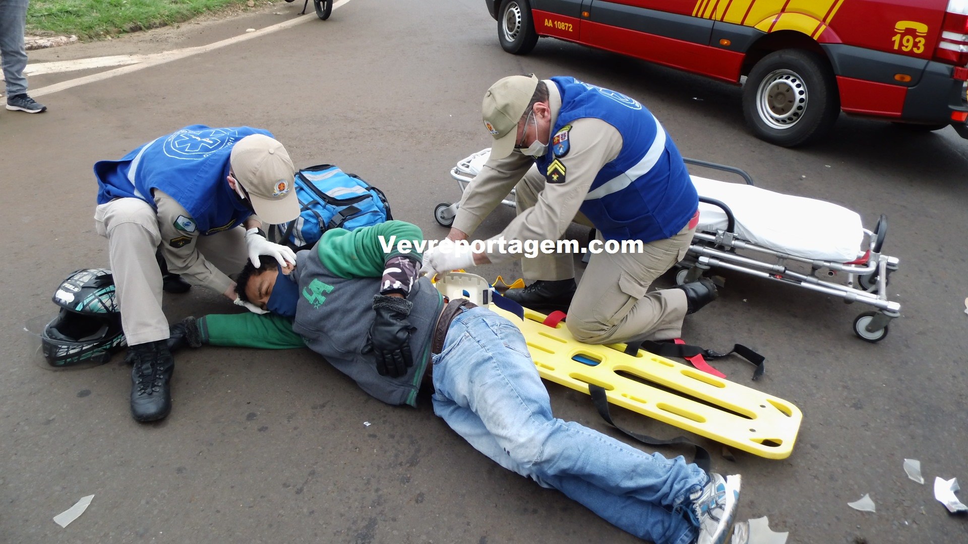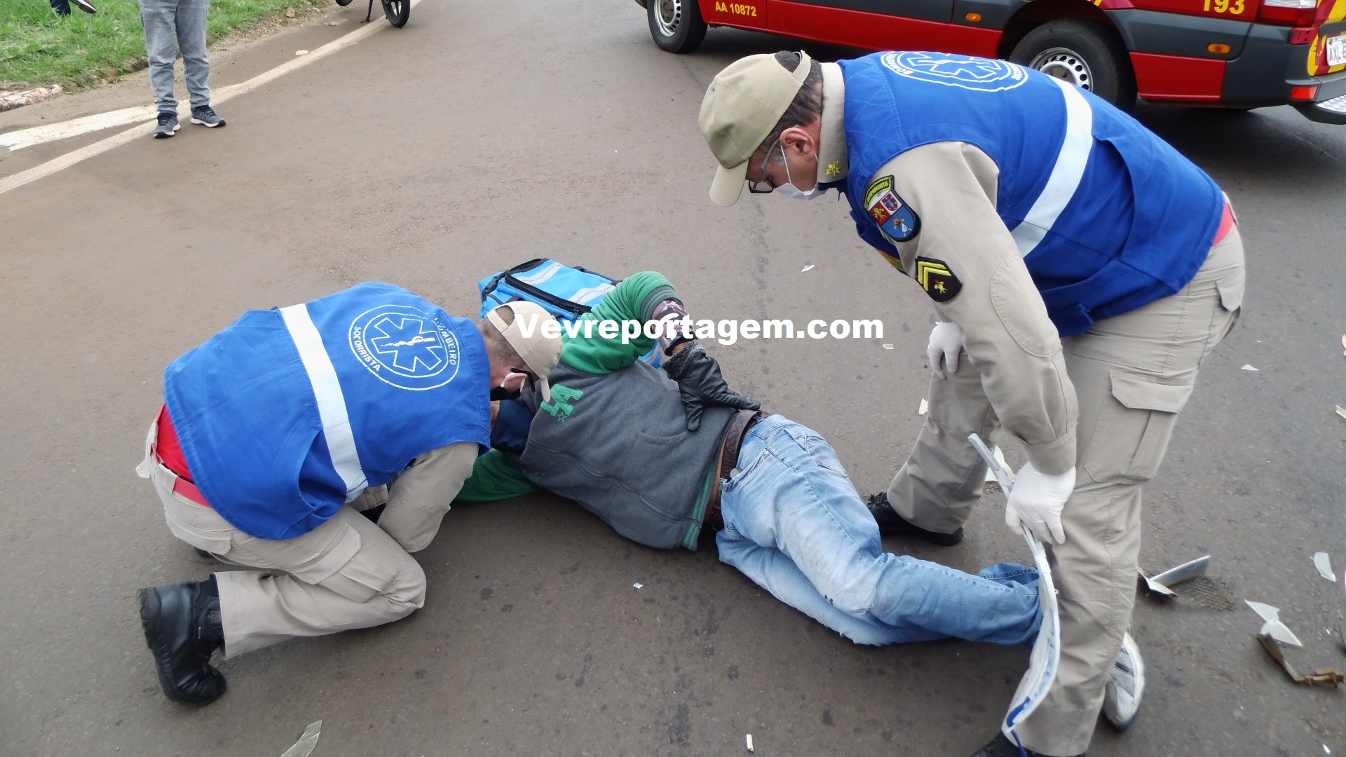 No local, foi constatado a ocorrência e socorristas avaliaram uma vítima que sentia fortes dores nas costas e tinha algumas escoriações pelo corpo. rapidamente o motociclista foi imobilizado colocado na maca encaminhado para o interior da ambulância para melhor ser avaliado pelos socorristas.