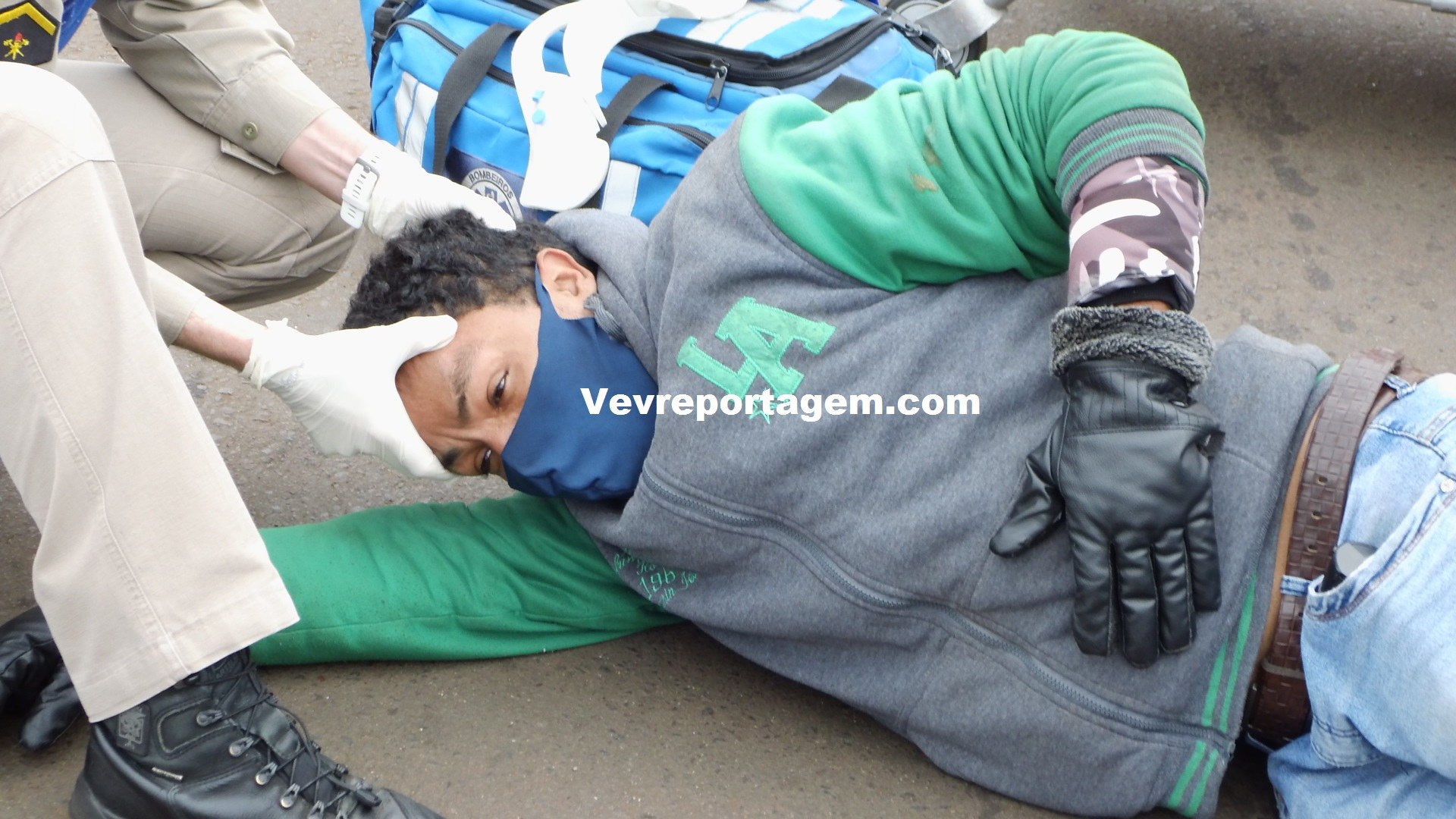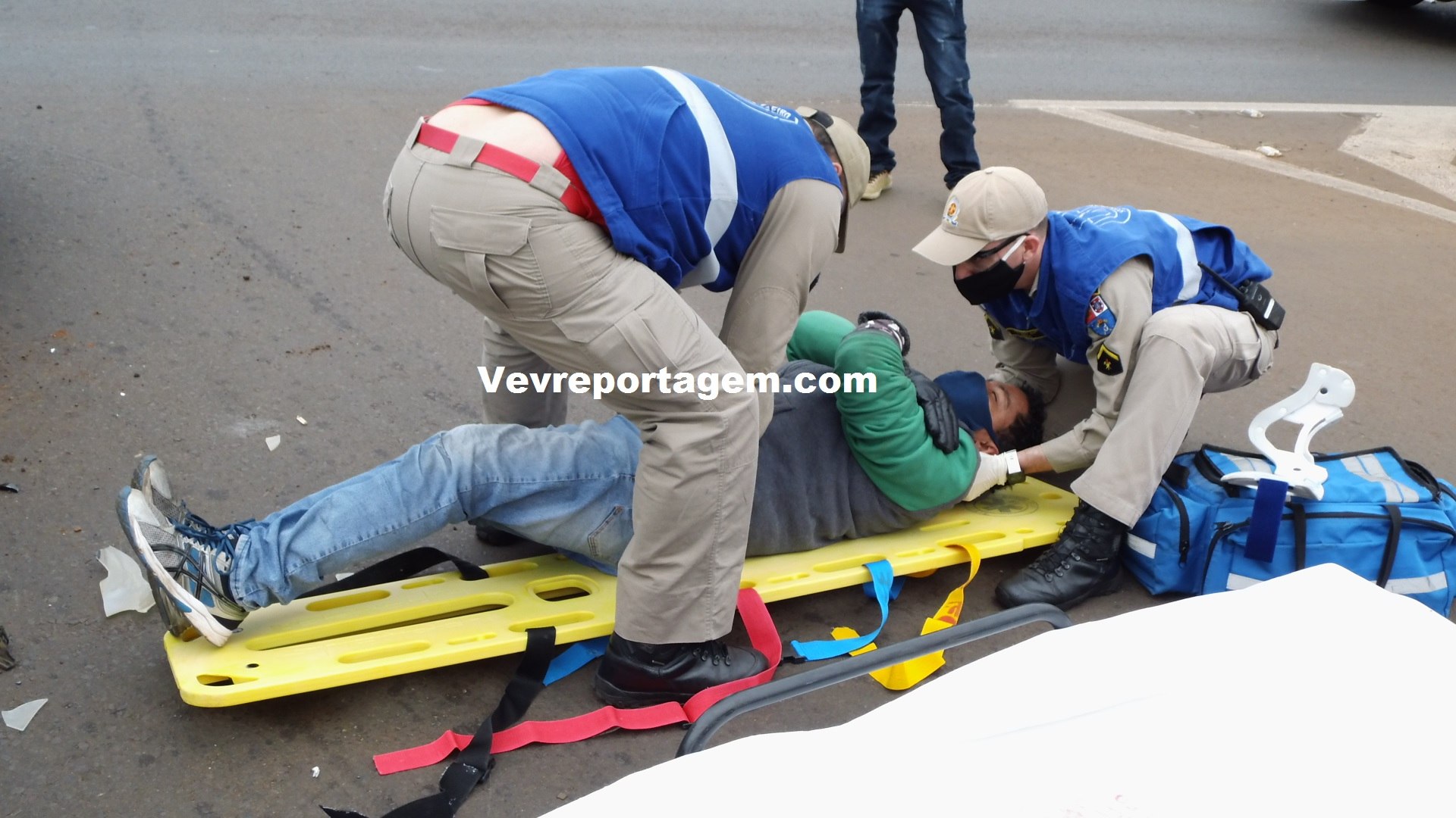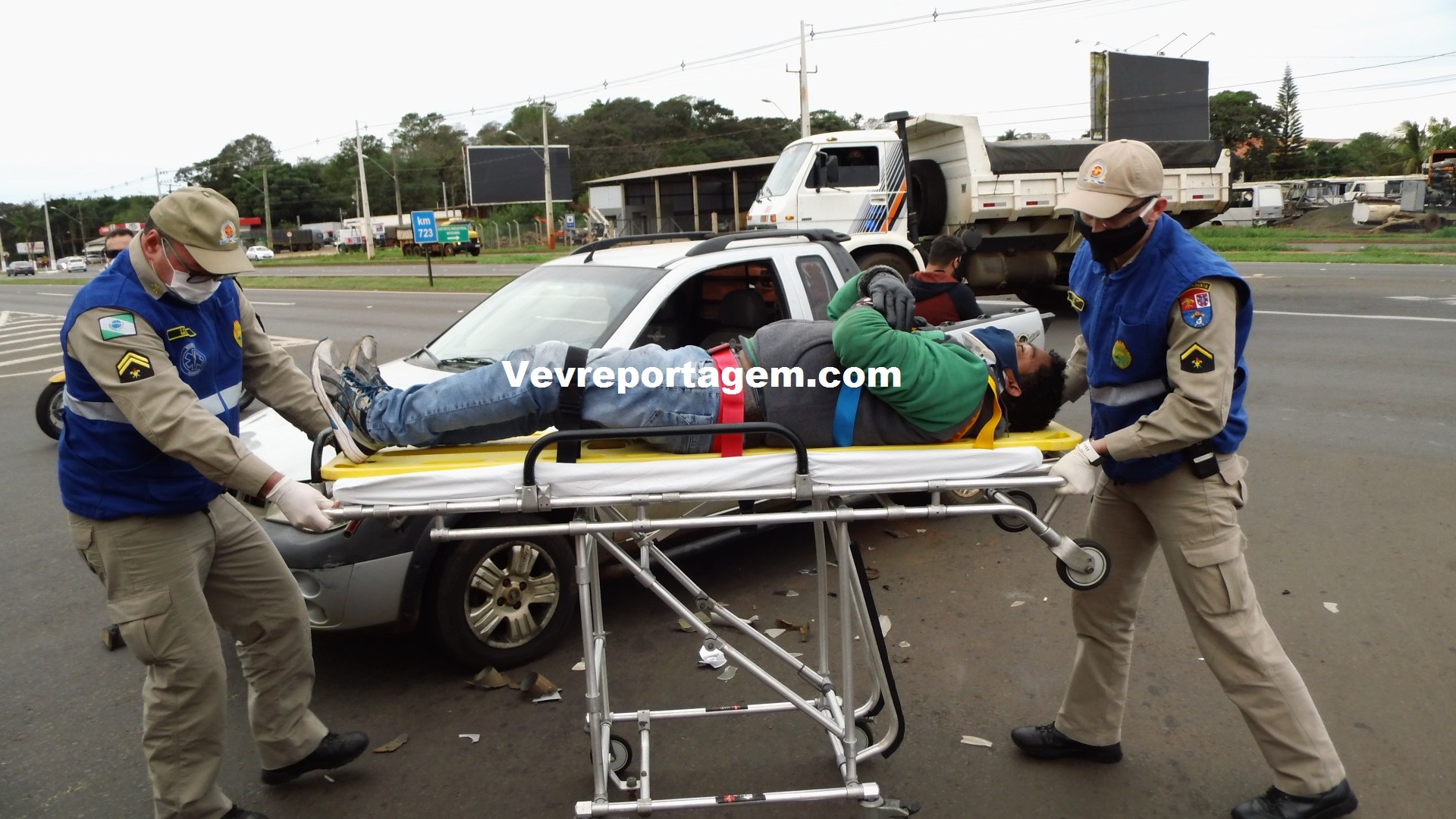 No local, foi constatado a ocorrência e socorristas avaliaram uma vítima que sentia fortes dores nas costas e tinha algumas escoriações pelo corpo. rapidamente o motociclista foi imobilizado colocado na maca encaminhado para o interior da ambulância para melhor ser avaliado pelos socorristas.