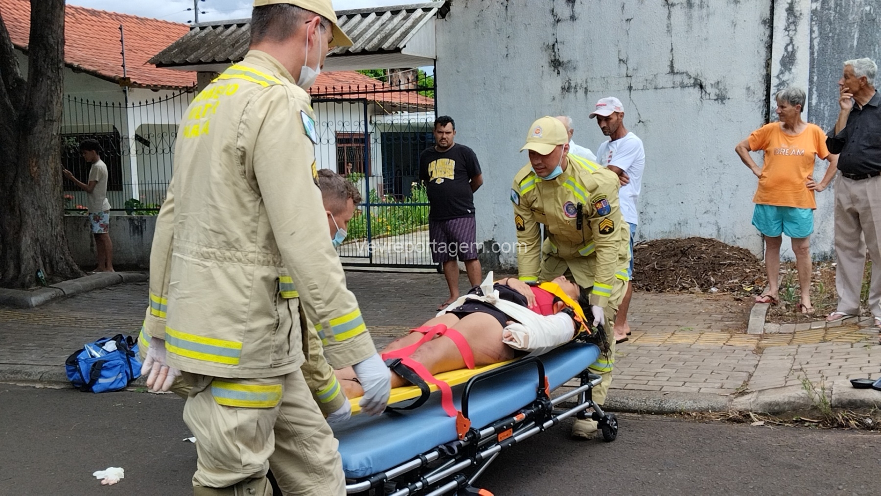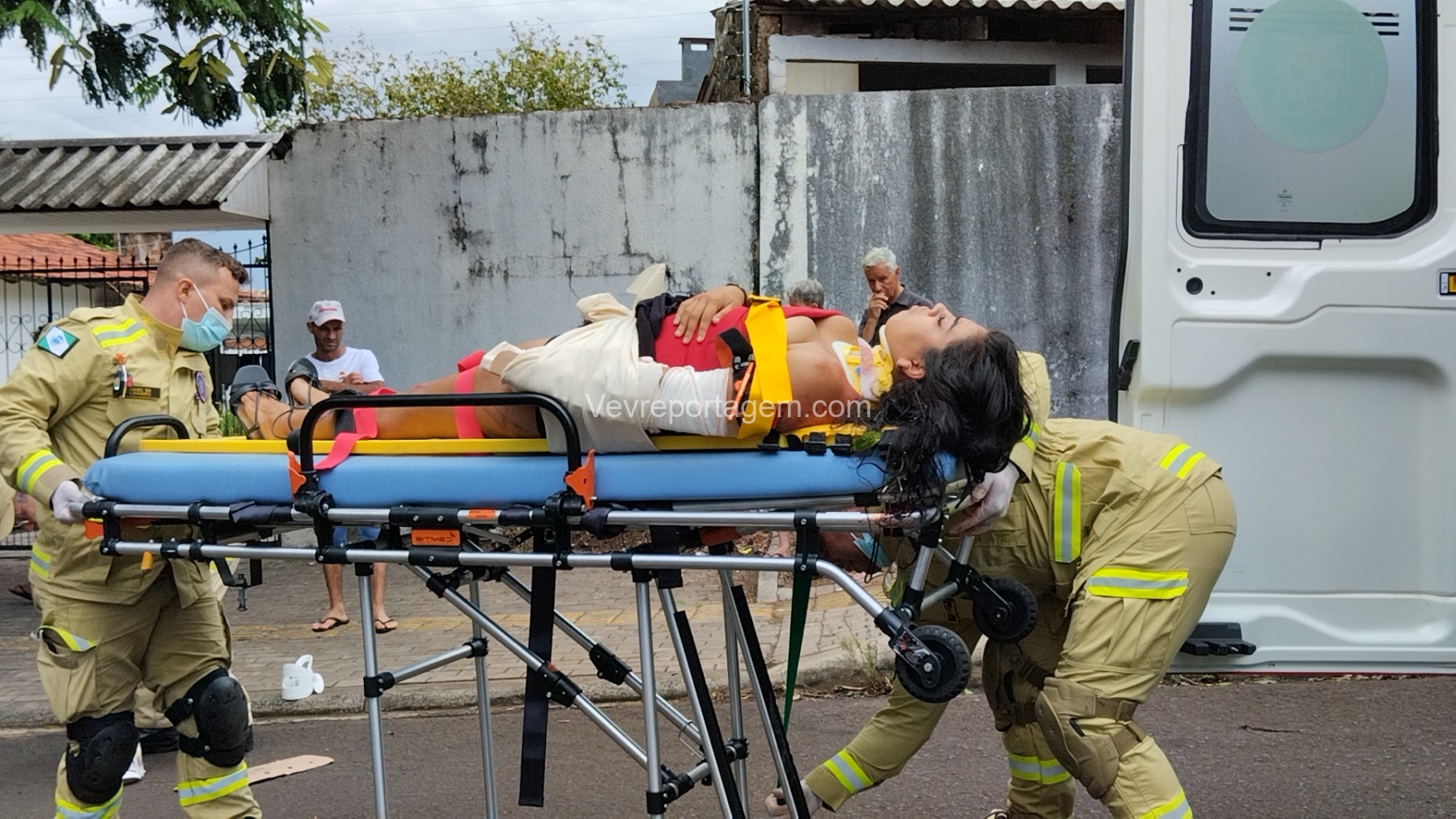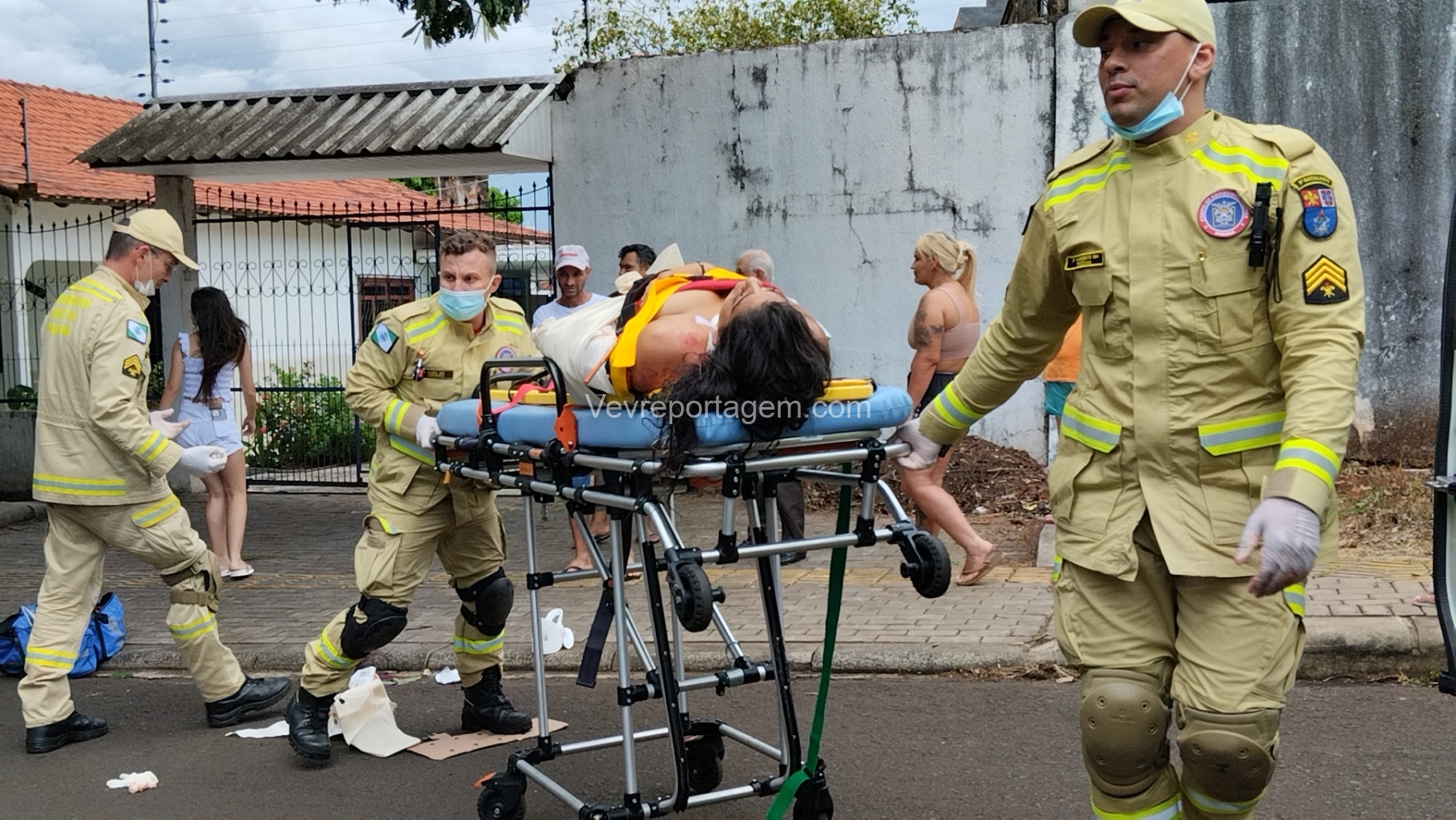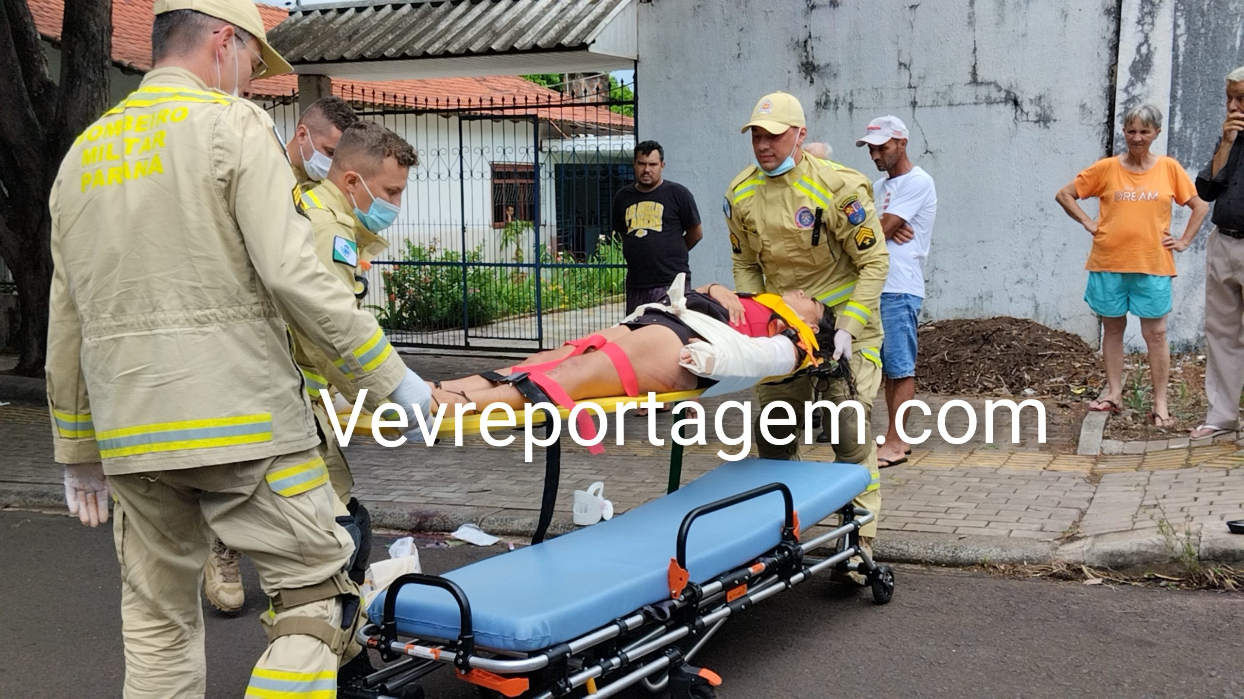 Ao chegarem, as equipes constataram que uma vítima do sexo feminino estava caída ao solo, apresentando múltiplas fraturas no braço esquerdo, sendo uma delas fratura exposta, com intenso sangramento.