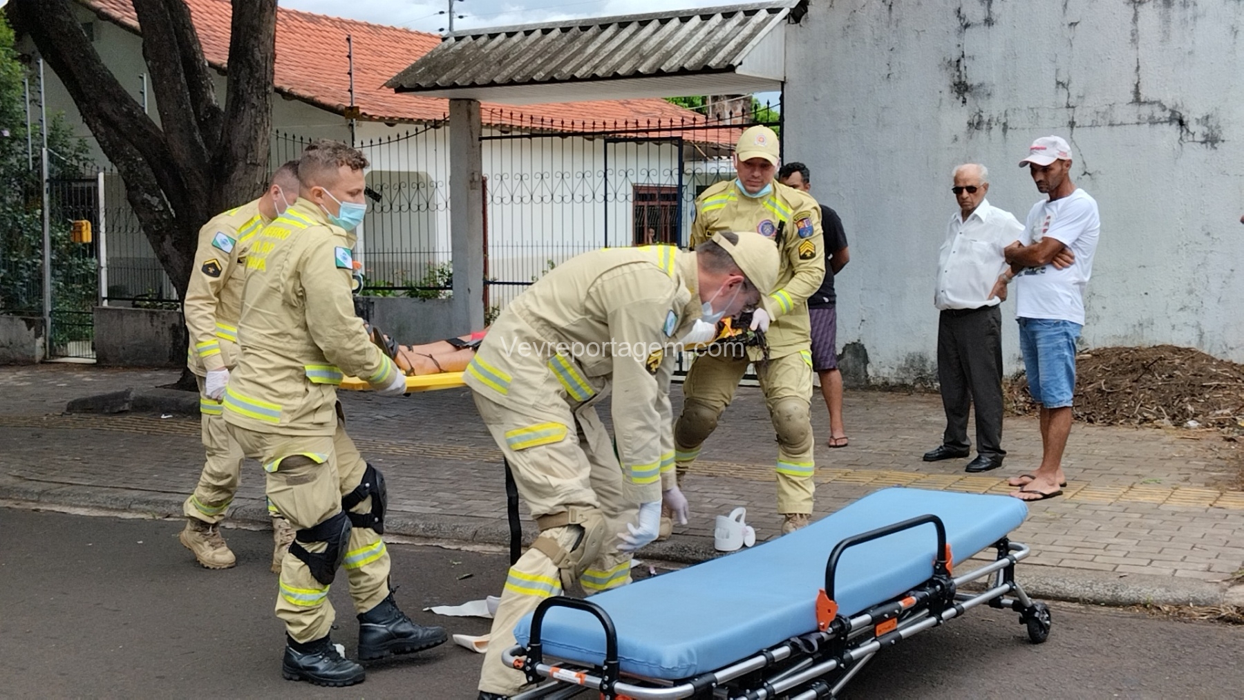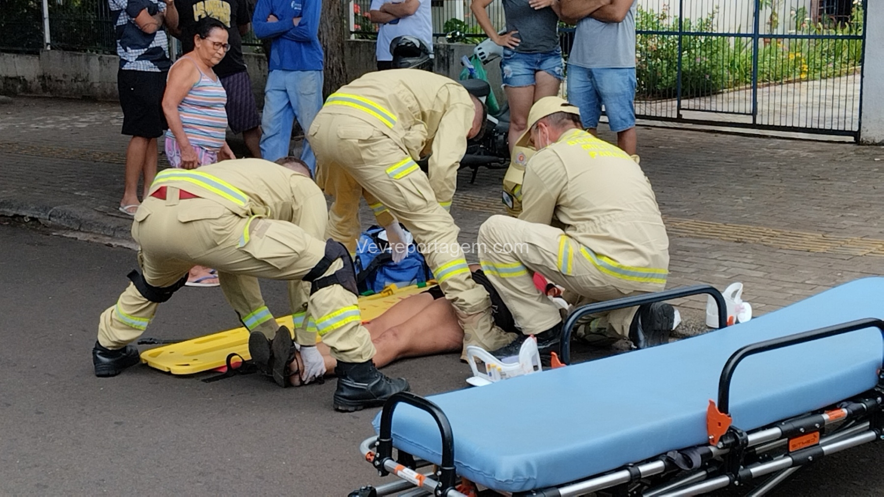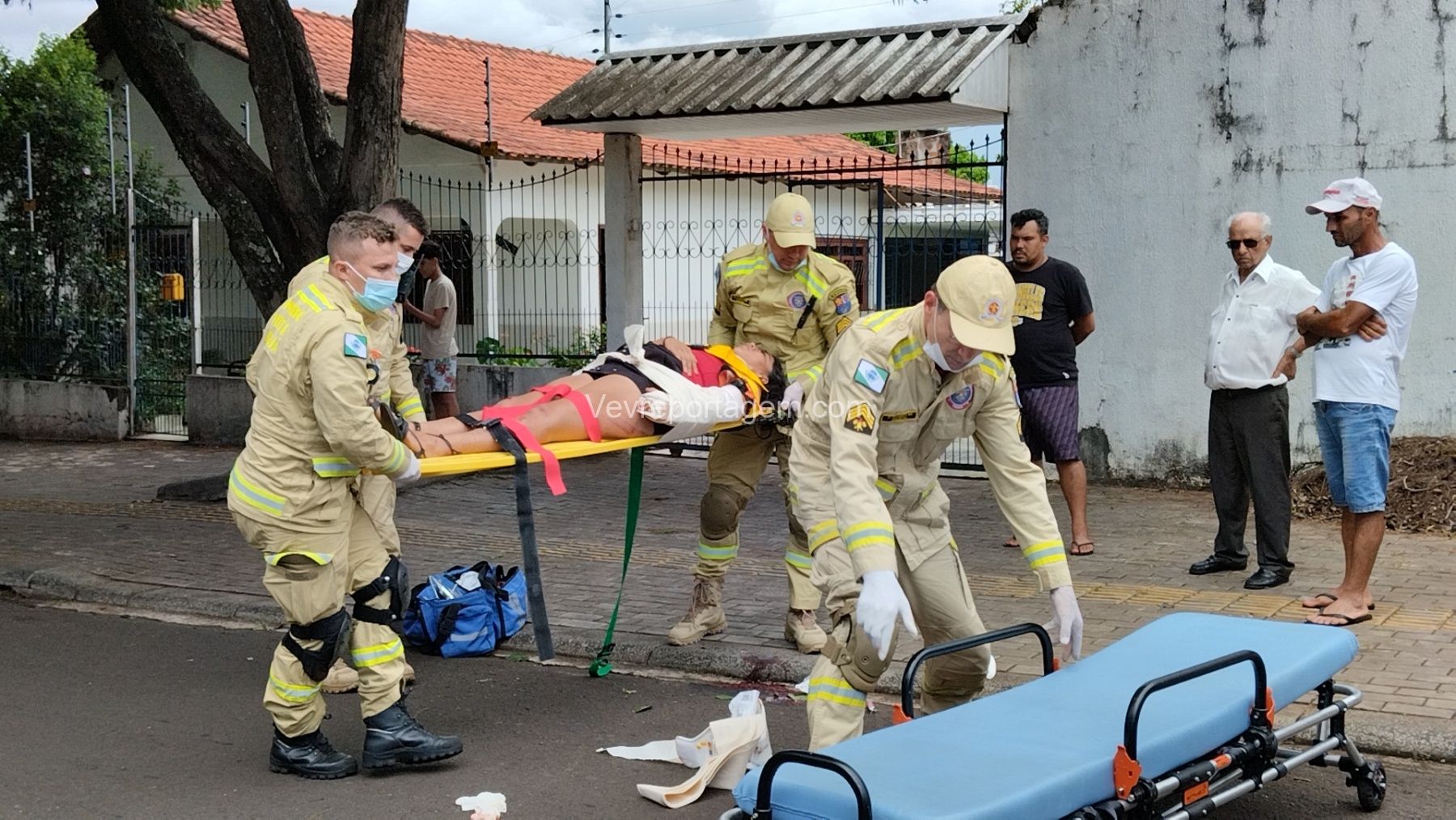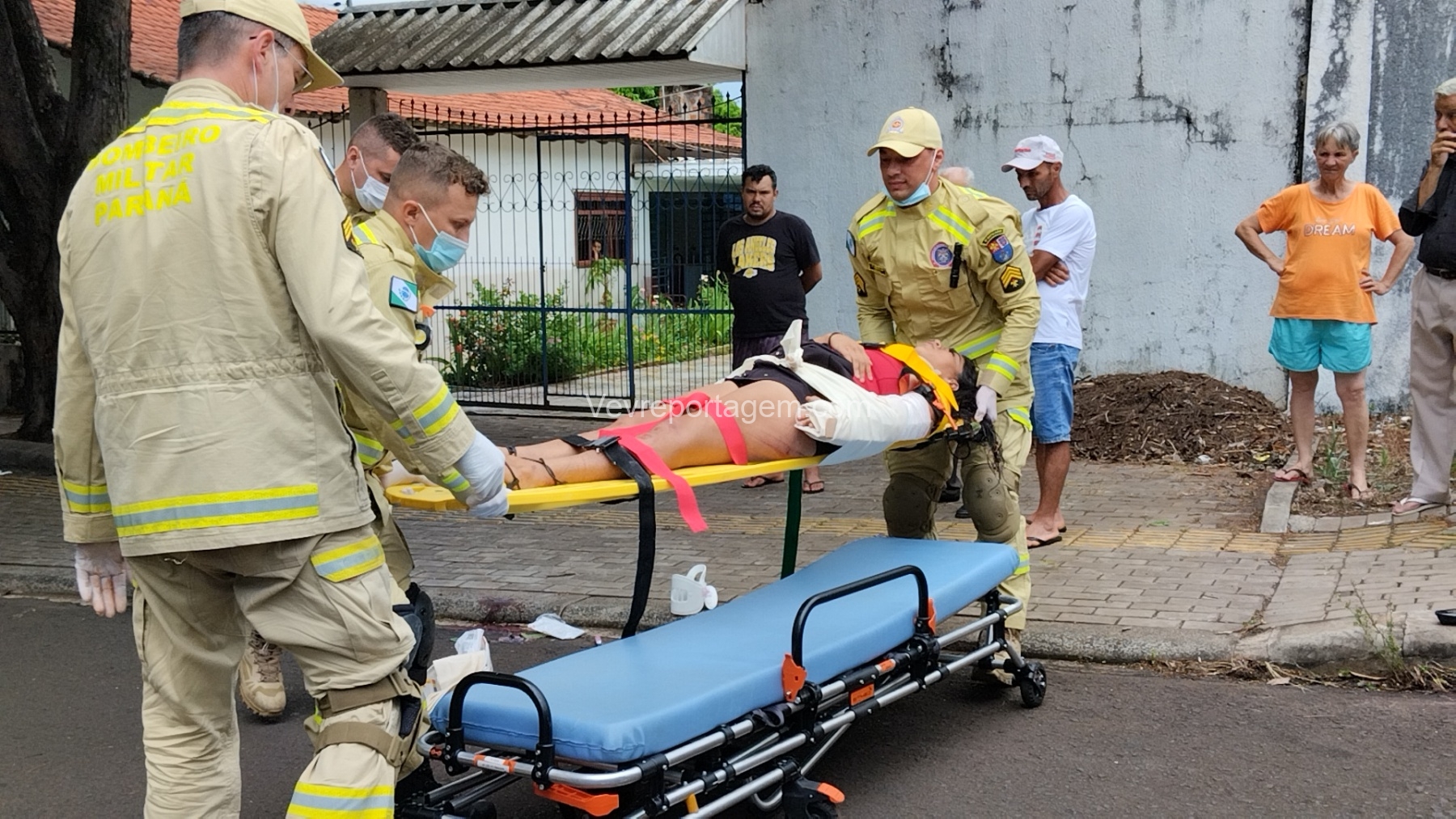 Ao chegarem, as equipes constataram que uma vítima do sexo feminino estava caída ao solo, apresentando múltiplas fraturas no braço esquerdo, sendo uma delas fratura exposta, com intenso sangramento.