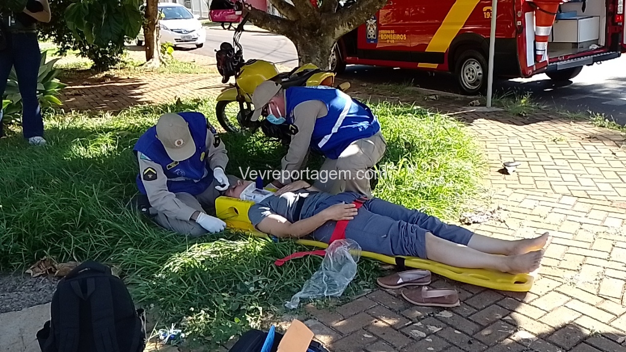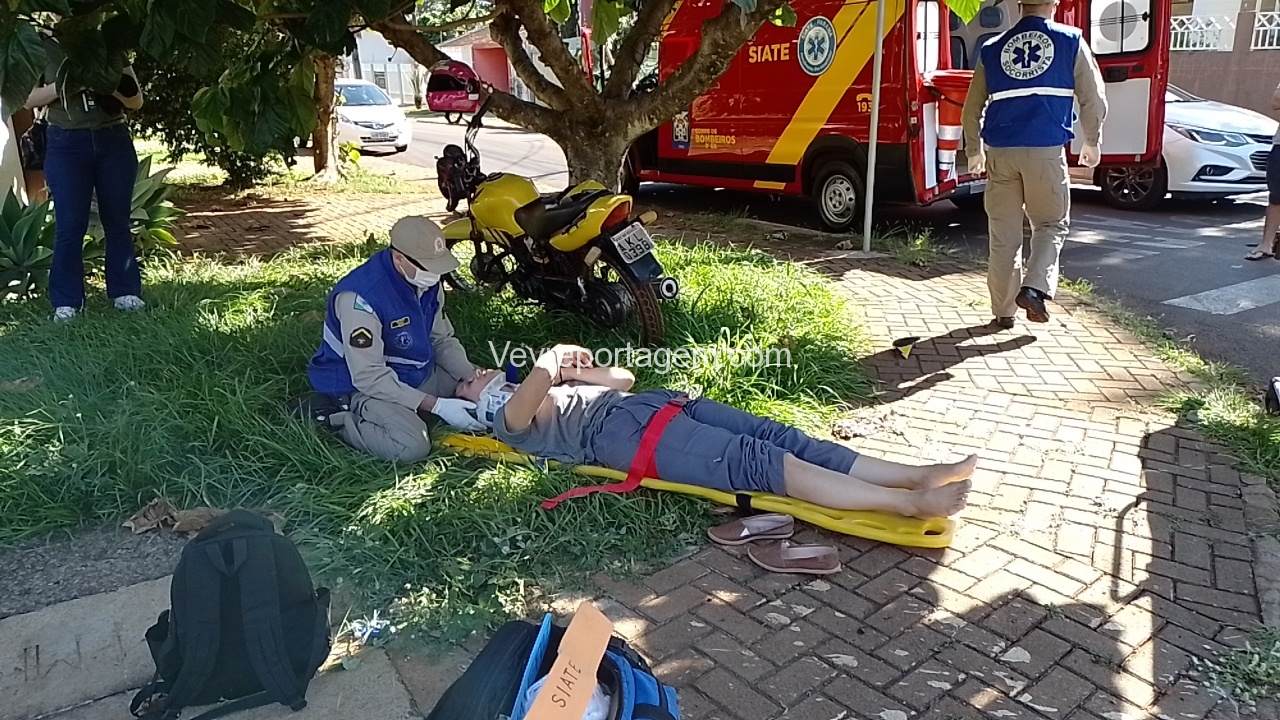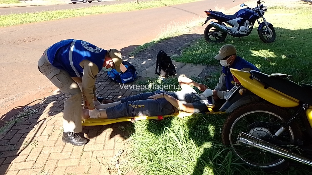 No local, os socorristas constataram a ocorrência, onde uma motociclista estava ferida em solo com diversas escoriações e sentia muita dor pelo corpo. Rapidamente a mesma foi imobilizada colocada na maca e encaminhada para o interior da ambulância para melhor ser avaliada. Já a motorista do automóvel nada sofreu.